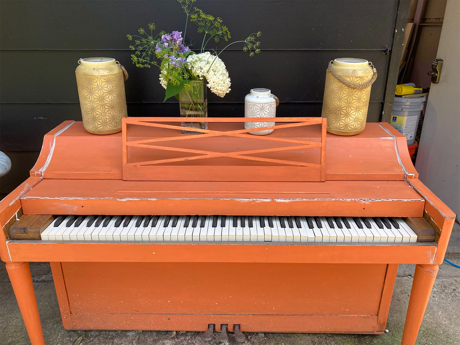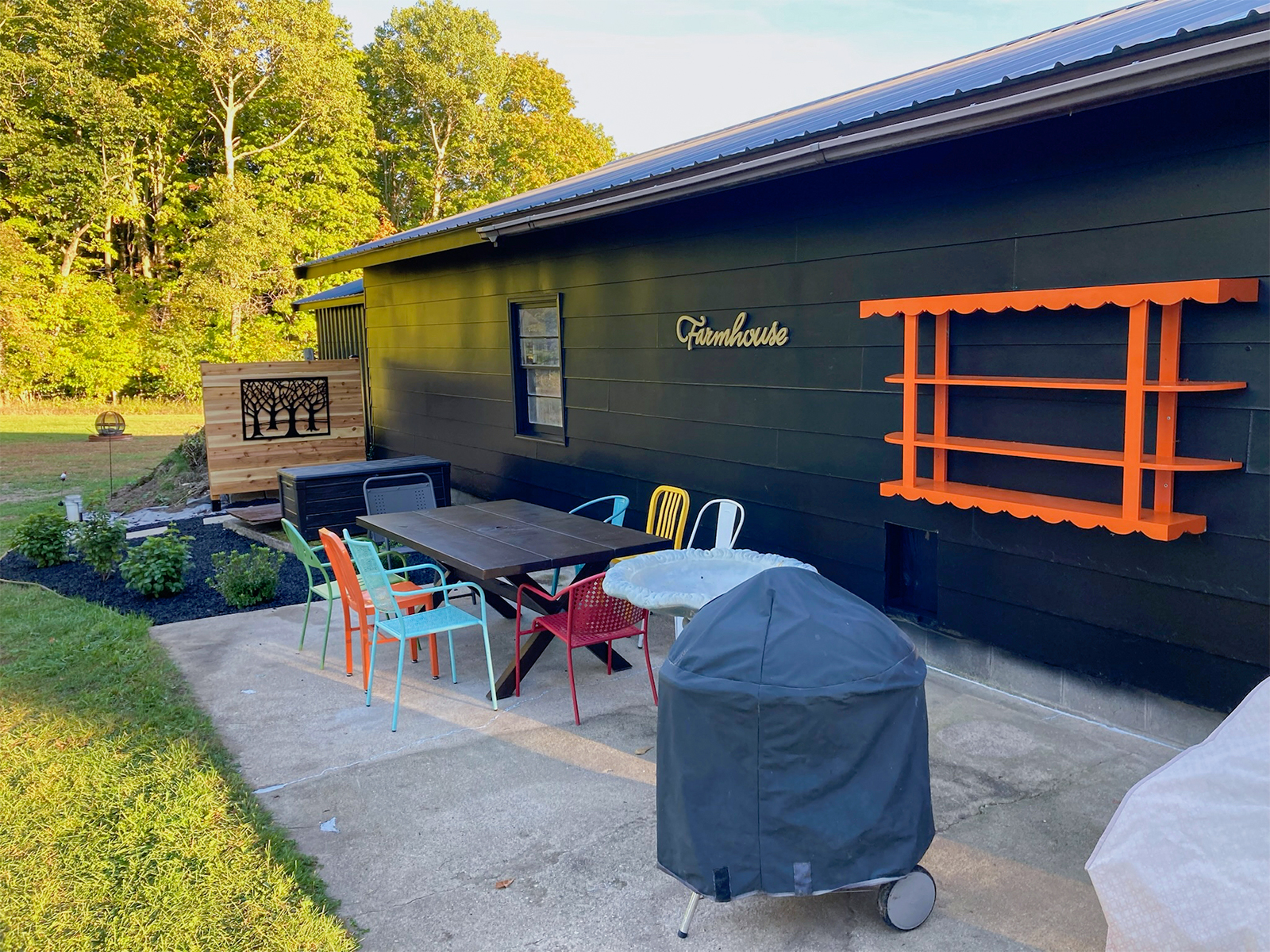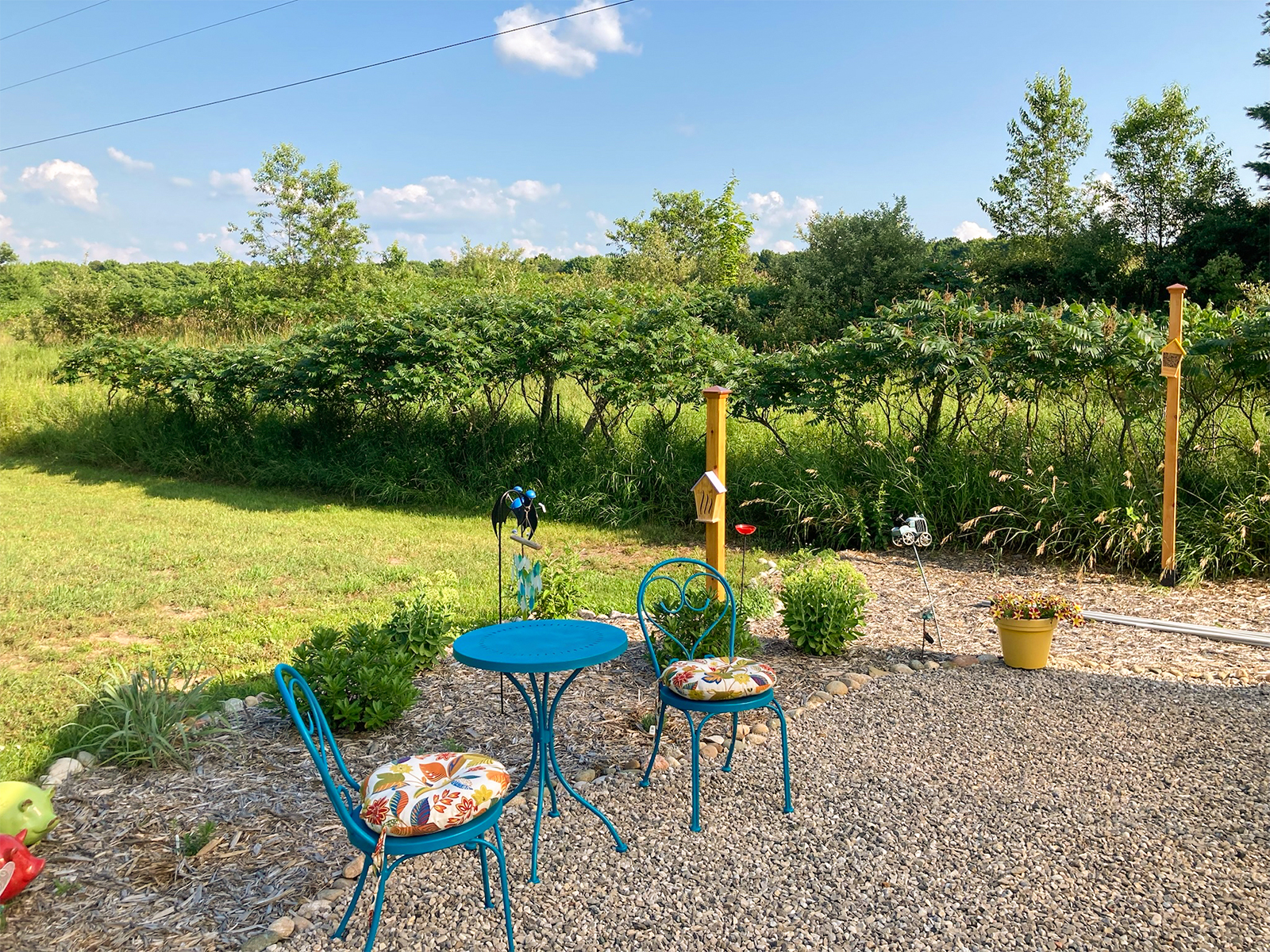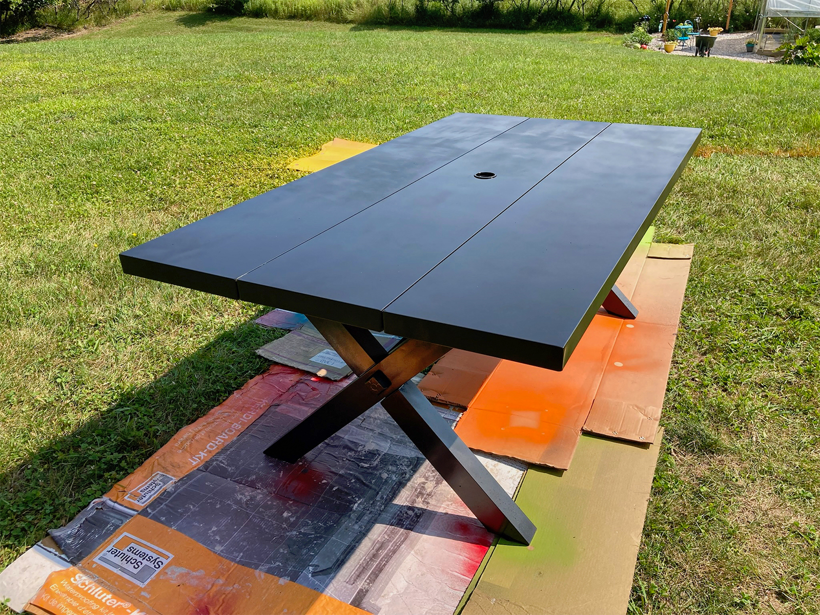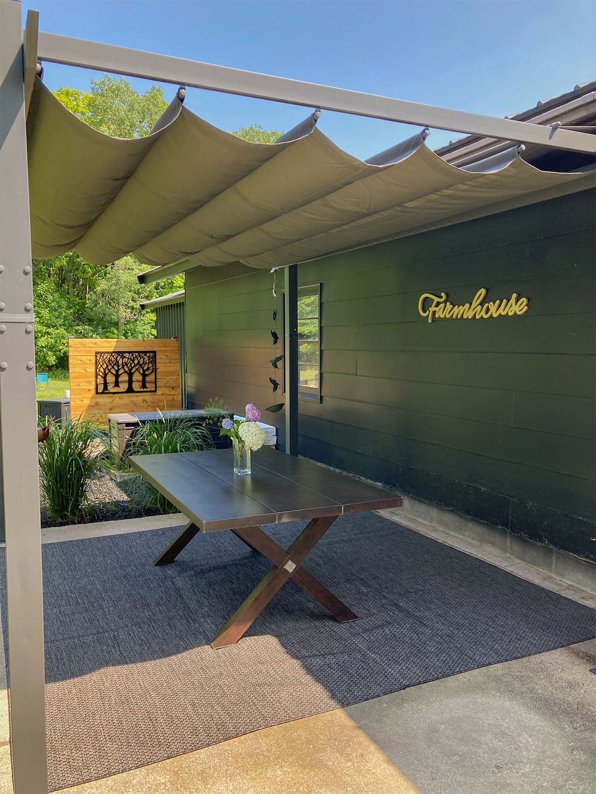 We purchased a pergola from Wayfair, and repainted the table and chairs for a usable outdoor dining space sheltered from the sun.