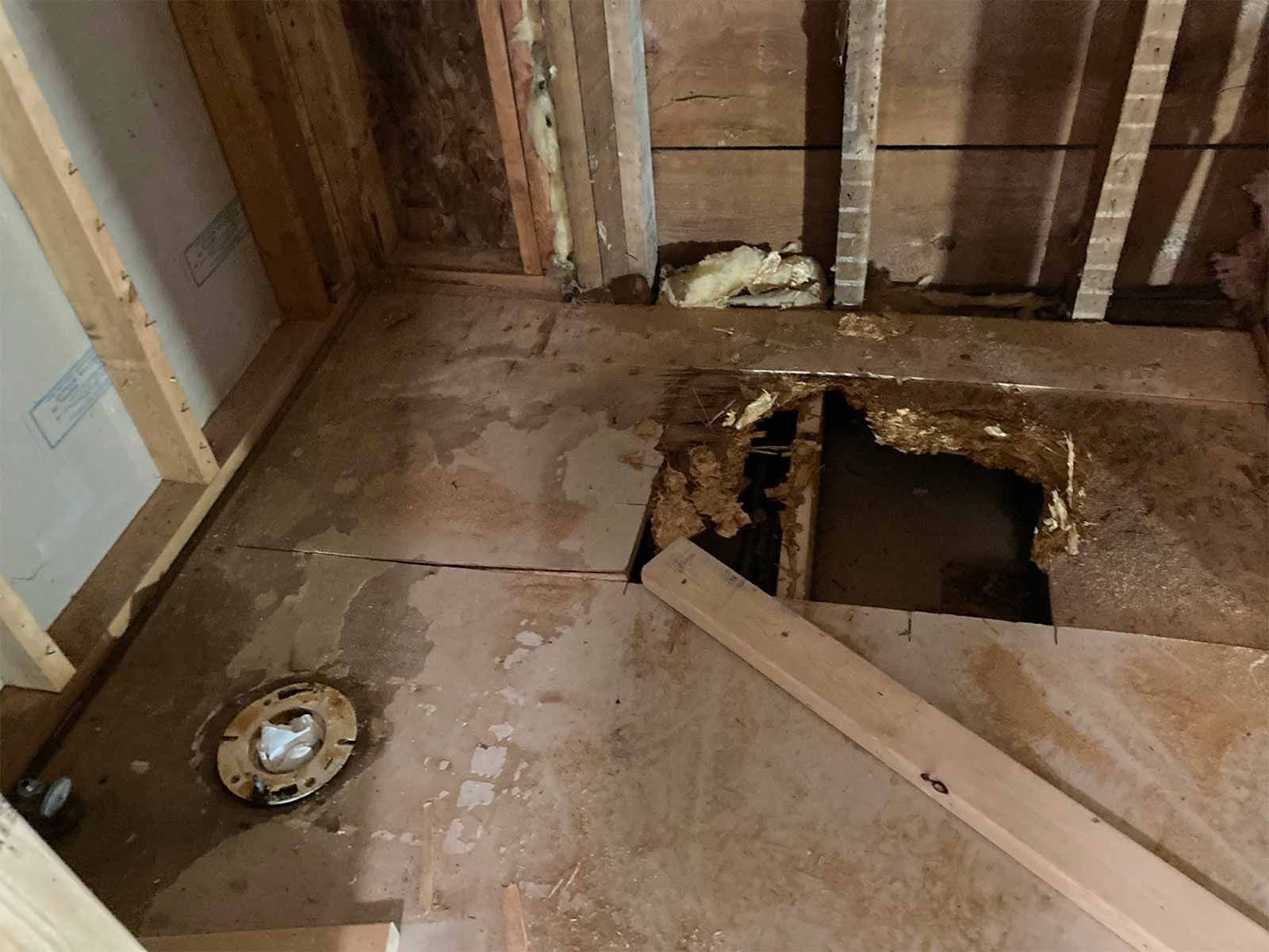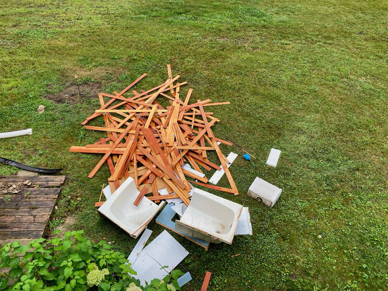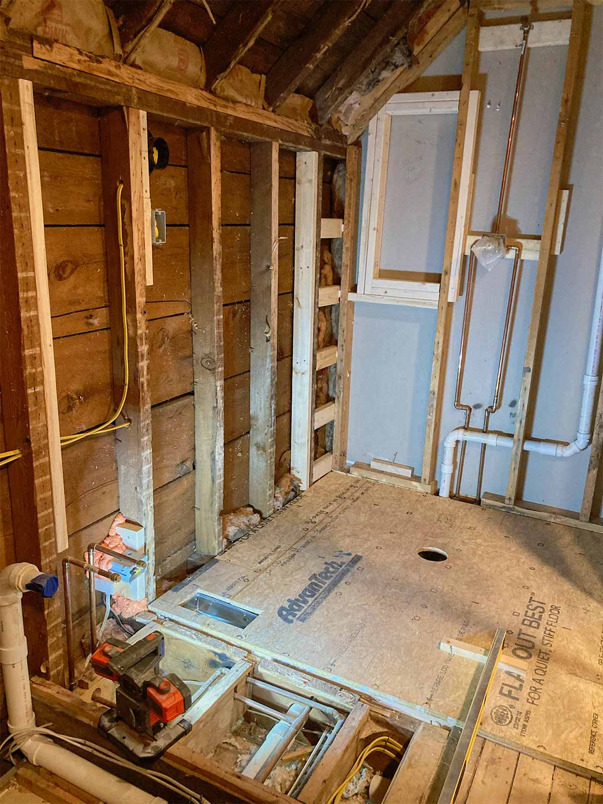 We began by getting rid of the old sink and tub, and all the wood tongue and groove. Last, was the removal of the toilet. We had fun throwing the materials out the bedroom window. We also removed all the old insulation (mostly water damaged).