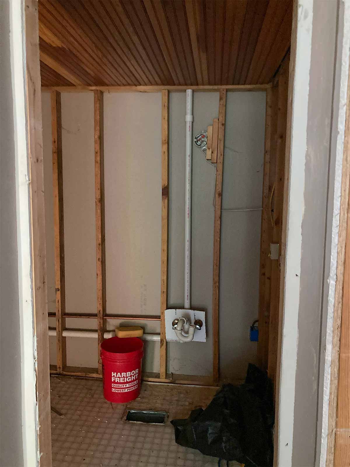 We placed an order with The Home Depot for tile, toilet, exhaust fan, and Schluter system products for tiling/waterproofing. We called a plumber to have the pipes relocated.