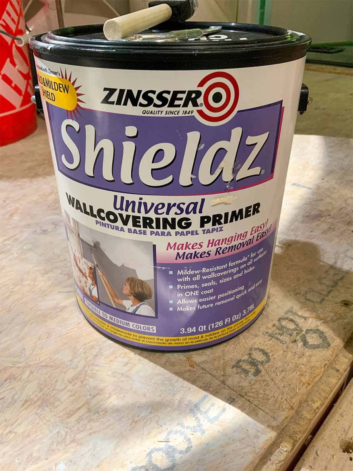 First, we used a primer specifically for wall coverings, since we would be installing wallpaper in the bathroom. It has a built in mold and mildew preventative.