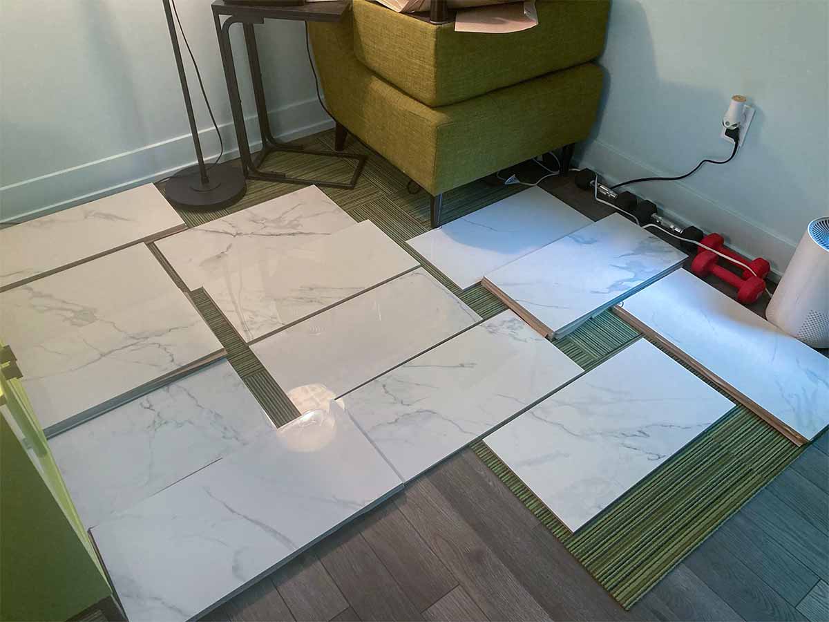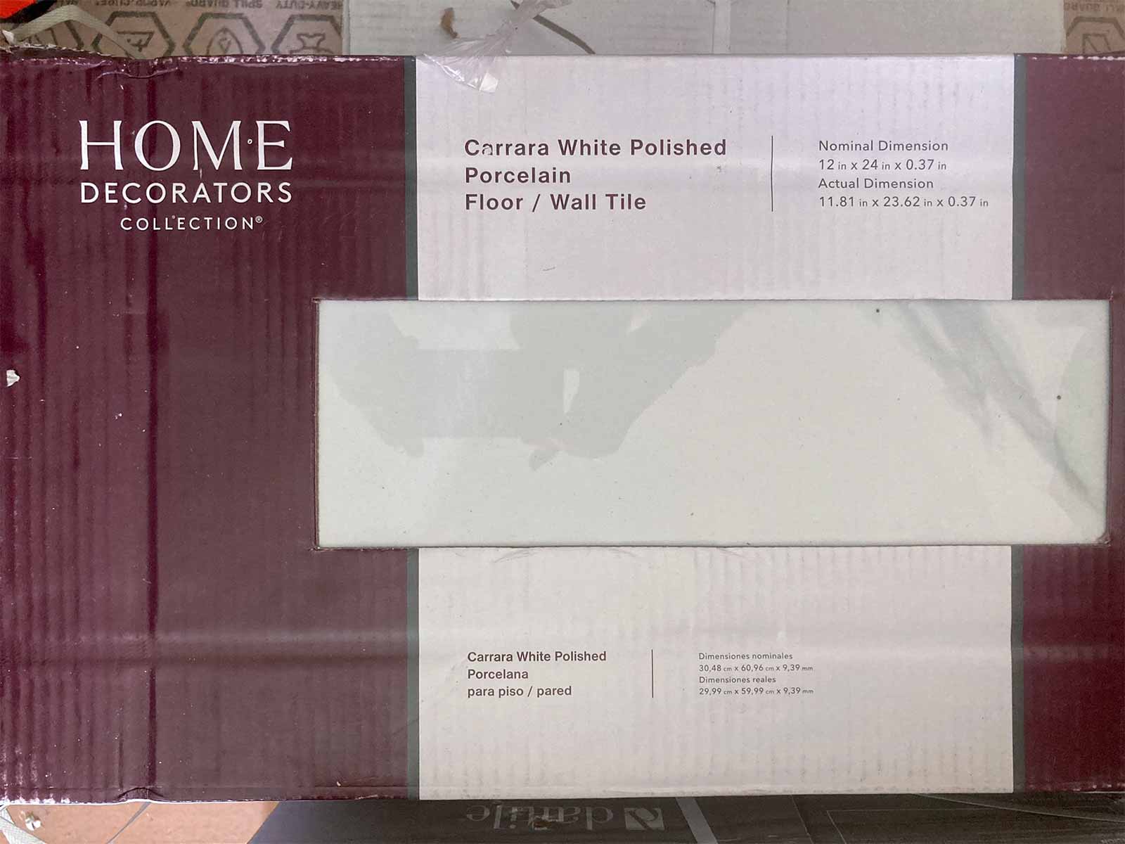 - Floor tile: purchased from The Home Depot, Home Decorators Collection Carrara White Polished Porcelain