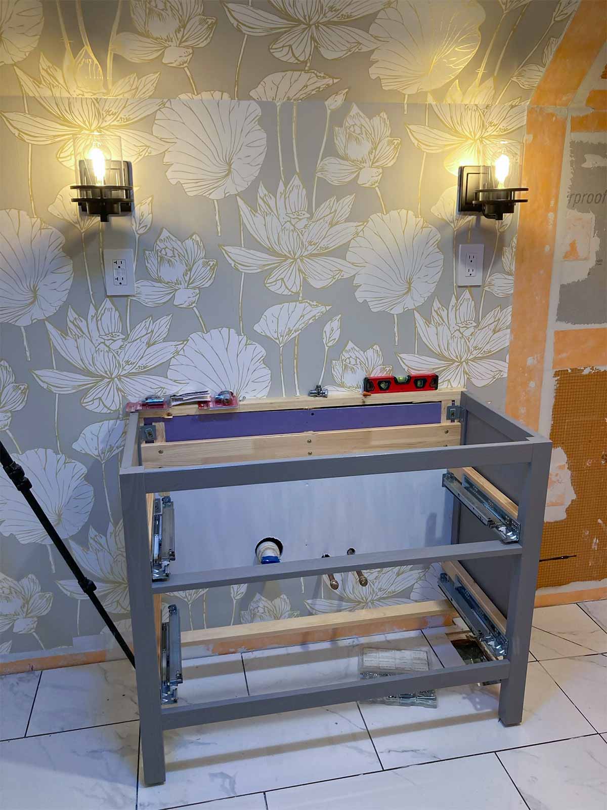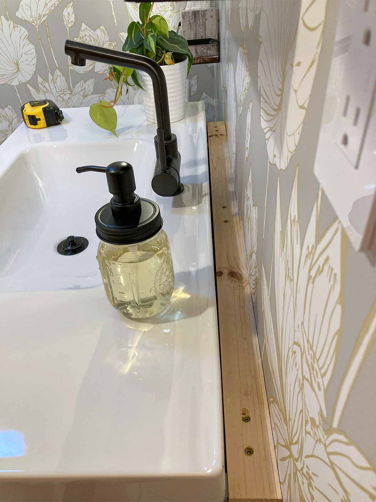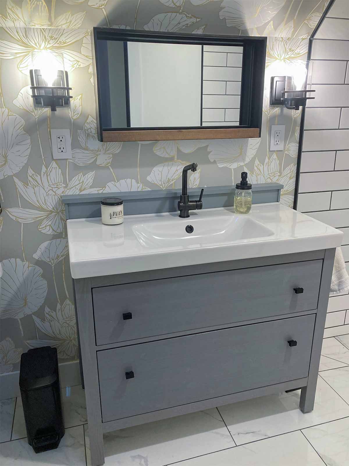 The plumbing for the vanity was inset into the room to fit insulation behind the pipes, since it is on an exterior wall. So the vanity is set away from the rest of the wall by two inches. Our sink top was purchased along with the cabinet from IKEA a year before we began this project. You can see in the pics below that we would need to come up with a solution to cover all the gaps. We originally were going to have a new sink top installed, but the cost and problems with the drawer size/drain made that not an option. I'm actually glad that didn't work because I think we now have a very unique vanity that fits into the charm of the farmhouse perfectly.