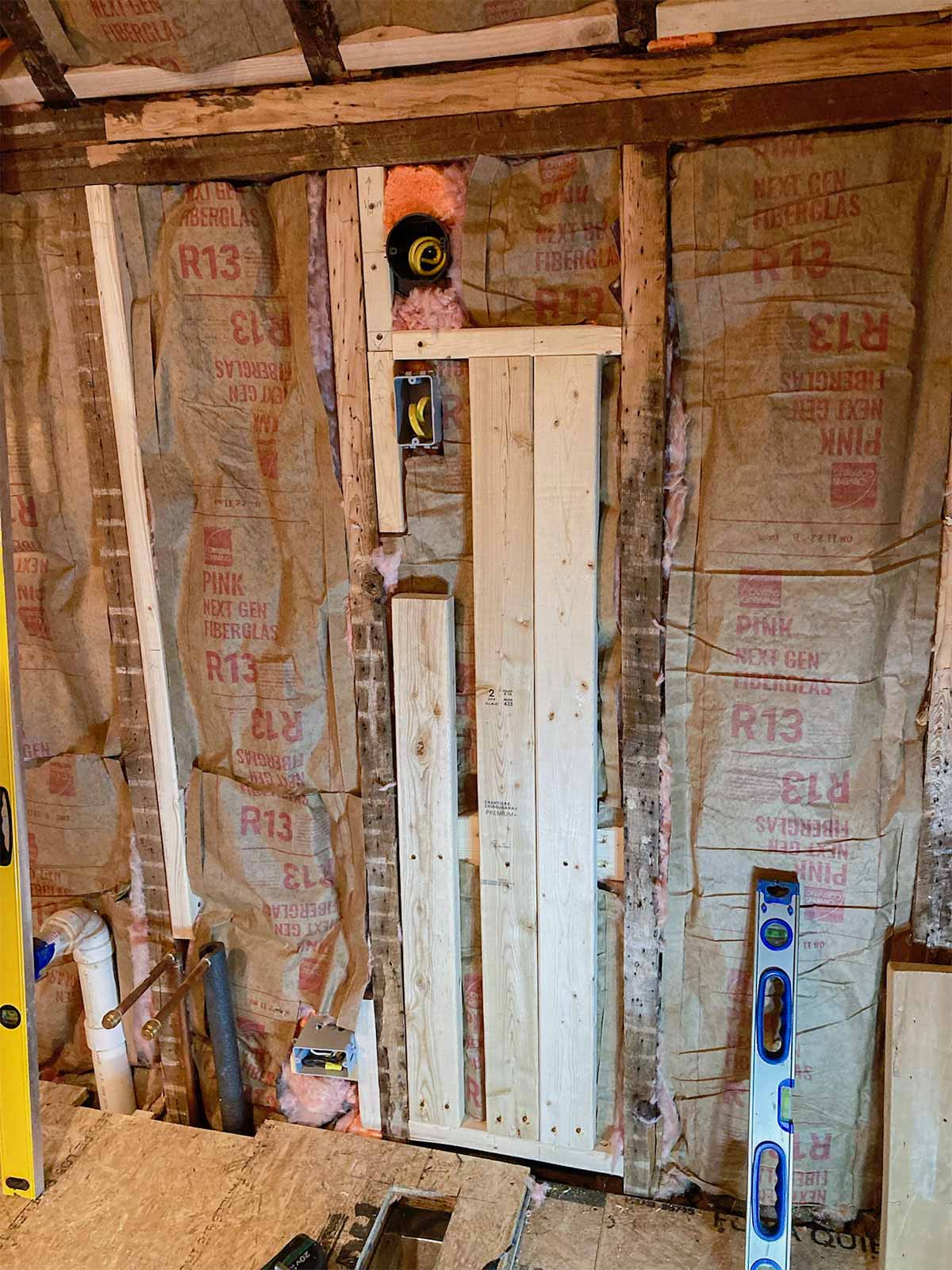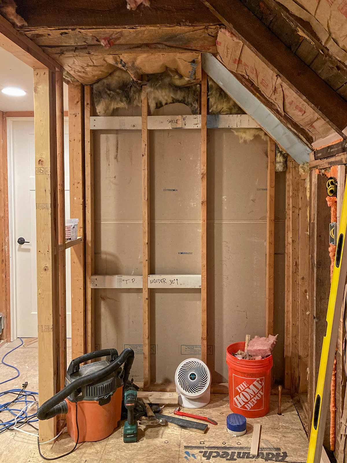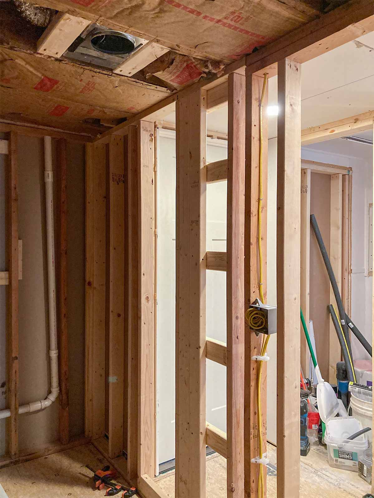 The floor leveling in the bathroom was not part of the February 2024 blog. That would be the first step in the bathroom. By having to raise the floor in the bathroom, this allowed us to be able to drop the shower pan in at the old floor height (roughly) so we would not need a curb into the shower area, creating one seamless tile floor into the shower. We were hoping to get away with just having a glass panel and no door into the shower, but because of where we had to have the shower head installed, that wouldn't work. Andy also added framing for the shower niche and blocking, where needed, and installed the bathroom fan/light.