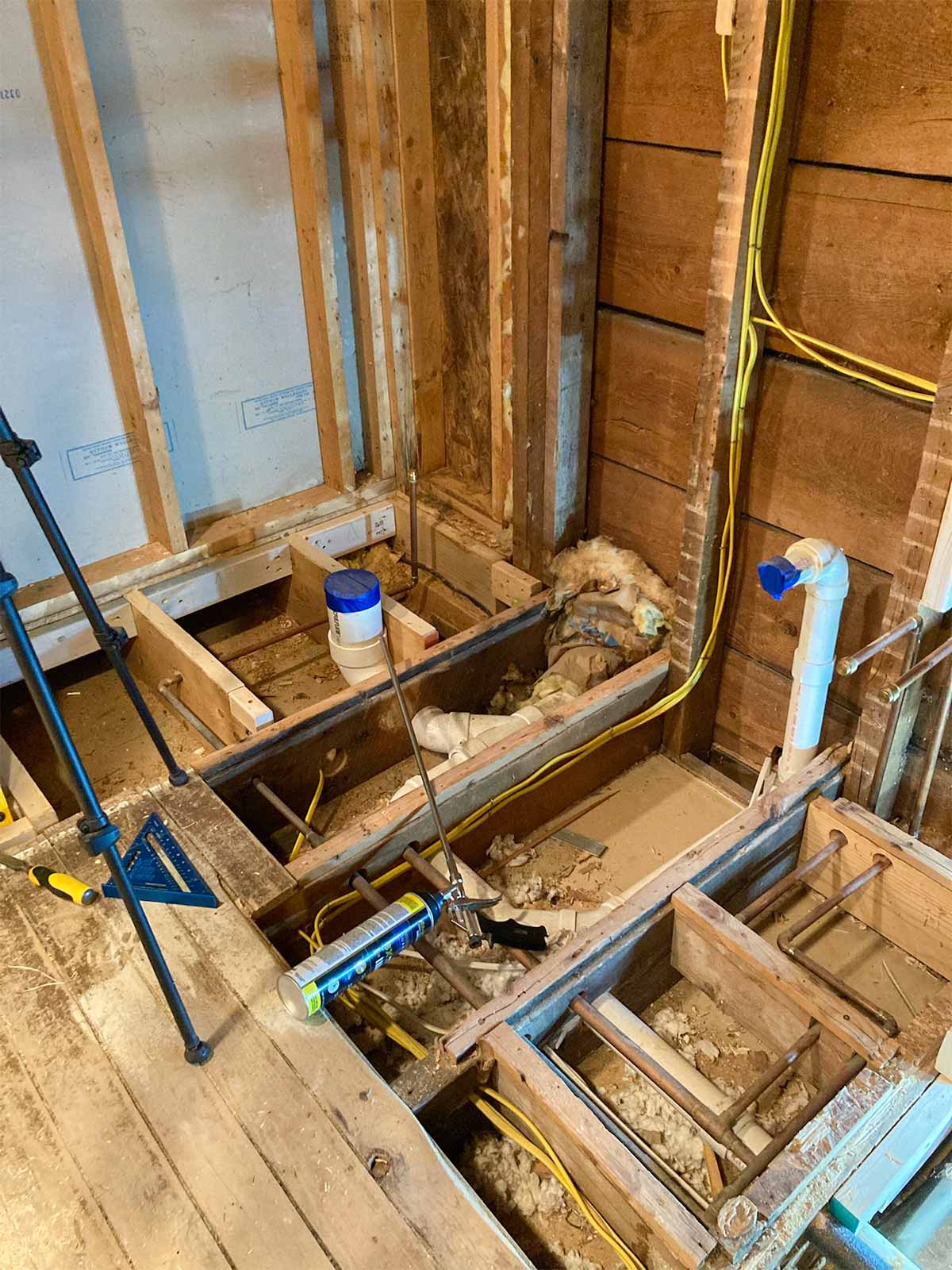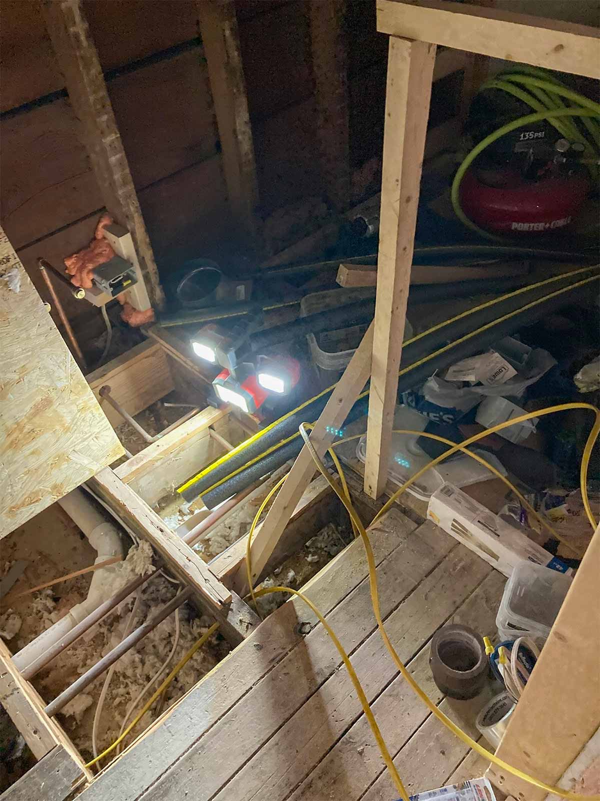 While the floor was still open, Andy worked on running wiring for the outlets, sconces, and exhaust fan, down into the basement. He also ran a wire down to the kitchen for the new microwave. Thinking ahead!