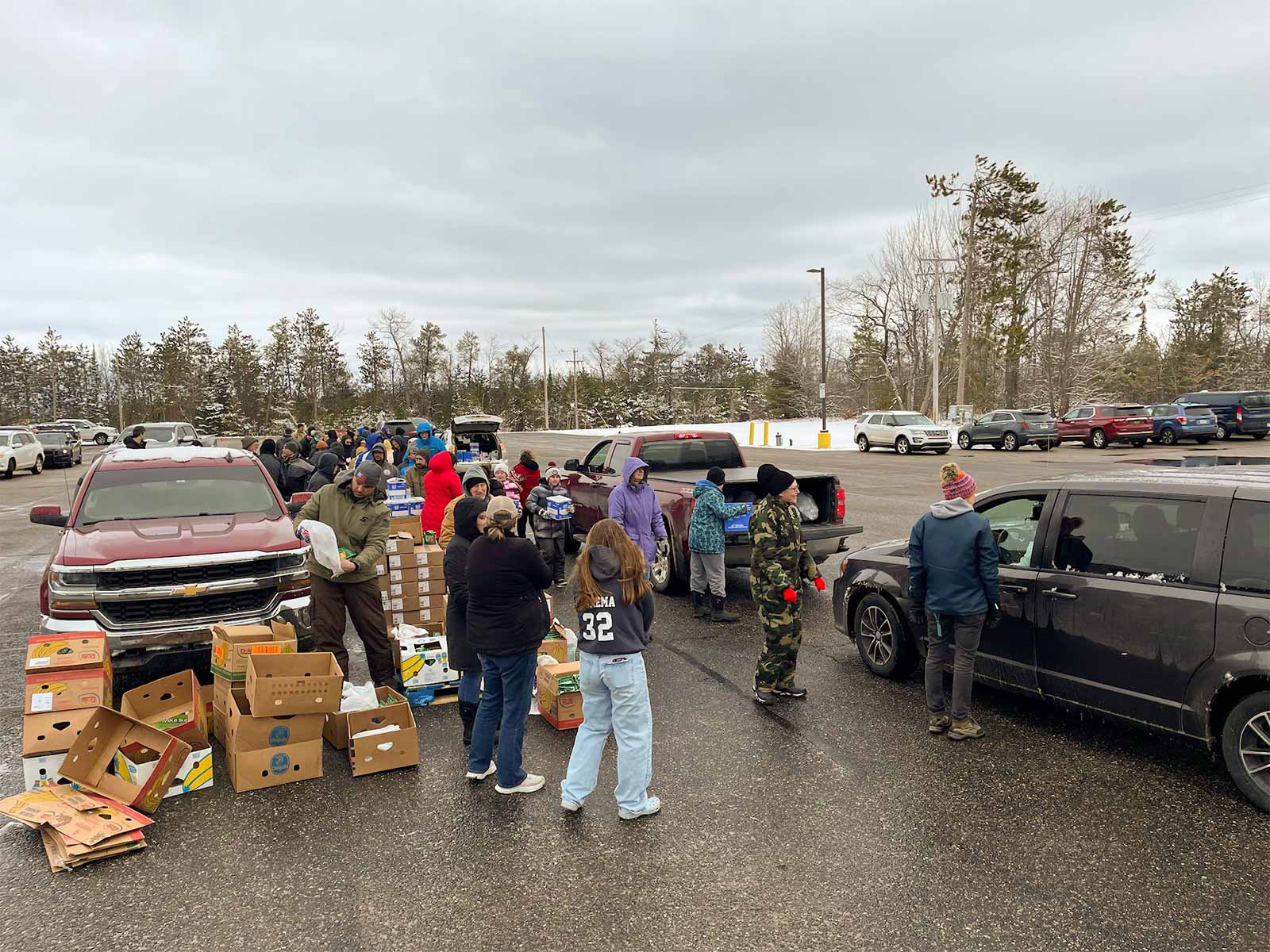 While we were at the church on Monday letting everyone know we were incommunicado at our house, Andy received a call from one of the men at the church. He said they were helping with a mobile food bank at the school and wanted to know if we would like to help. So we headed to the school and found many volunteers preparing to pass out food to those in need. Vehicles were lining up to receive items. We began with instructions and a prayer. Our station bagged and handed out apple sauce 6 packs. There were many supplies– water, snacks, canned goods, etc. It was very cold and windy!