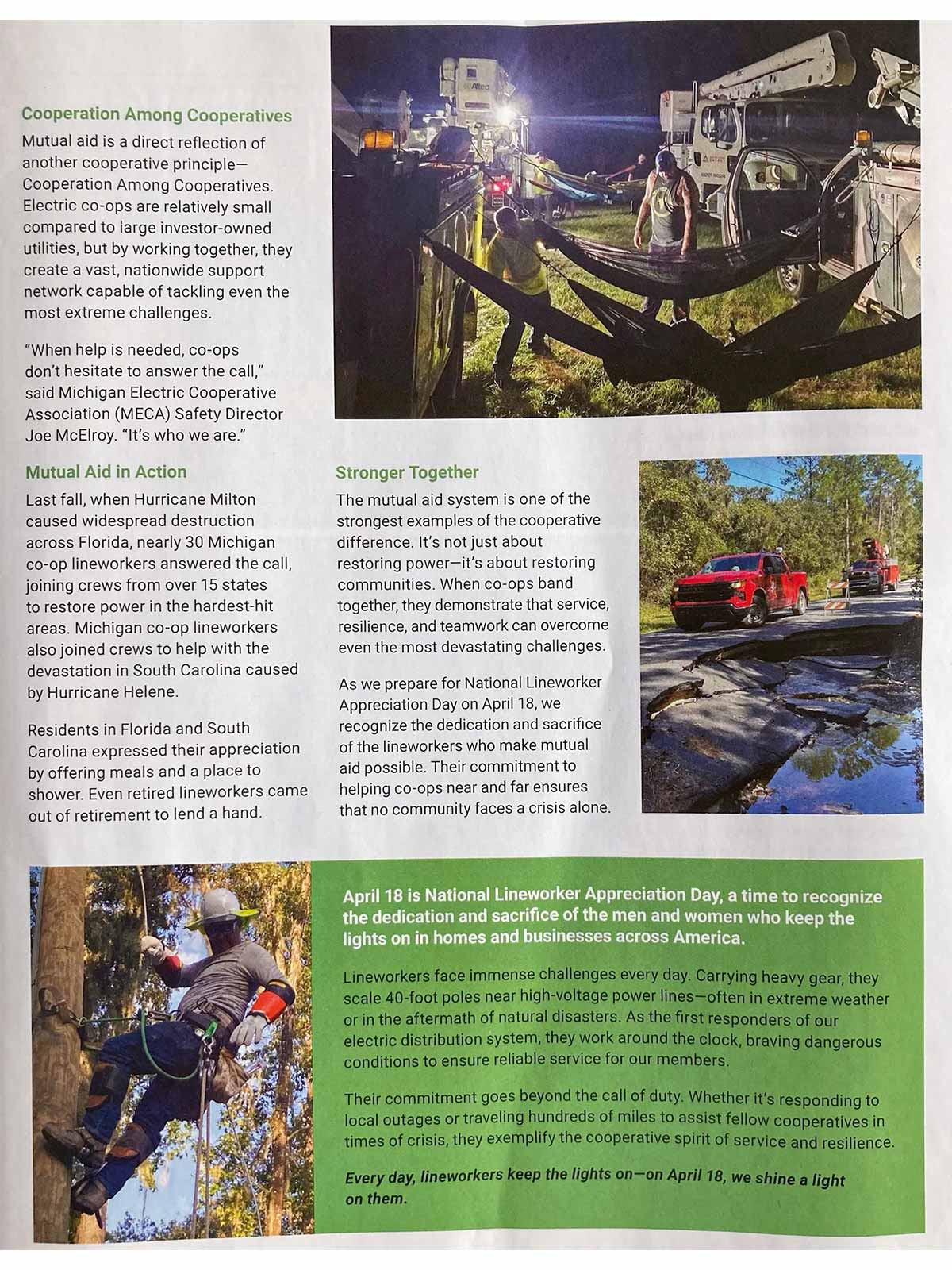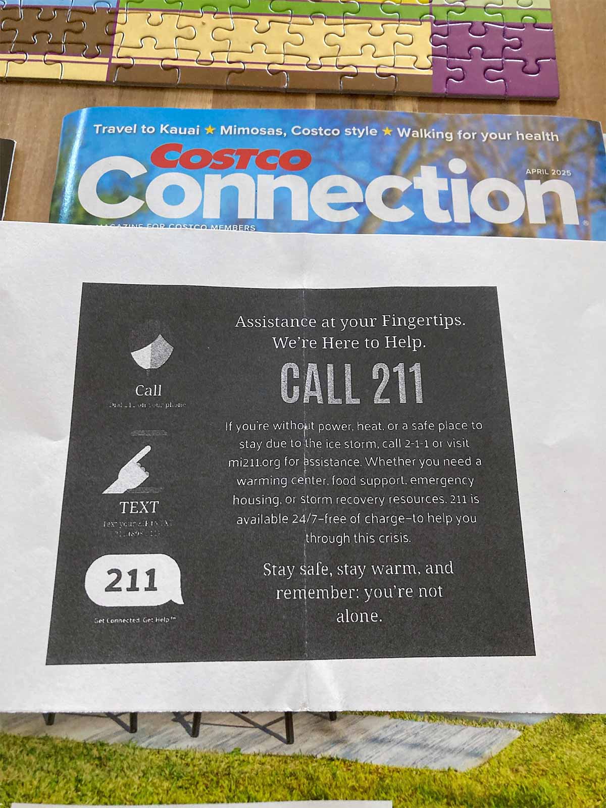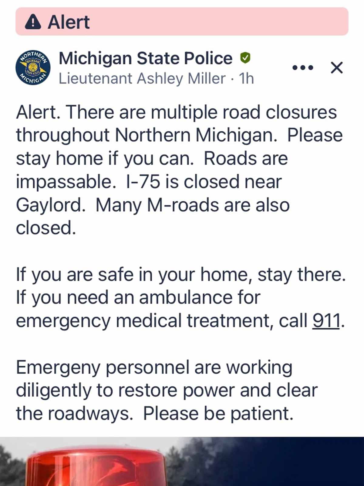The county and municipal workers from across northern Michigan worked endless hours. Once this was declared a state emergency, state workers, as well as those from other states, and the National Guard, were coming to the rescue. A very close friend of ours had put in over 200 hours of work from Friday night through Thursday. People were providing workers with free meals, and restaurants were doing this as well. Neighbors were also helping neighbors in any way they could. By Thursday afternoon on April 3, most of Indian River had power restored. The grocery store and gas stations were back in business.
