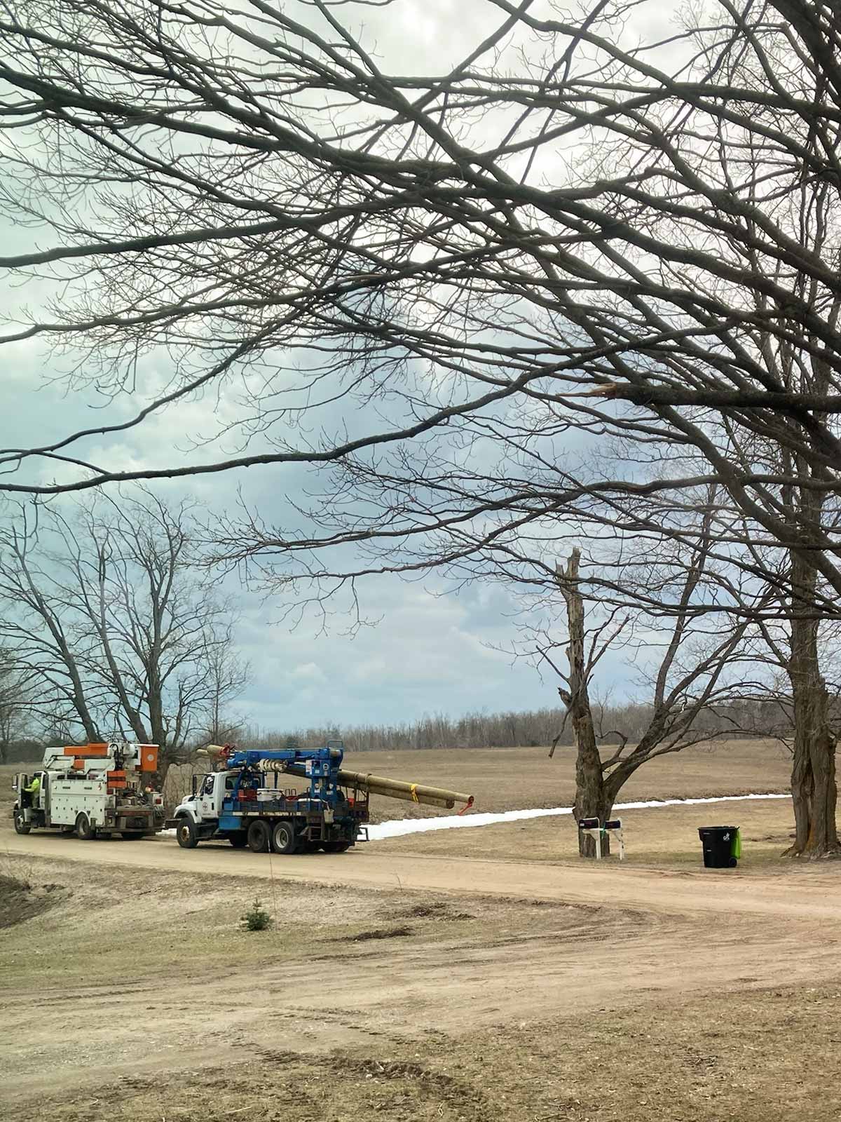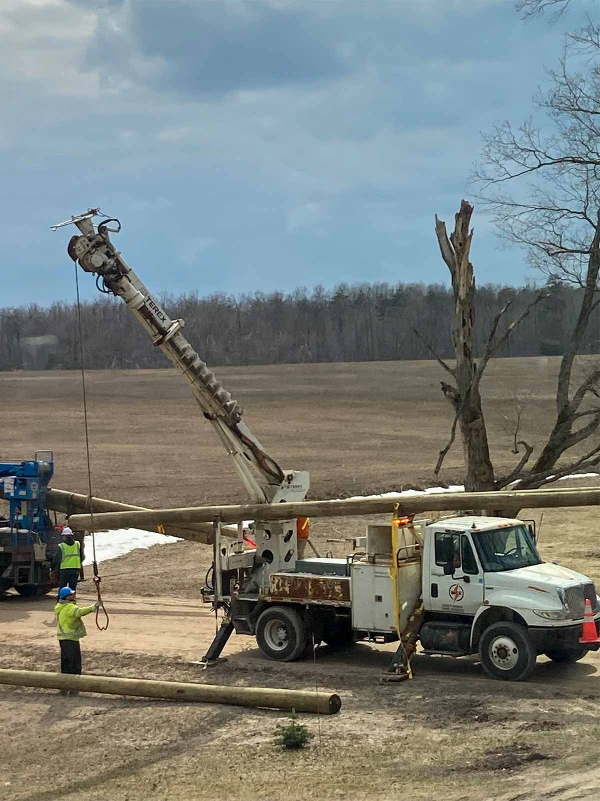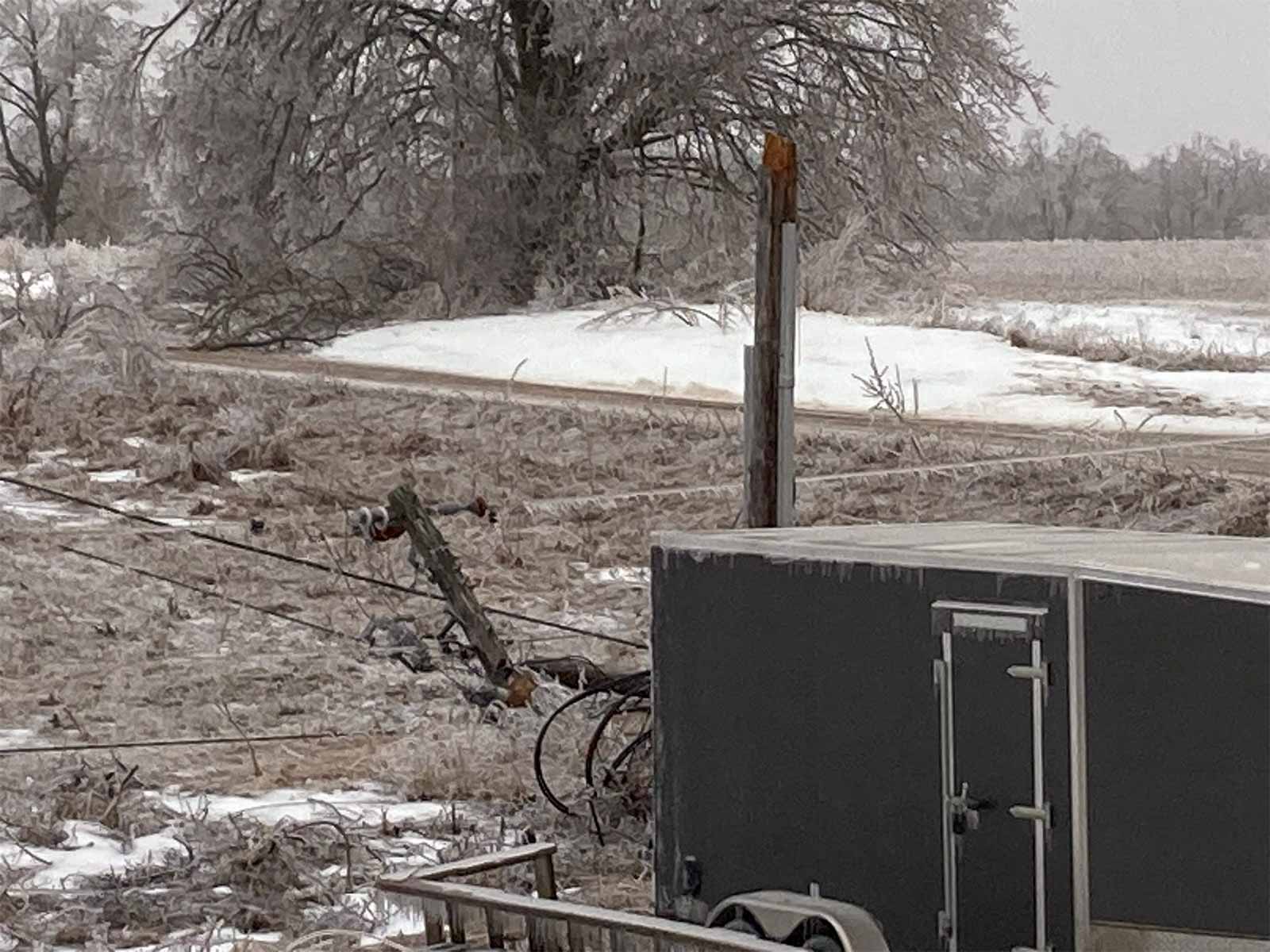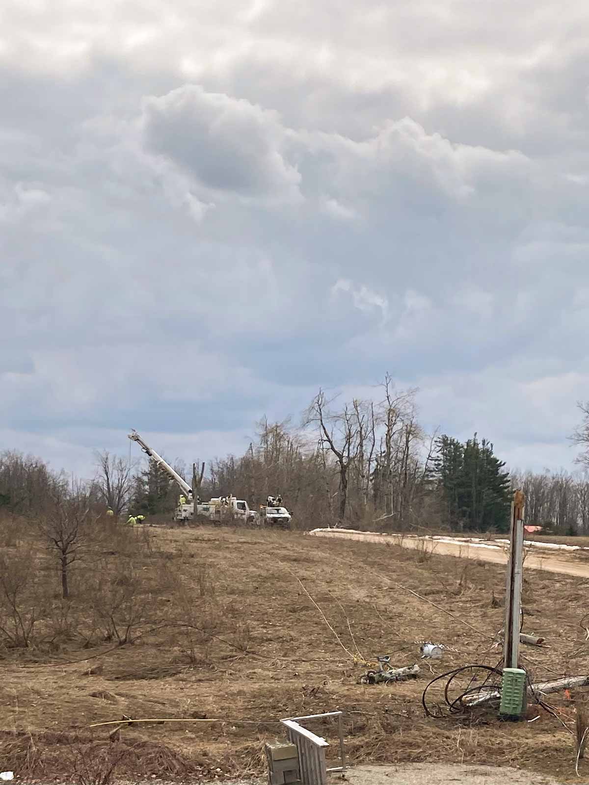 Overnight into Sunday, March 30, we heard a large crash that shook the entire house. It sounded like a tree fell on the house. When we awakened, we saw that the utility pole closest to our house was snapped in two and power lines were laying across the street. After further investigation, we found out what the crash was that we heard overnight. Our service lines had ripped off the house as the utility pole snapped. There were tree limbs down everywhere and other utility poles were ready to snap. Throughout Sunday and Monday, it sounded like gunshots in the woods as tree limbs, and trees, came crashing down.