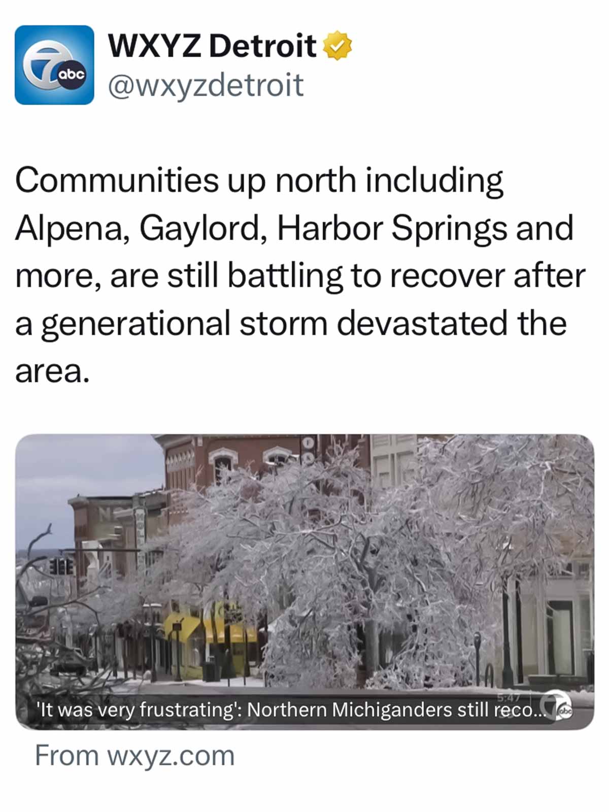 This ice storm is said to be the worst in at least 100 years. The power grid is completely destroyed. Ten counties were declared in a state of emergency by the initial storm, with an additional two counties following secondary storms. That's a huge portion of the state of Michigan.