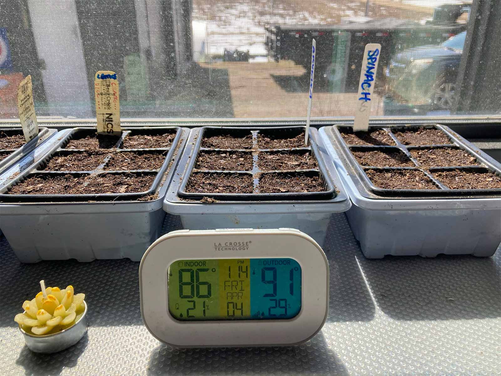 I began some cleanup in the greenhouse and planted some starter seeds to put in the kitchen window. The thermometer shows the temp in the kitchen window on the left, and the temp in the greenhouse on the right. Other than that, I was stuck at home to keep the fire going in order to heat the house. It was still cold in northern Michigan.