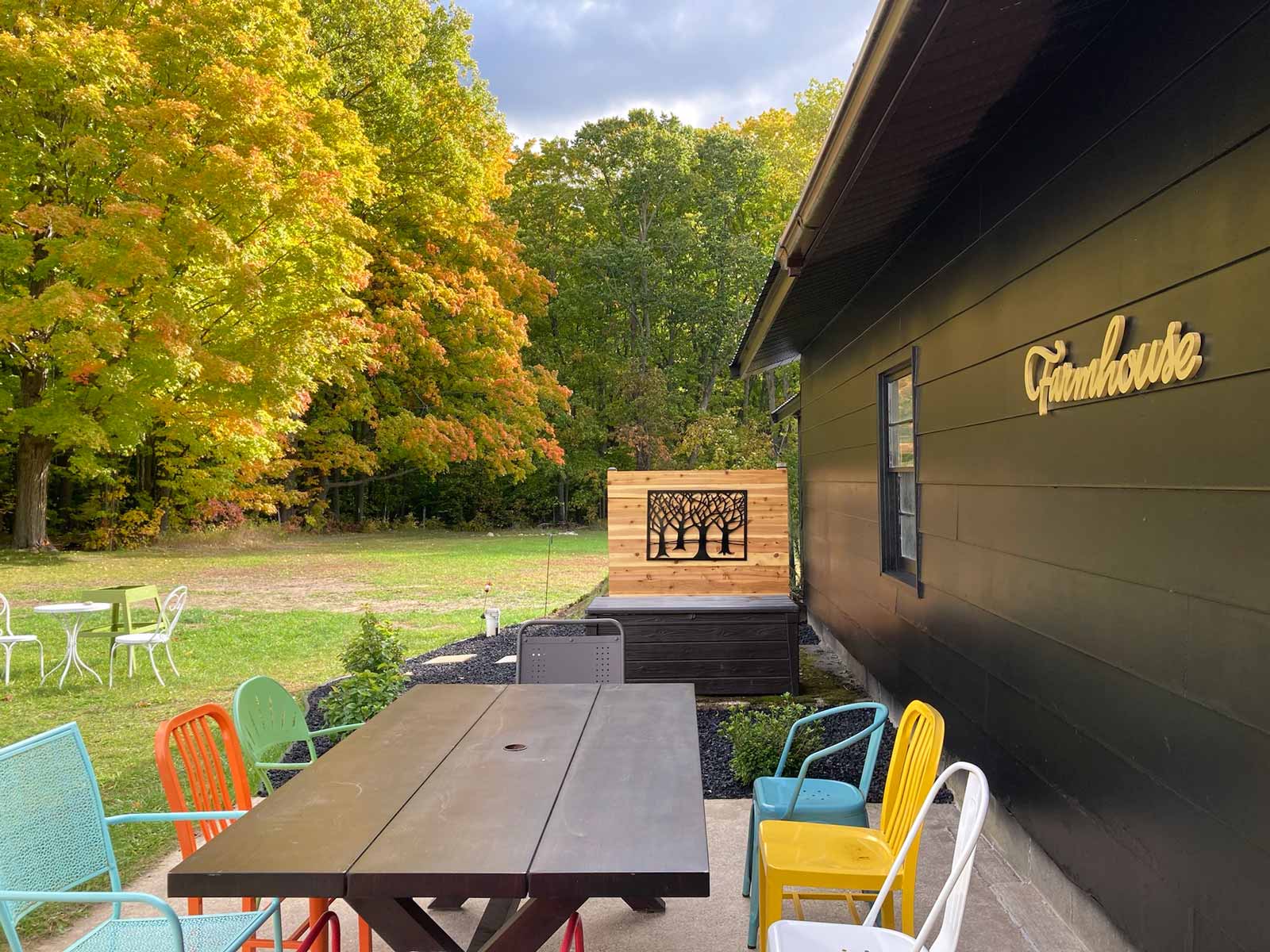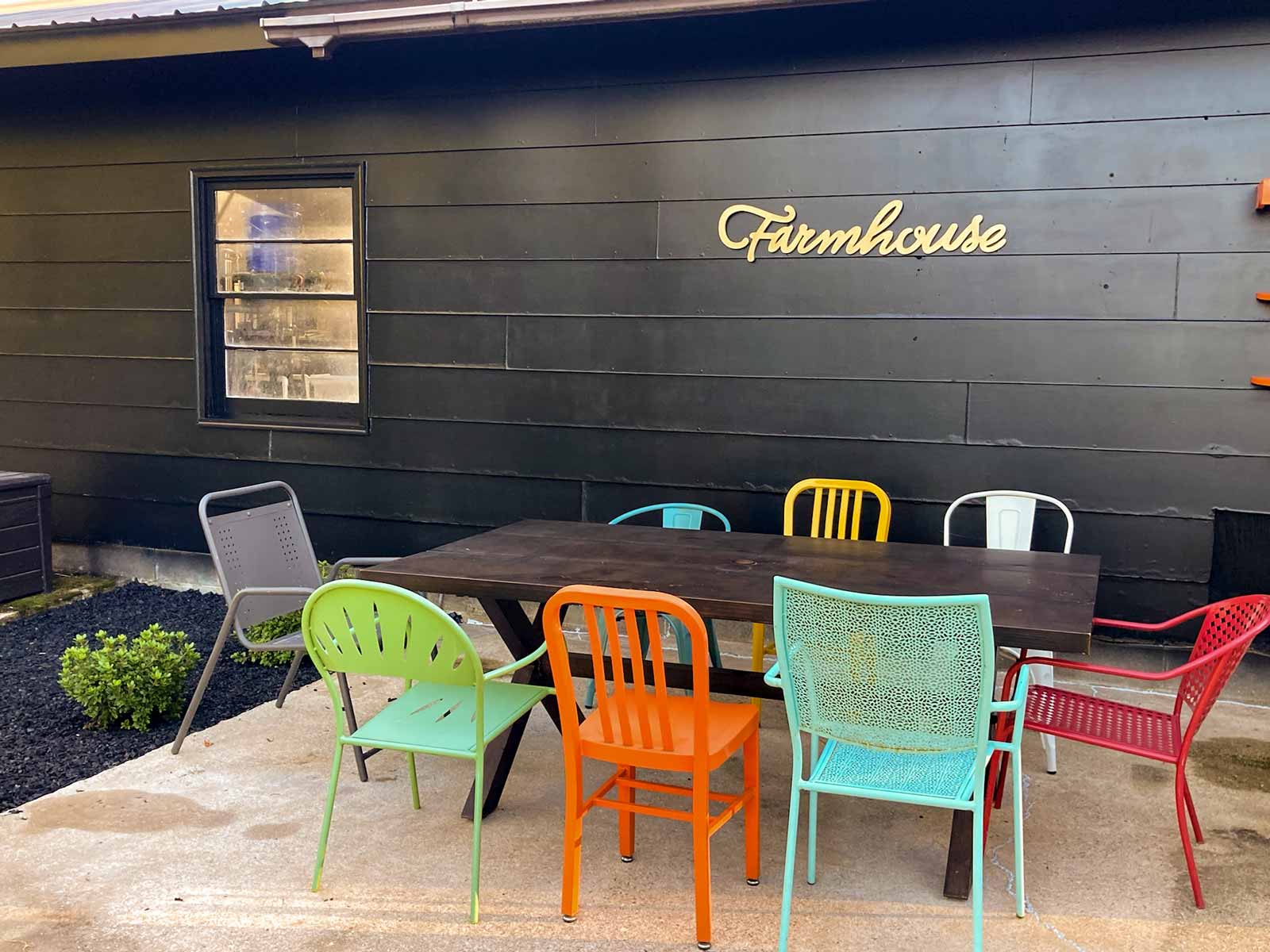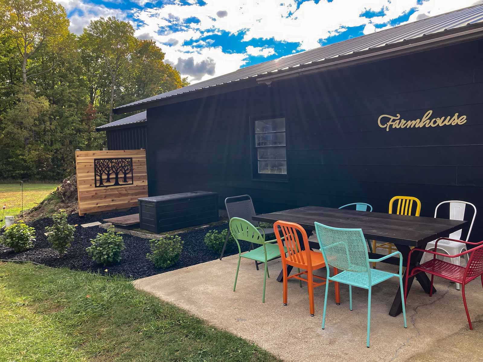 The previous owner had left a “Farmhouse” sign in the house. I painted it gold and hung it on the side of the garage. We placed our existing outdoor dining table and chairs on the concrete pad (that used to be a kid's sand box). We love how it all turned out!