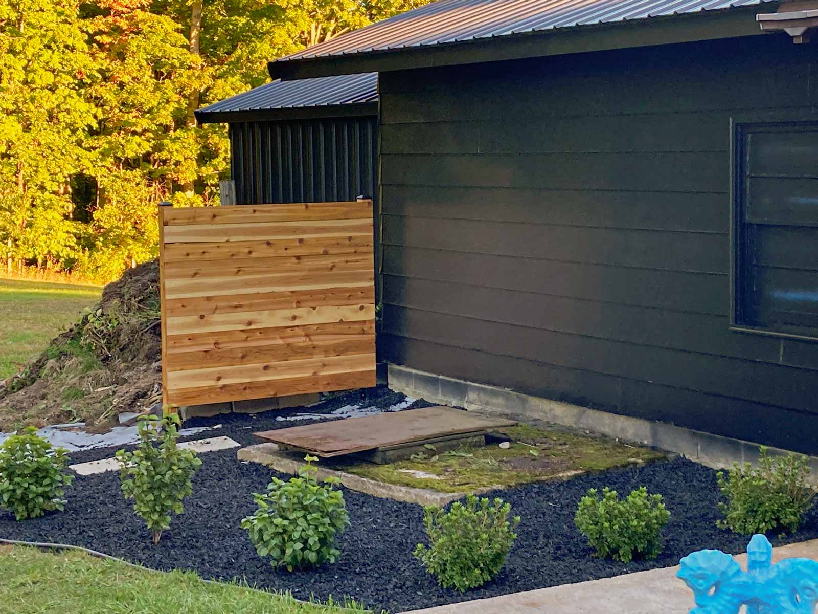 Surprise! We painted the side of the garage black and added a cedar fence panel to hide the compost pile.