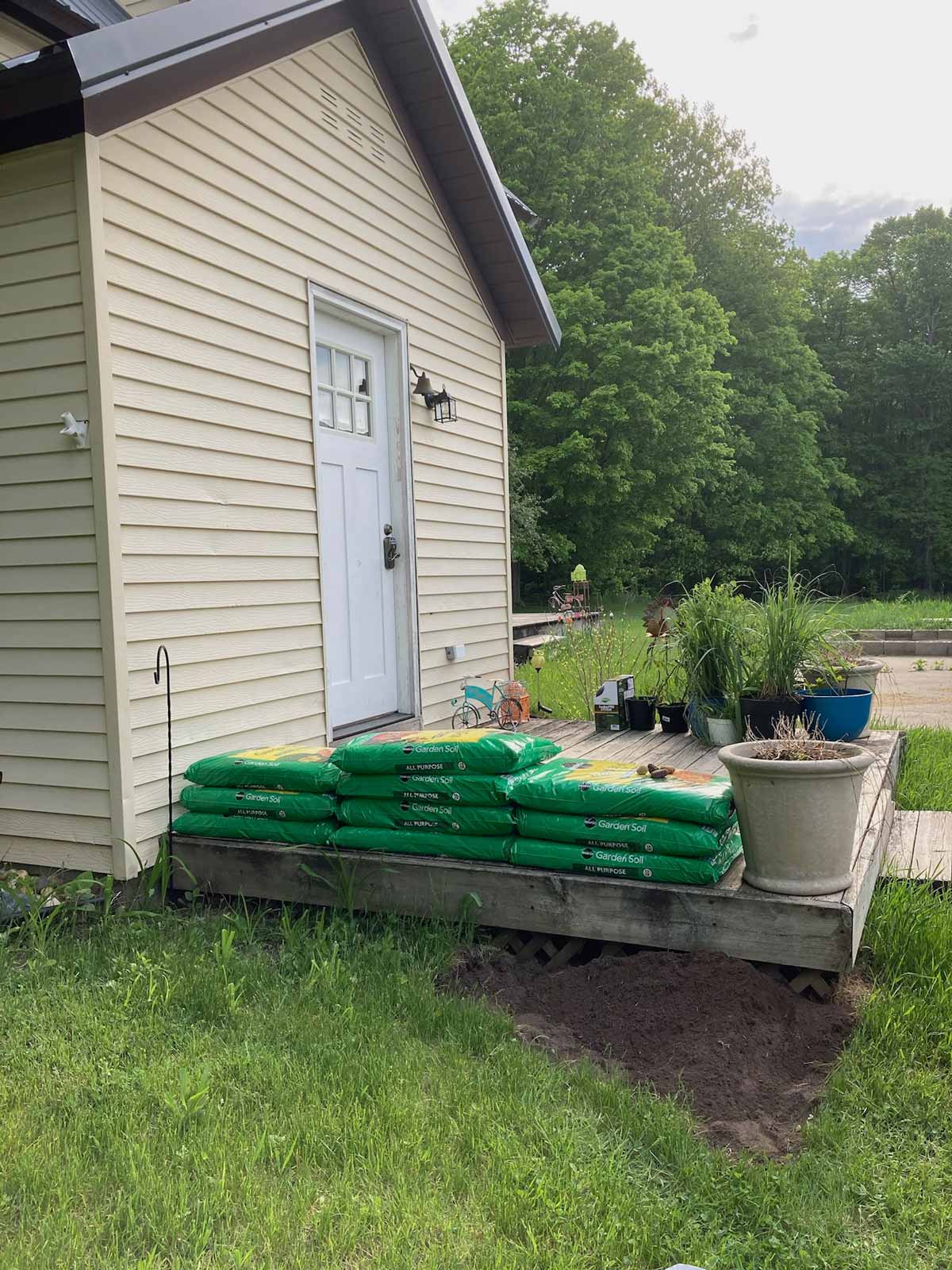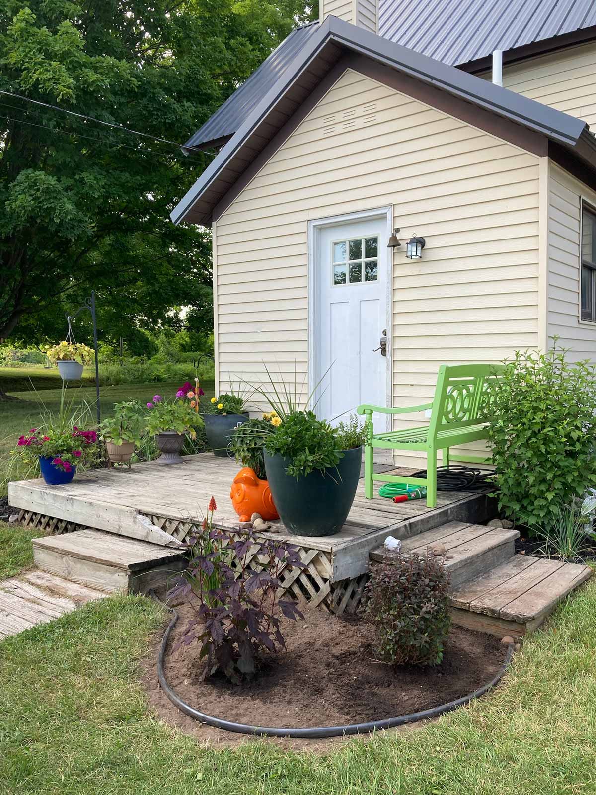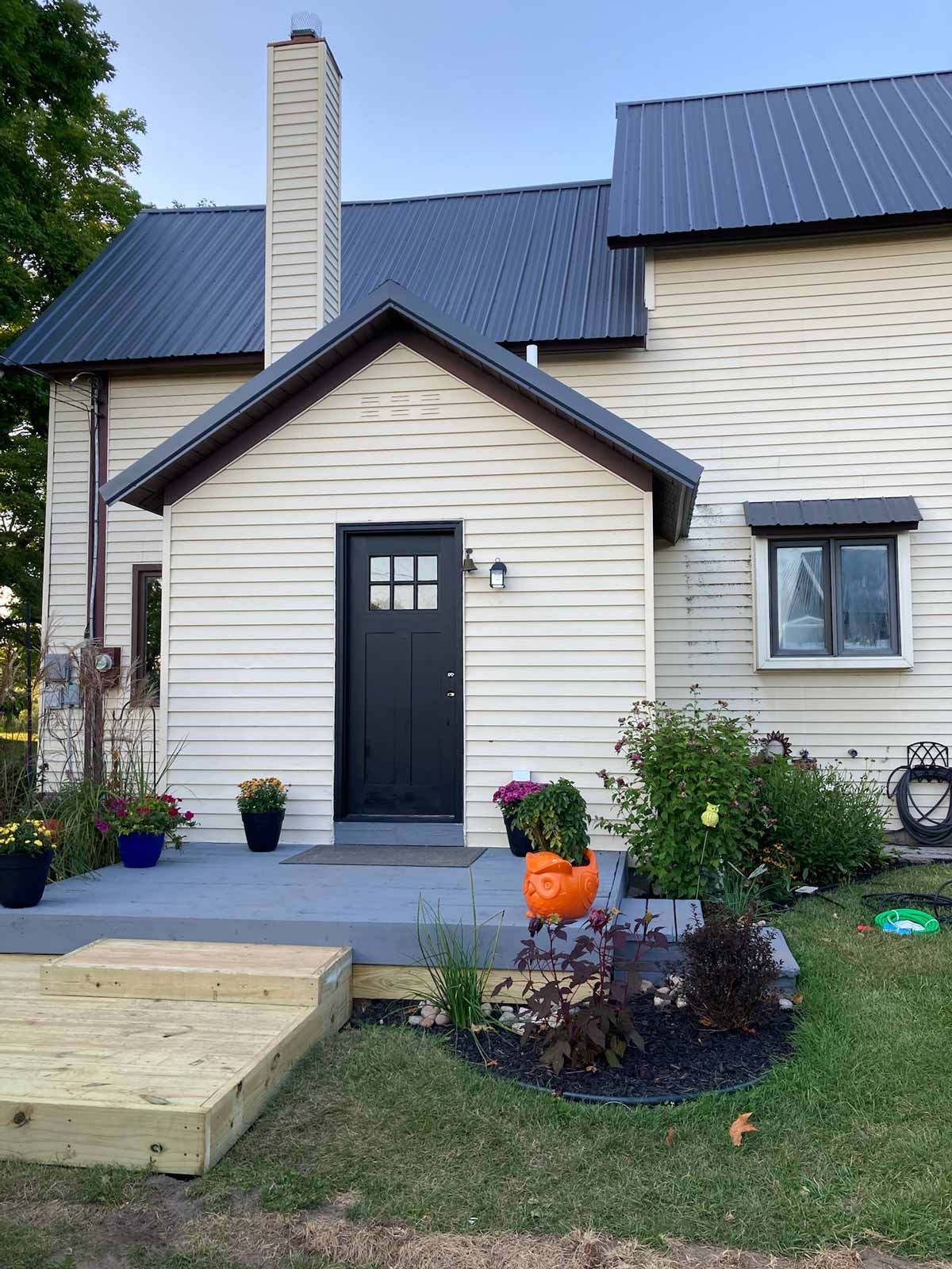 I added a small planting bed off the deck. Andy rebuilt the step into a landing. I stained the deck gray and painted the door black.