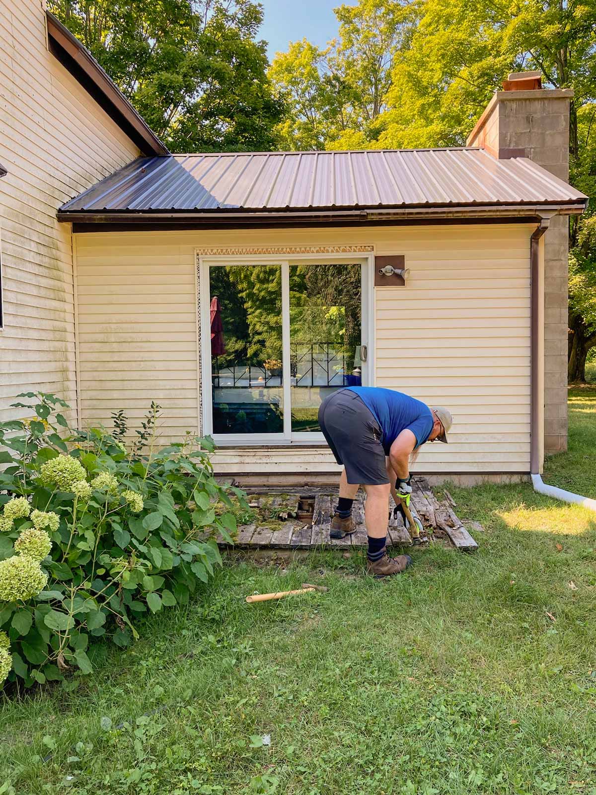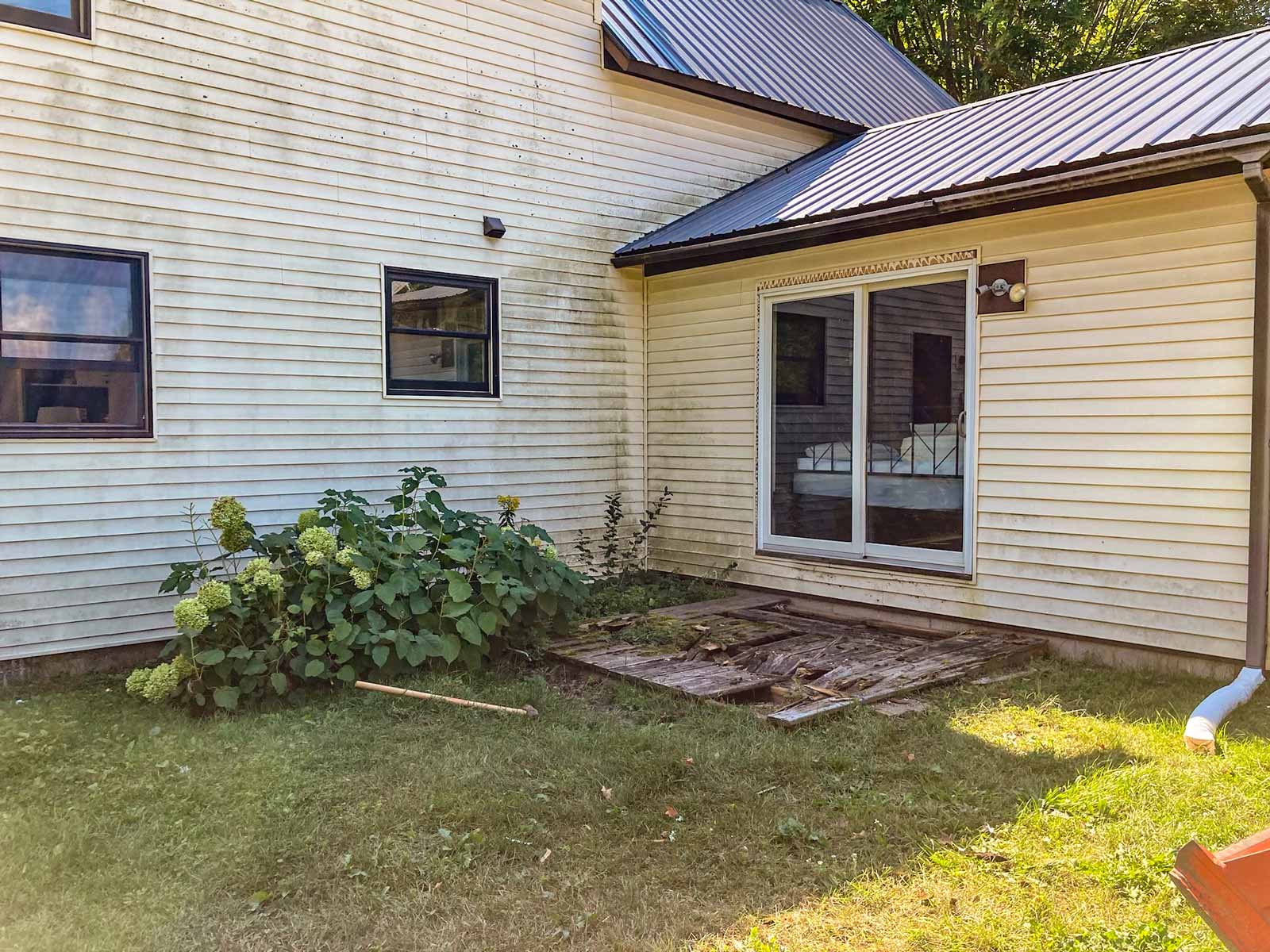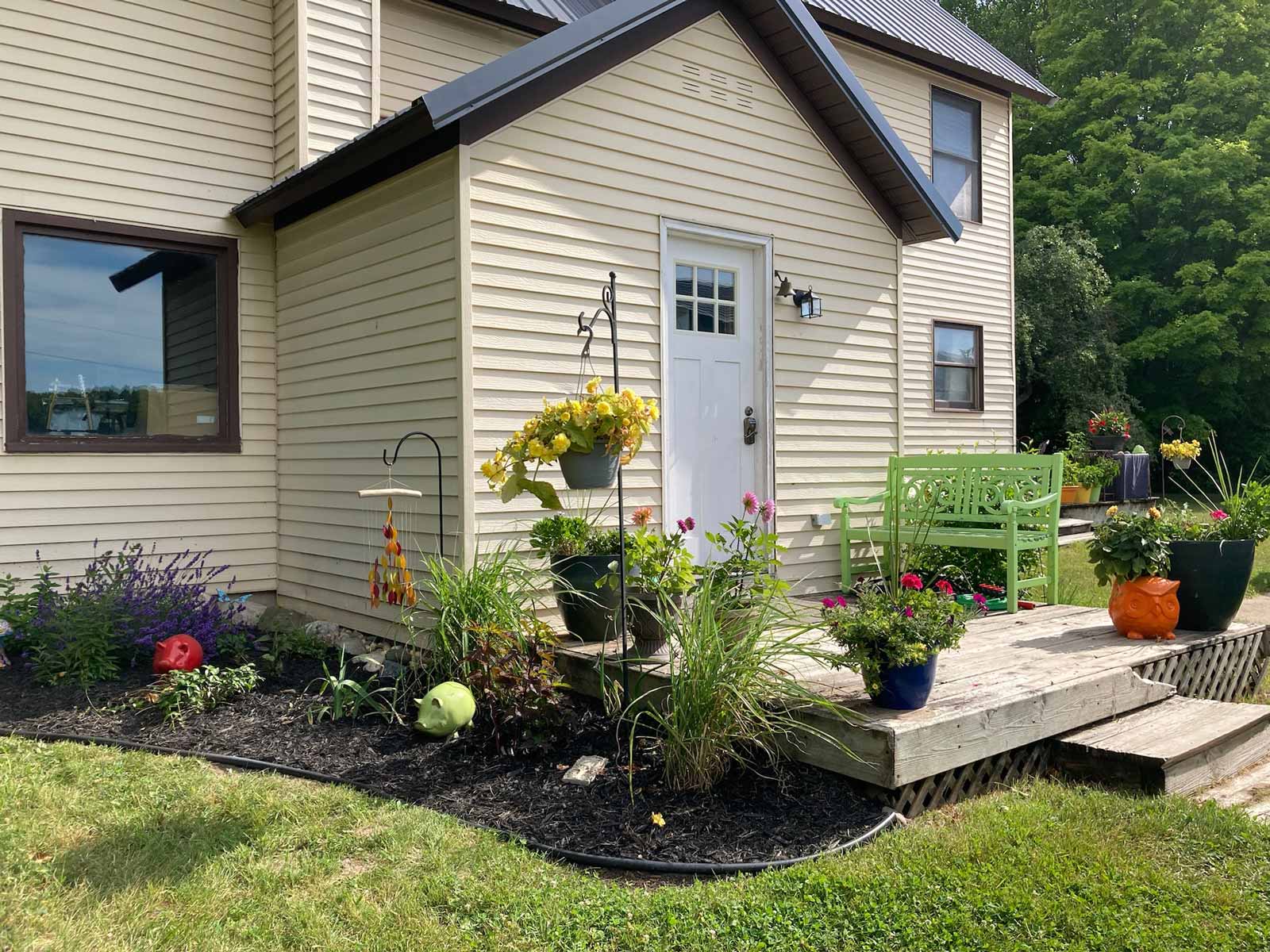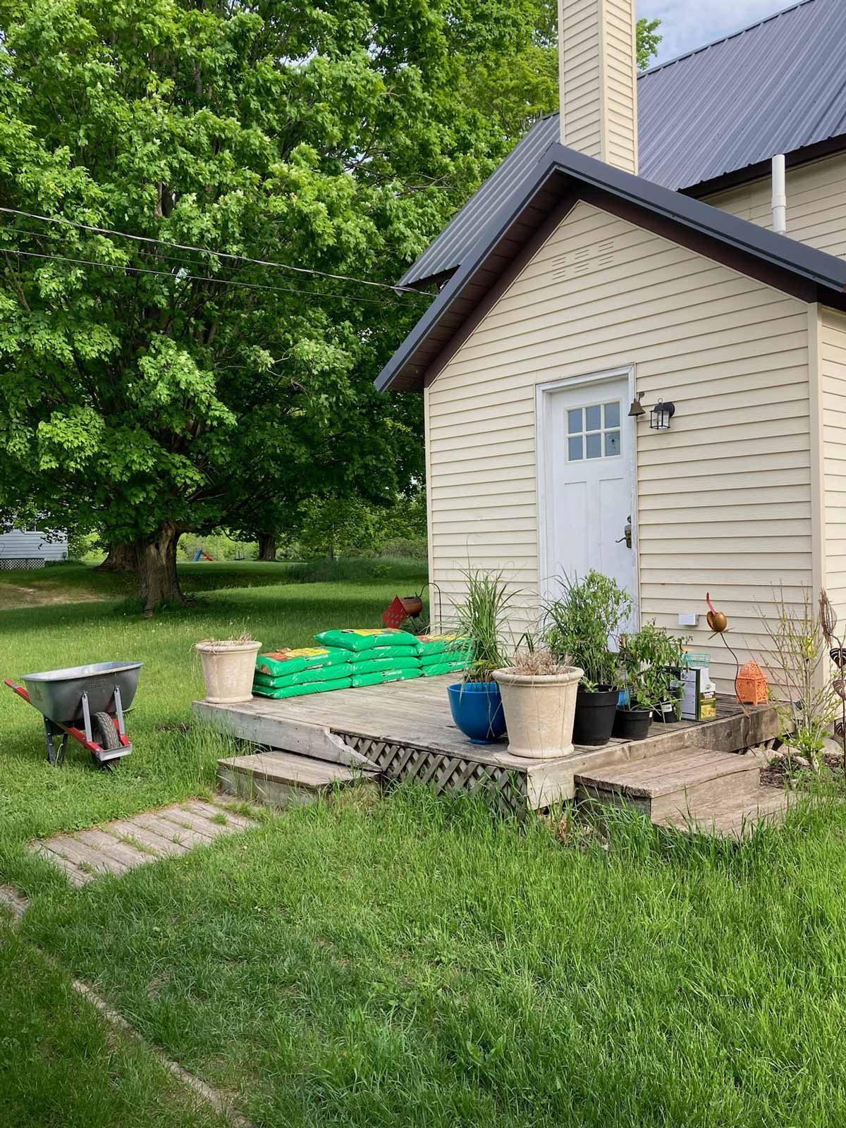 I added a small planting bed off the deck. Andy rebuilt the step into a landing. I stained the deck gray and painted the door black.