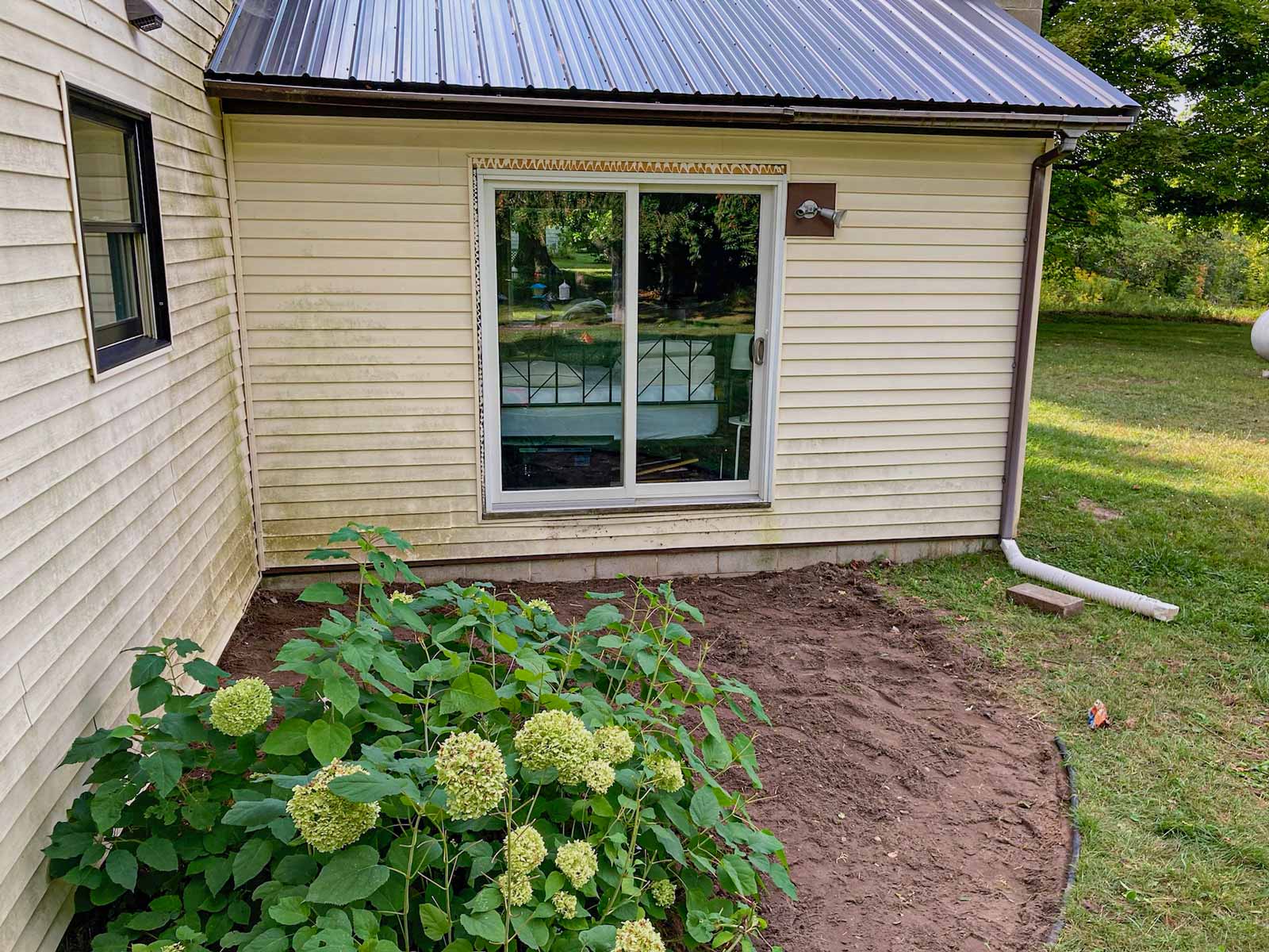 It's not really a garden. But it has a beautiful hydrangea. There was a rotted out deck off the living room. The step was removed before I had a chance to take a pic. I dug out the entire area around the hydrangea and added marble stone.