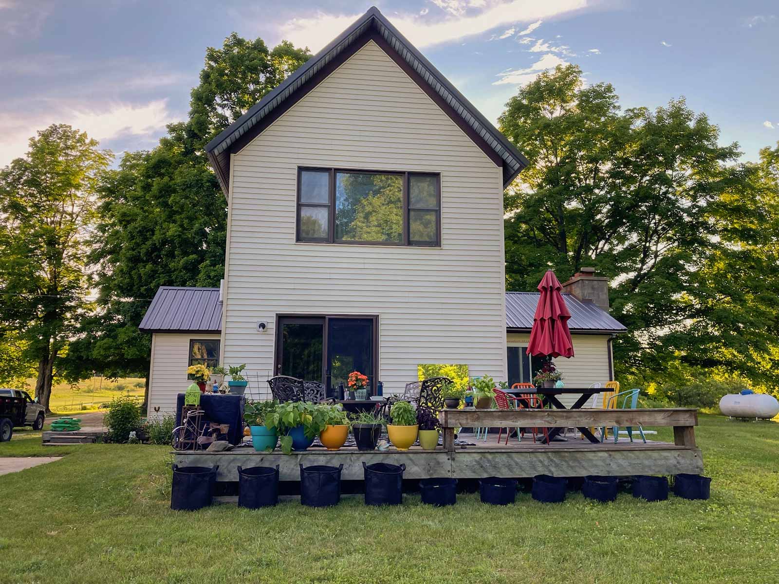 This is a pic of all our containers on the back deck of the new house. The bags in front of the deck are potatoes. We planted them on the Fourth of July and harvested them at the end of September. They were delicious!