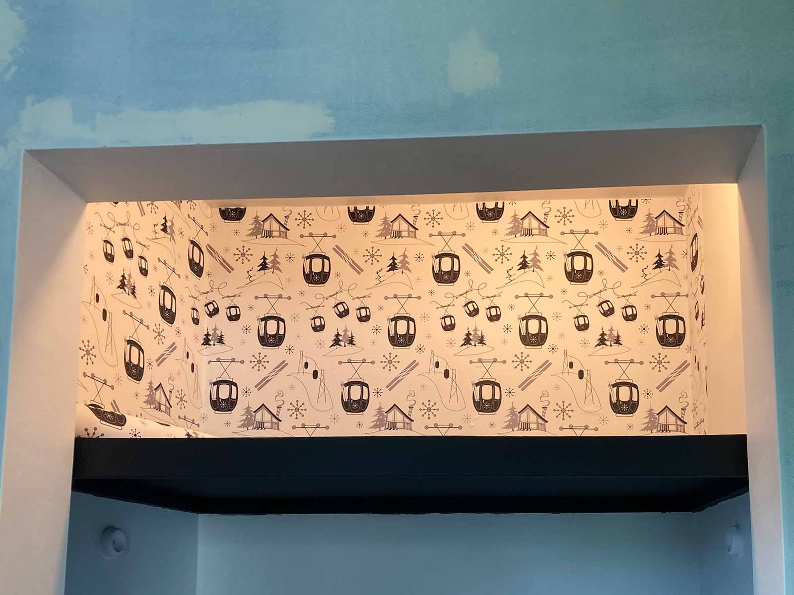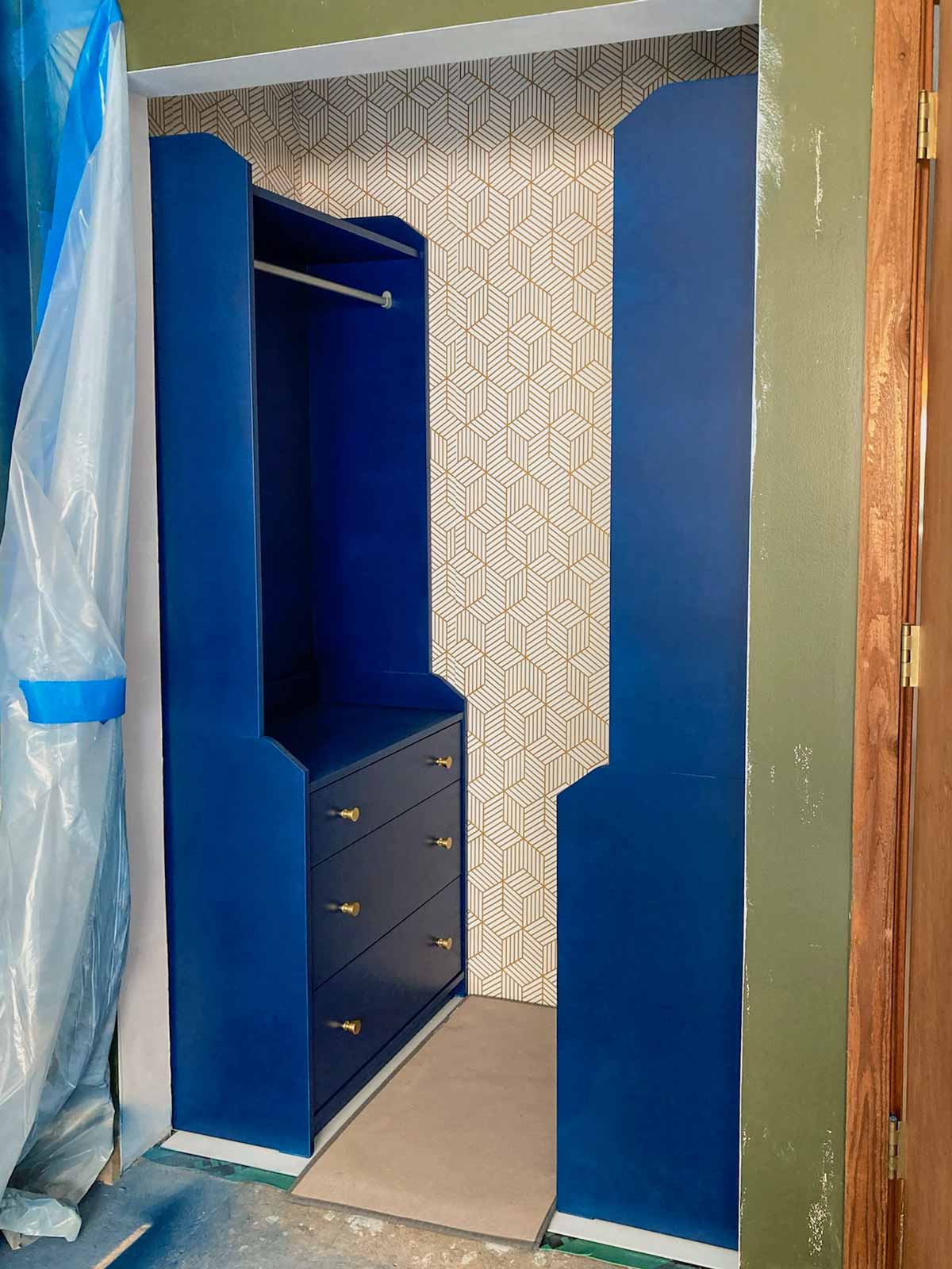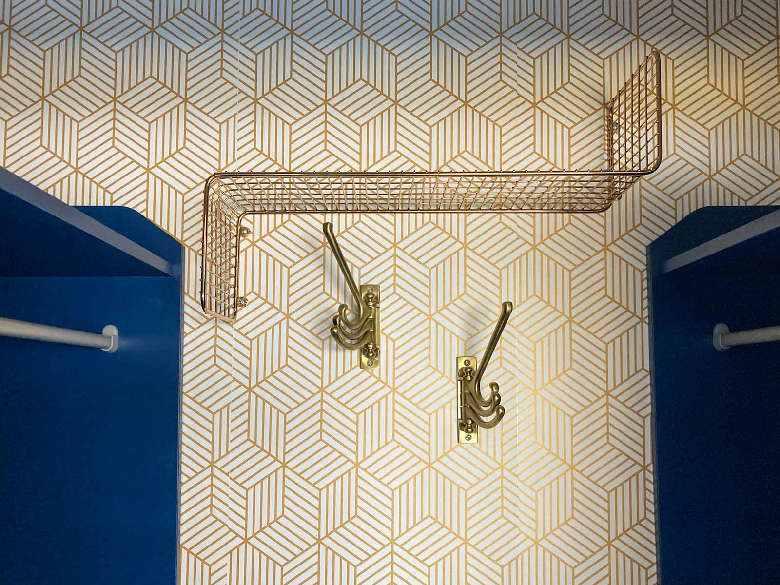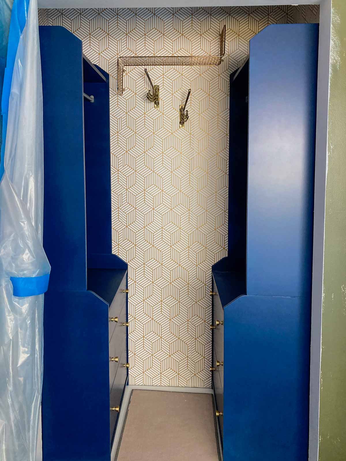 I chose a geometric gold and white pattern for the wallpaper in both closets in the principal bedroom. It was a cheap wallpaper, and the design didn't always match, but it works for a closet.