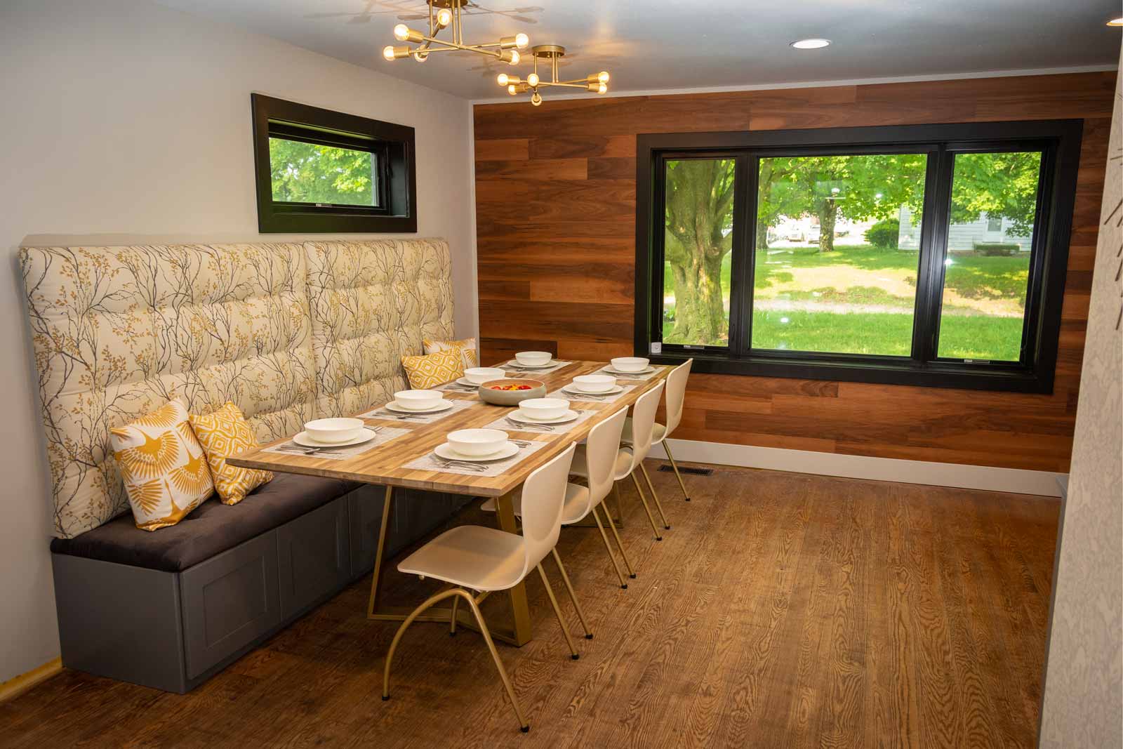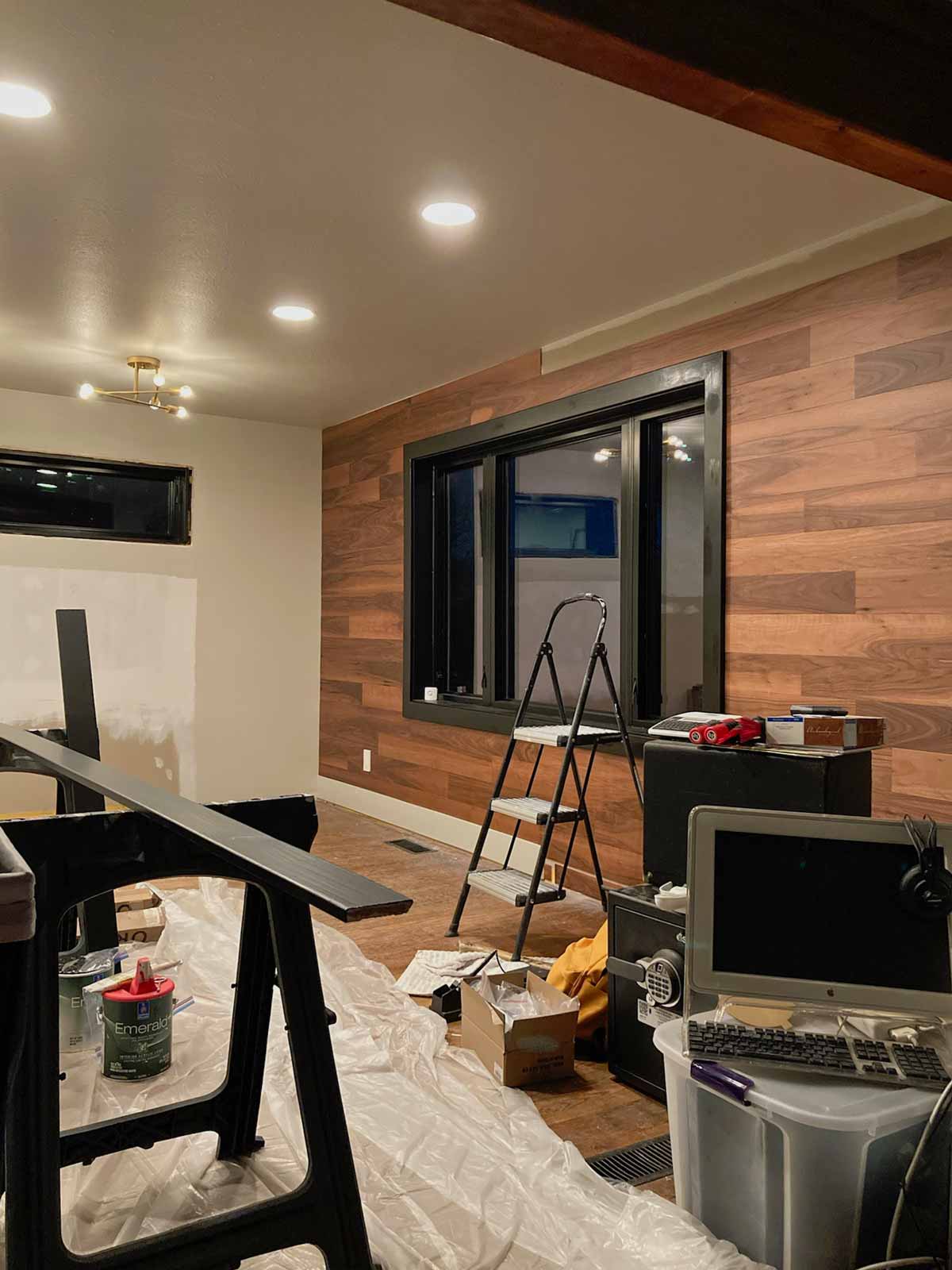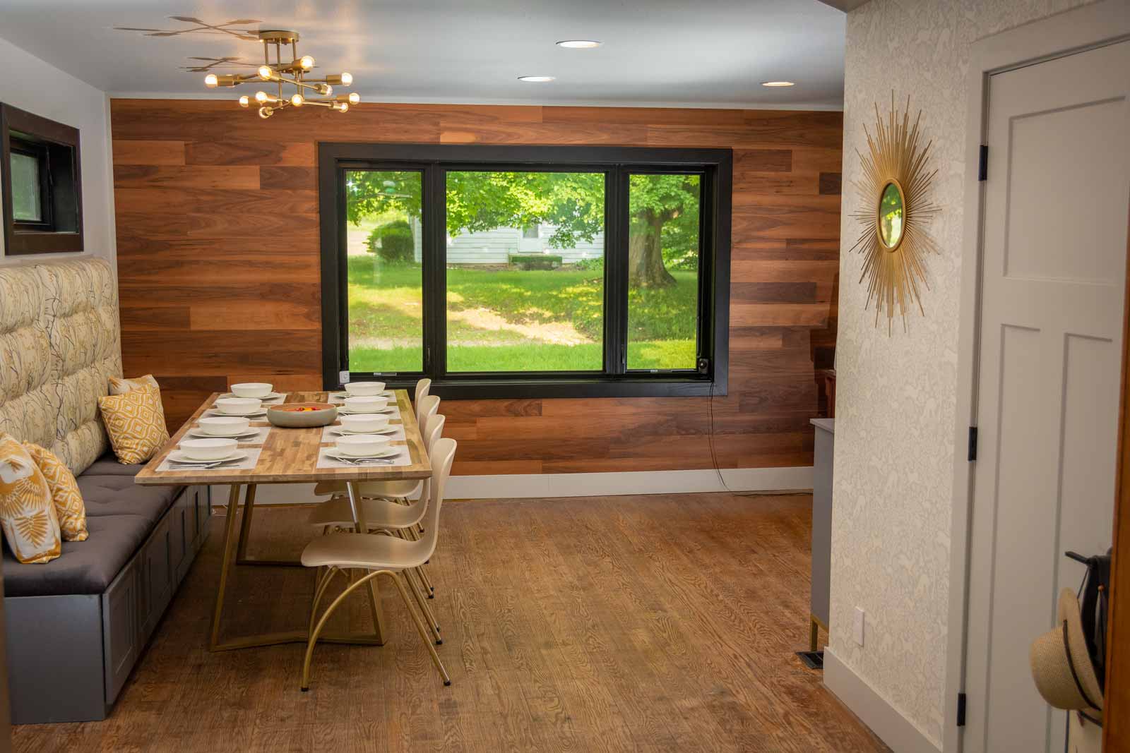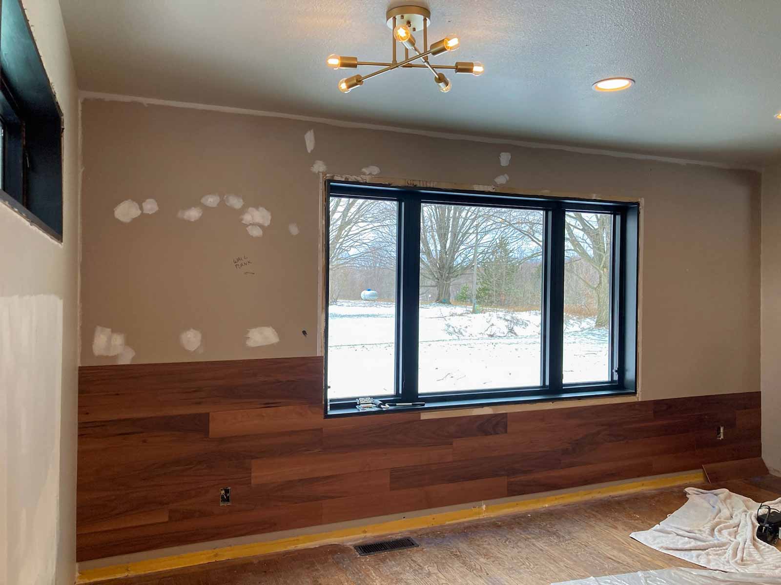 Once the new windows were installed, we were able to continue with the Dining Room, and take a break from the siding. We added two lights to hang over the dining table. We purchased a product called Wallplanks, in a walnut finish, to install on the front wall. It has adhesive on the back and is installed like shiplap, so it was relatively easy to put up in a day.