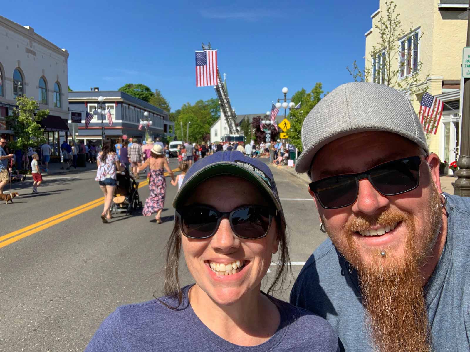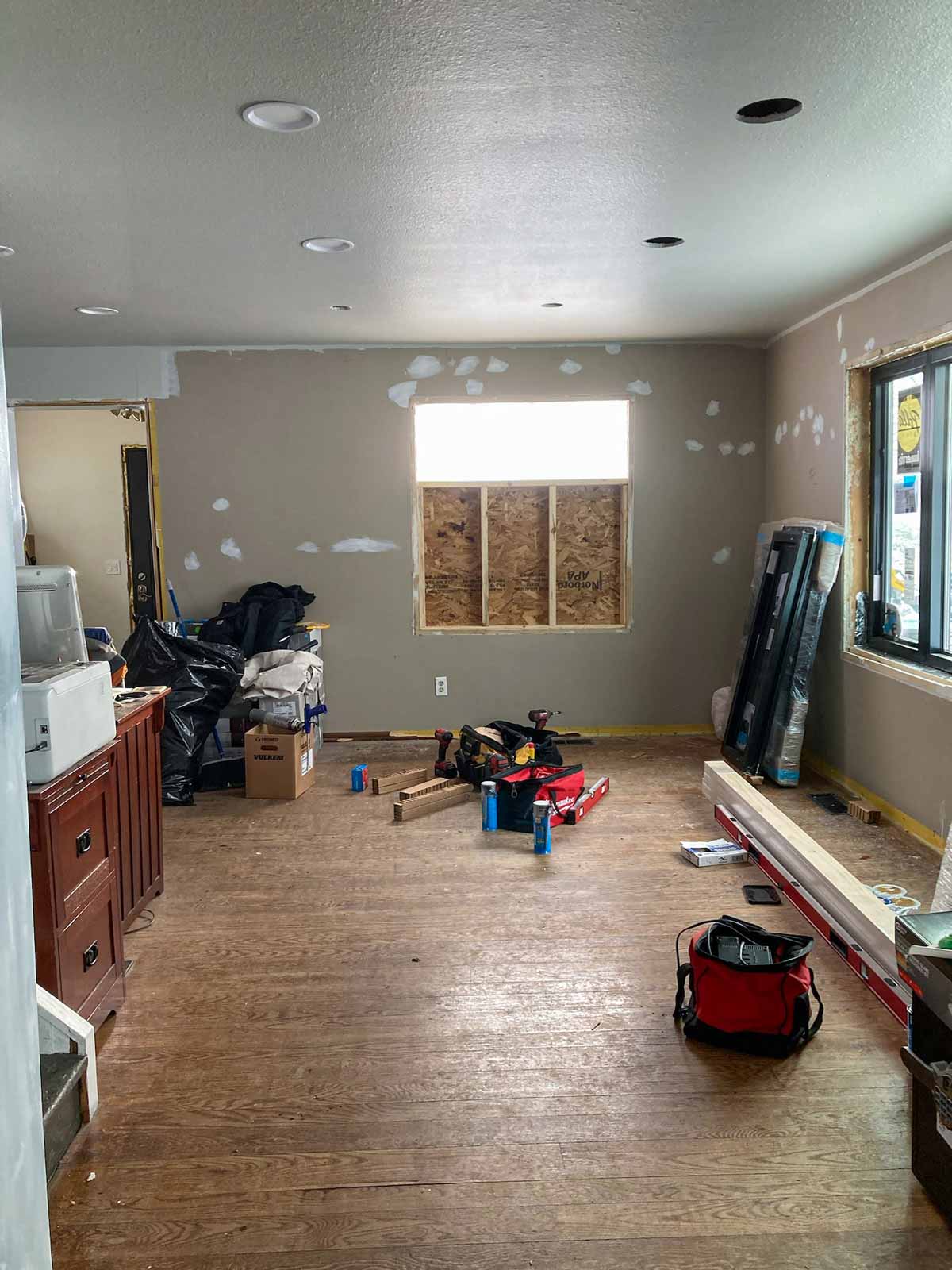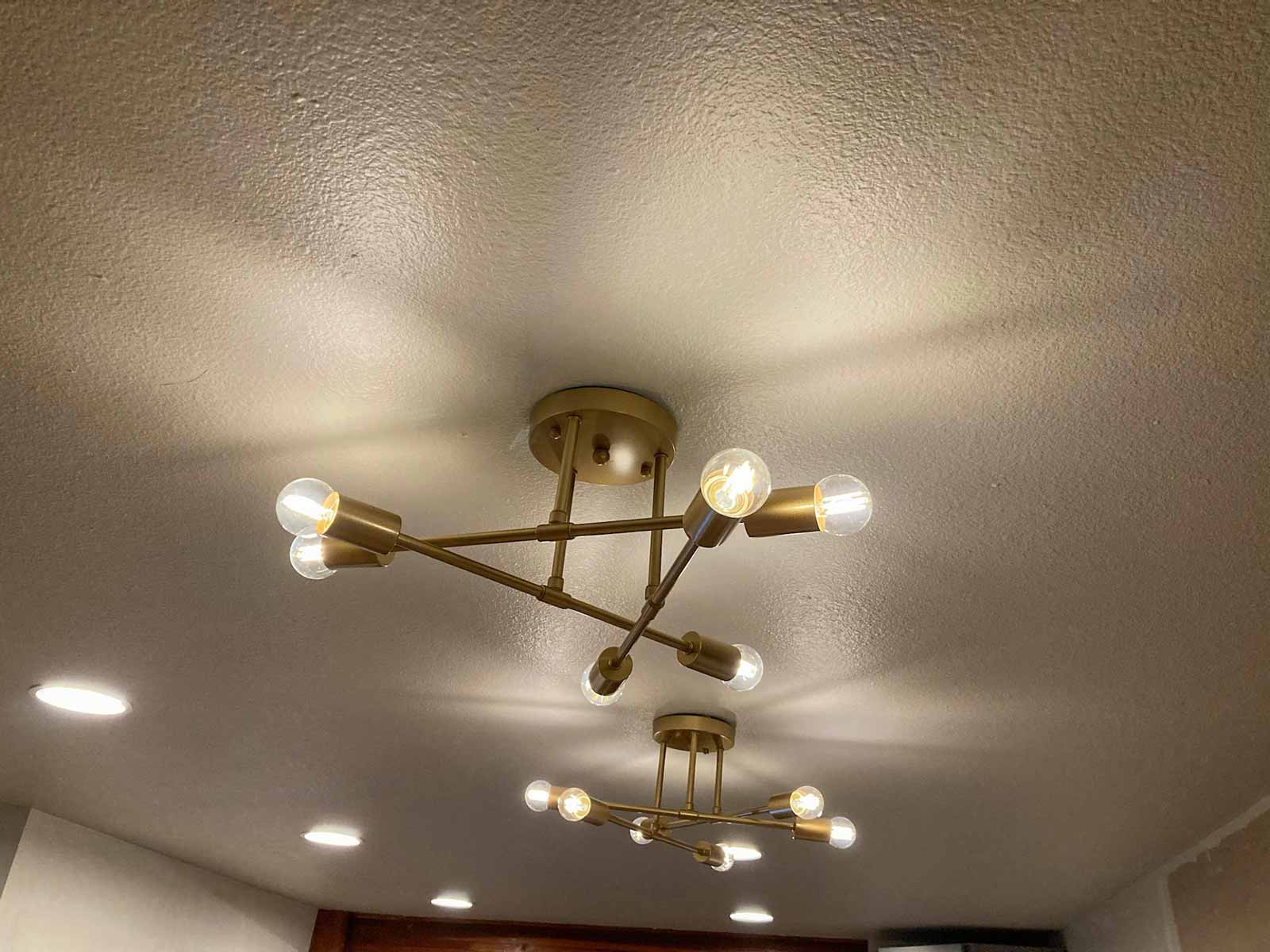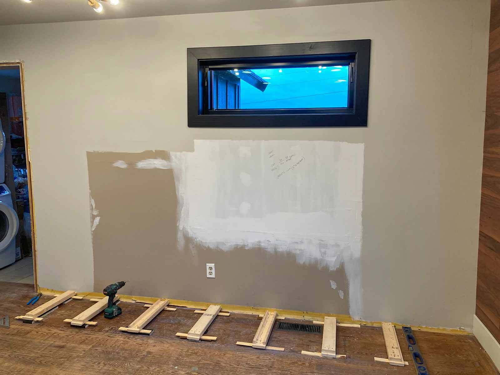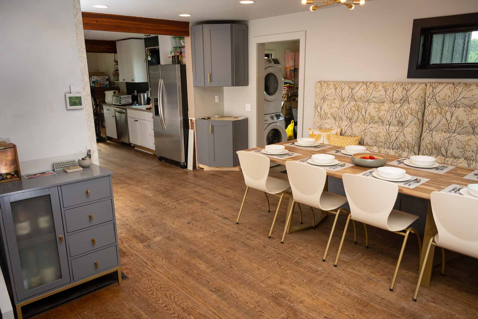 Once the new windows were installed, we were able to continue with the Dining Room, and take a break from the siding. We added two lights to hang over the dining table. We purchased a product called Wallplanks, in a walnut finish, to install on the front wall. It has adhesive on the back and is installed like shiplap, so it was relatively easy to put up in a day.