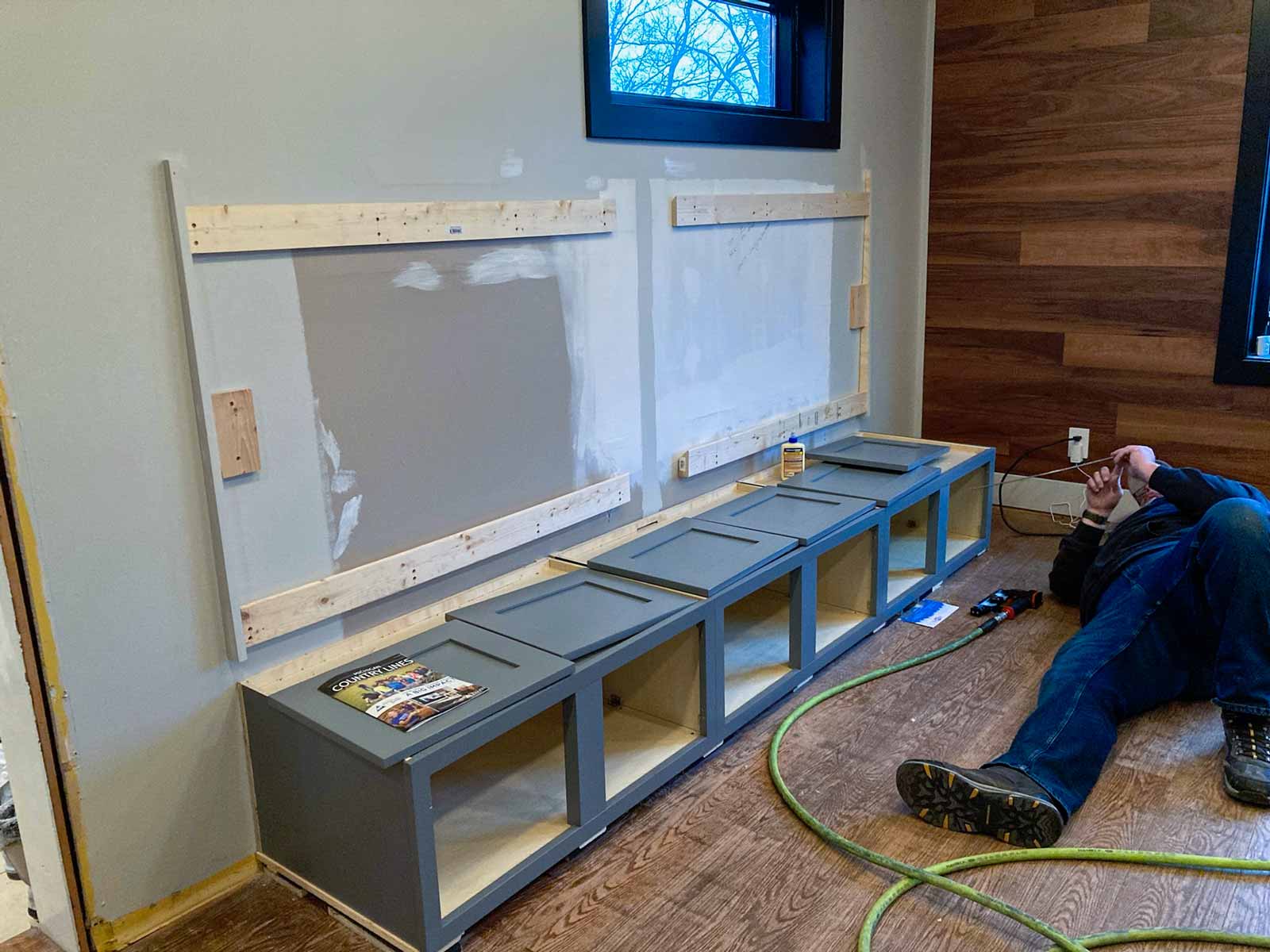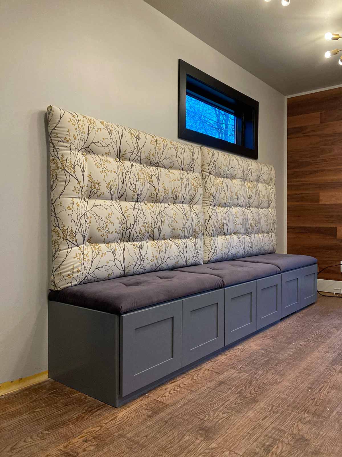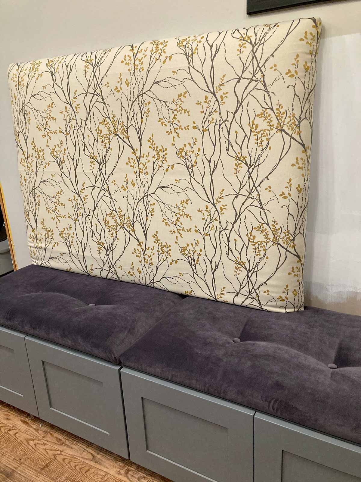 Since this is an old farmhouse, the floors, walls, etc. are not level. (Not even close!) So to begin the banquette project, Andy had to add strips at different heights to level the cabinets. We purchased two upholstery fabrics for the banquette: for the seat, a dark gray velvet, and for the back, a dark gray branch and leaf pattern on an off-white background- Myla Marigold Culp fabric.