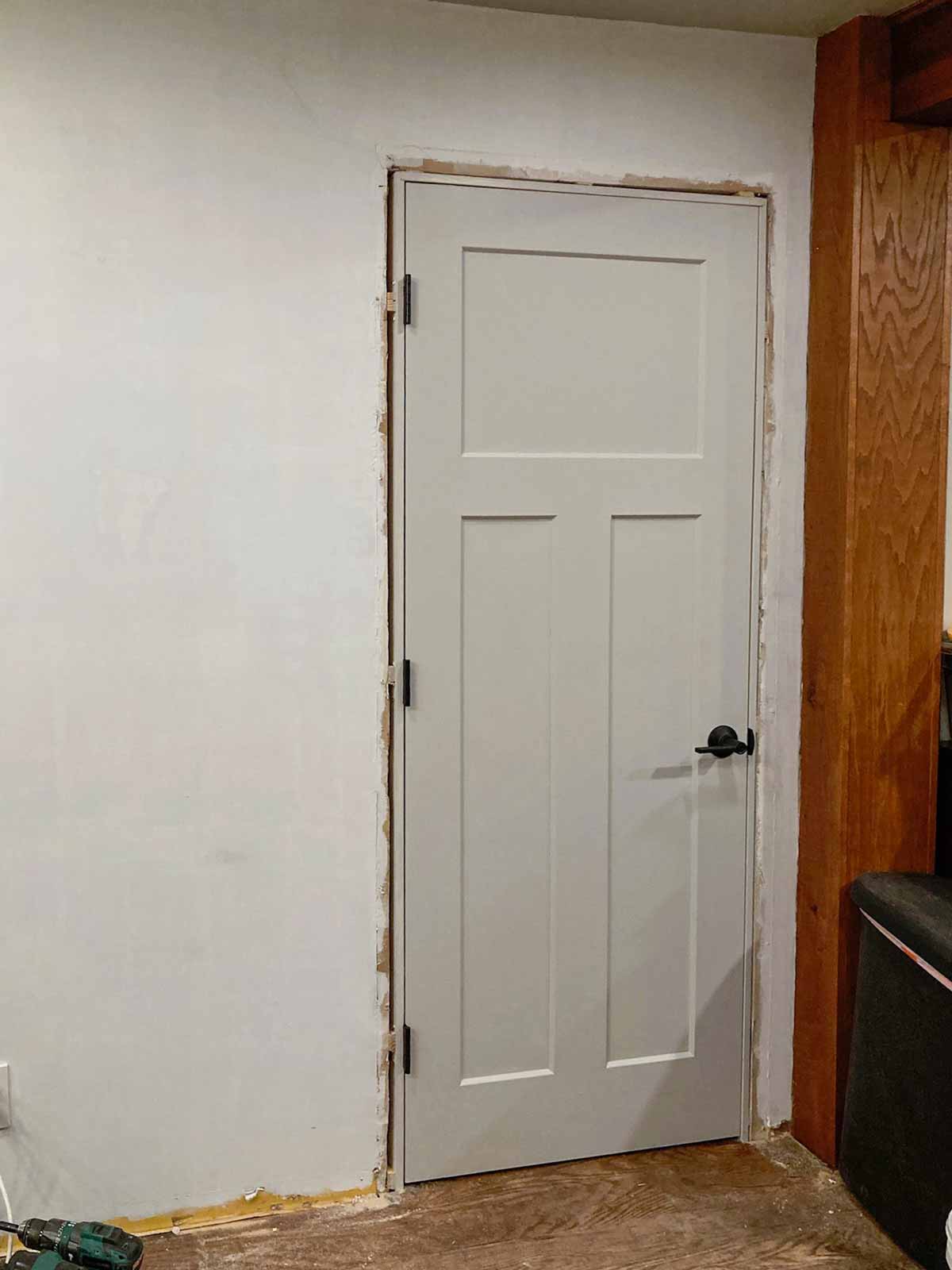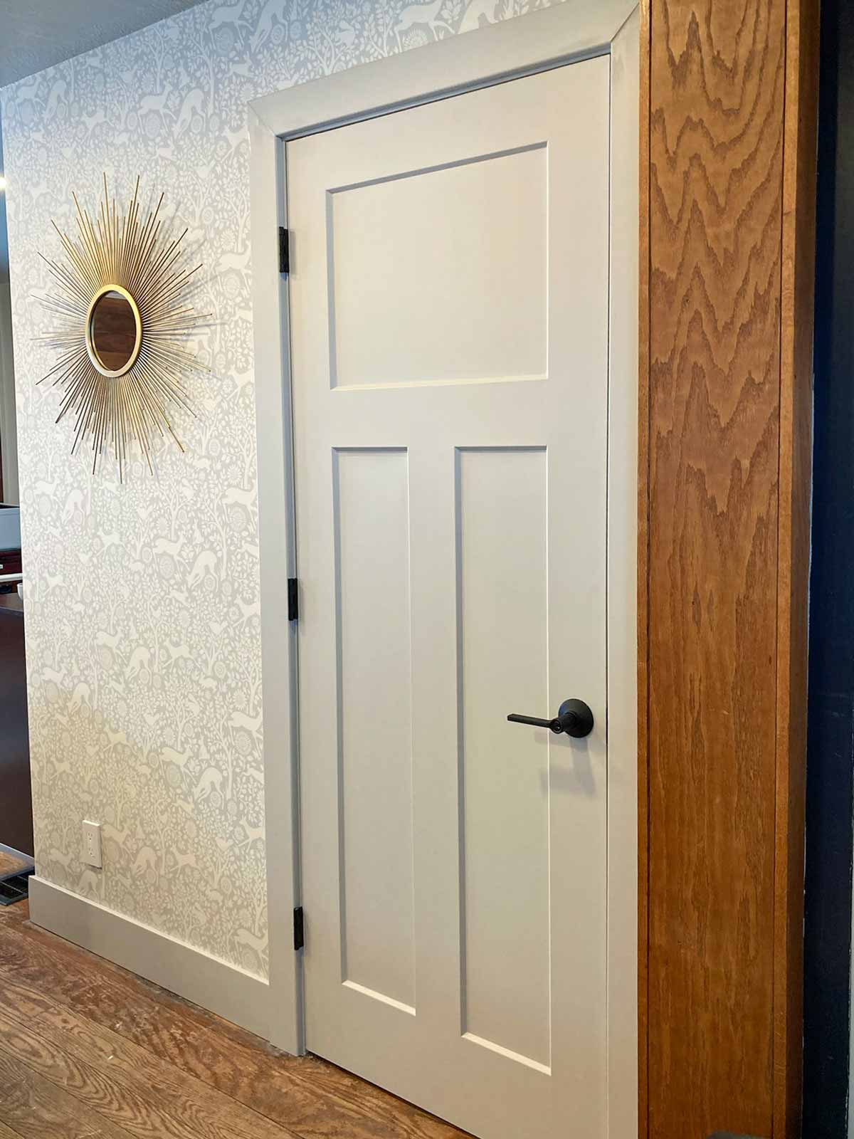Andy removed the old door and installed a craftsman style door. I added a wallpaper to that wall as an accent. It's a very subtle pattern with deer, rabbits, birds, trees and flowers. Purchased from Wayfair: Ericka Forest Fauna. The mirror is from Wayfair. Wall, ceiling and door paint color is Sherwin Williams Repose Gray.