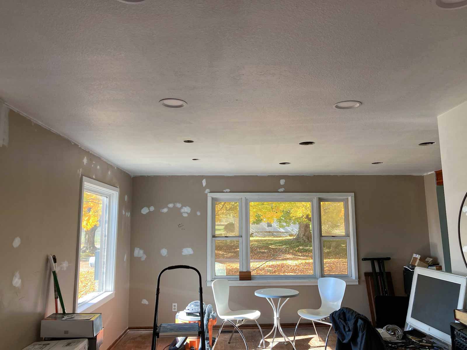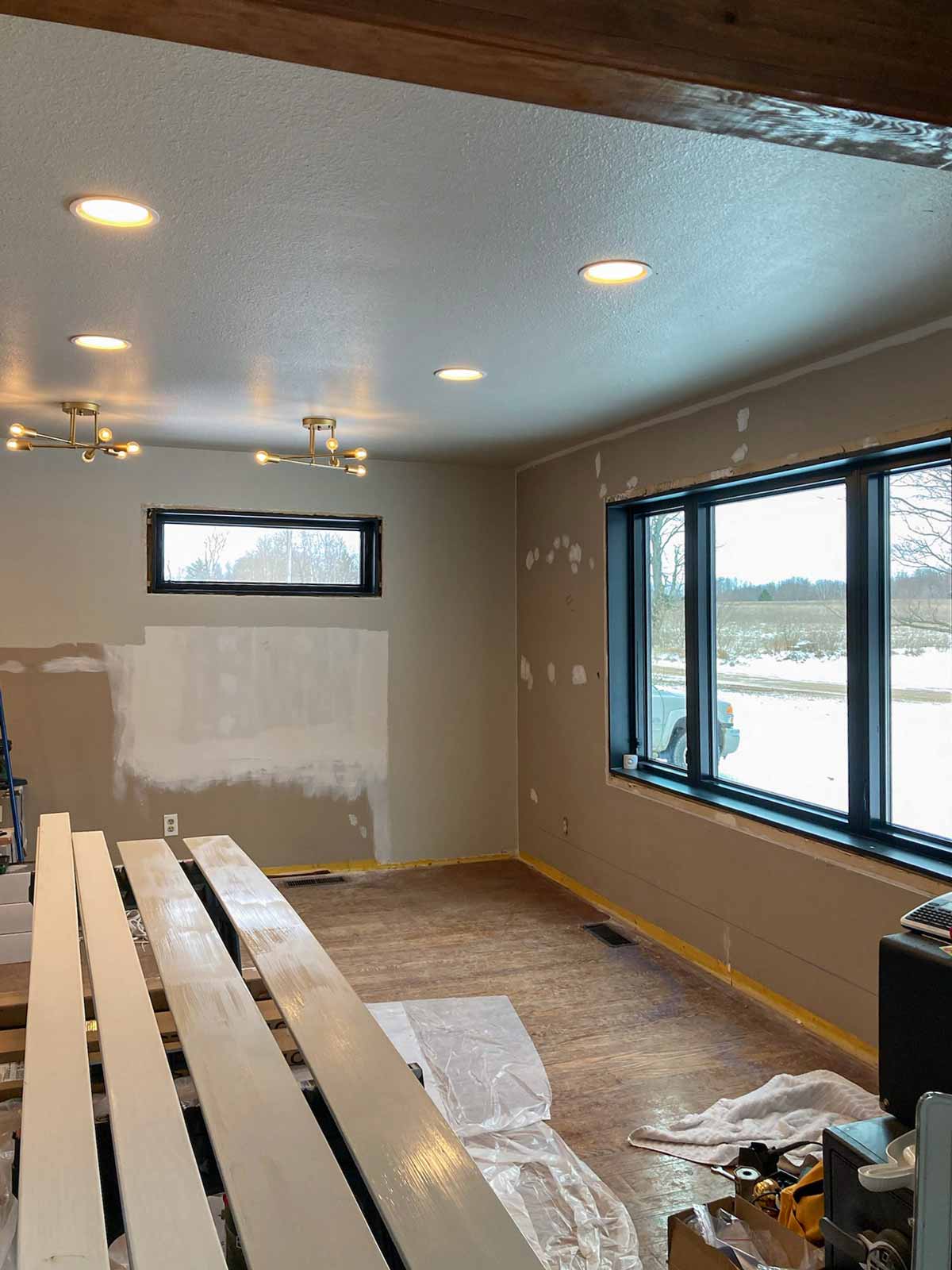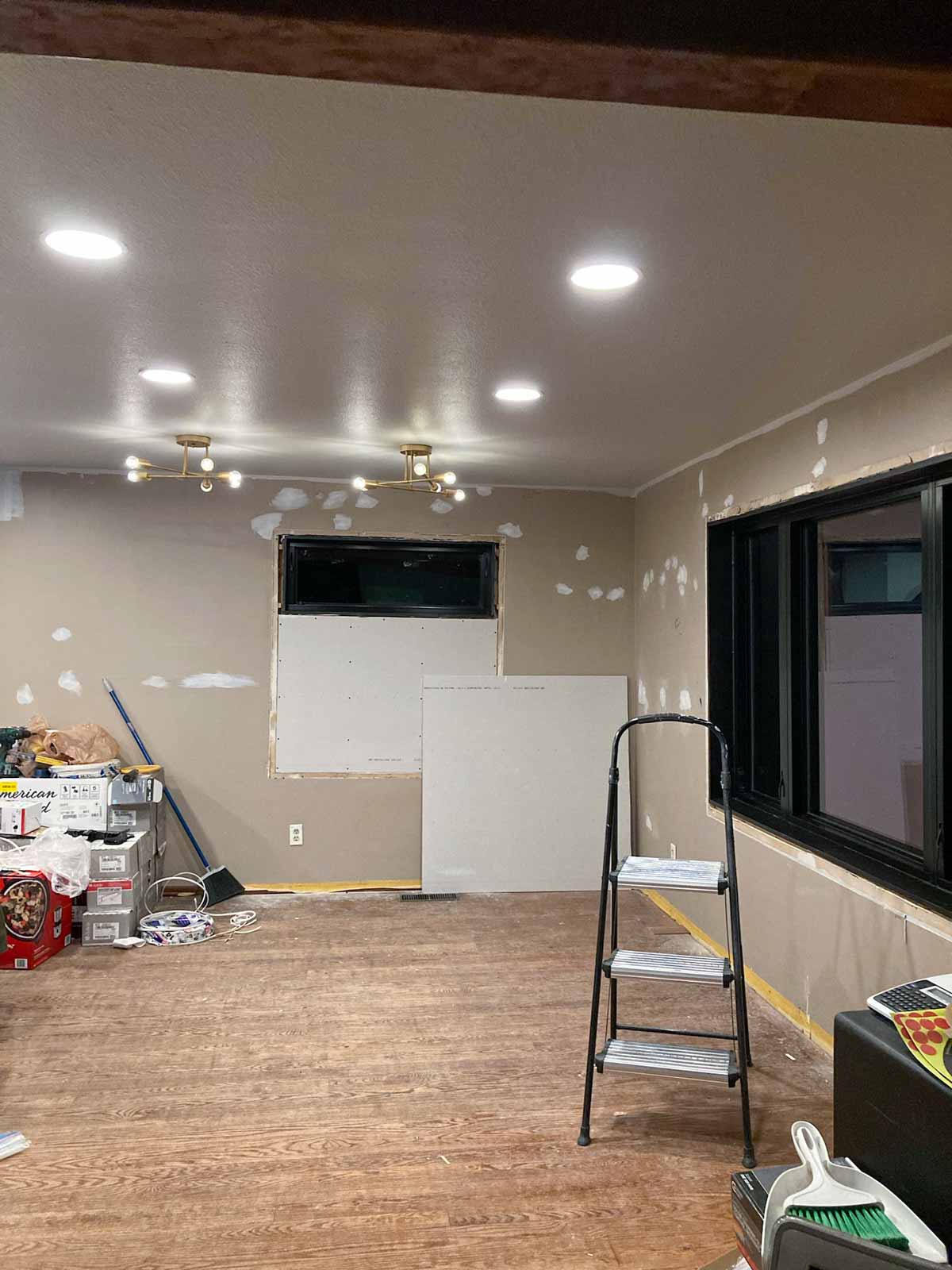 We began with repairs. The ceiling had some water damage from the upstairs bathroom. There was also a ceiling fan (on a low ceiling) that we removed so we needed to patch that hole. I removed the floating shelves and curtain rods, then spackled all holes. The only lighting in the room was from the ceiling fan that we removed. So we added recessed lighting throughout the room. We knew we needed to add some storage, so we purchased two corner cabinets to install as you enter from the mud room.