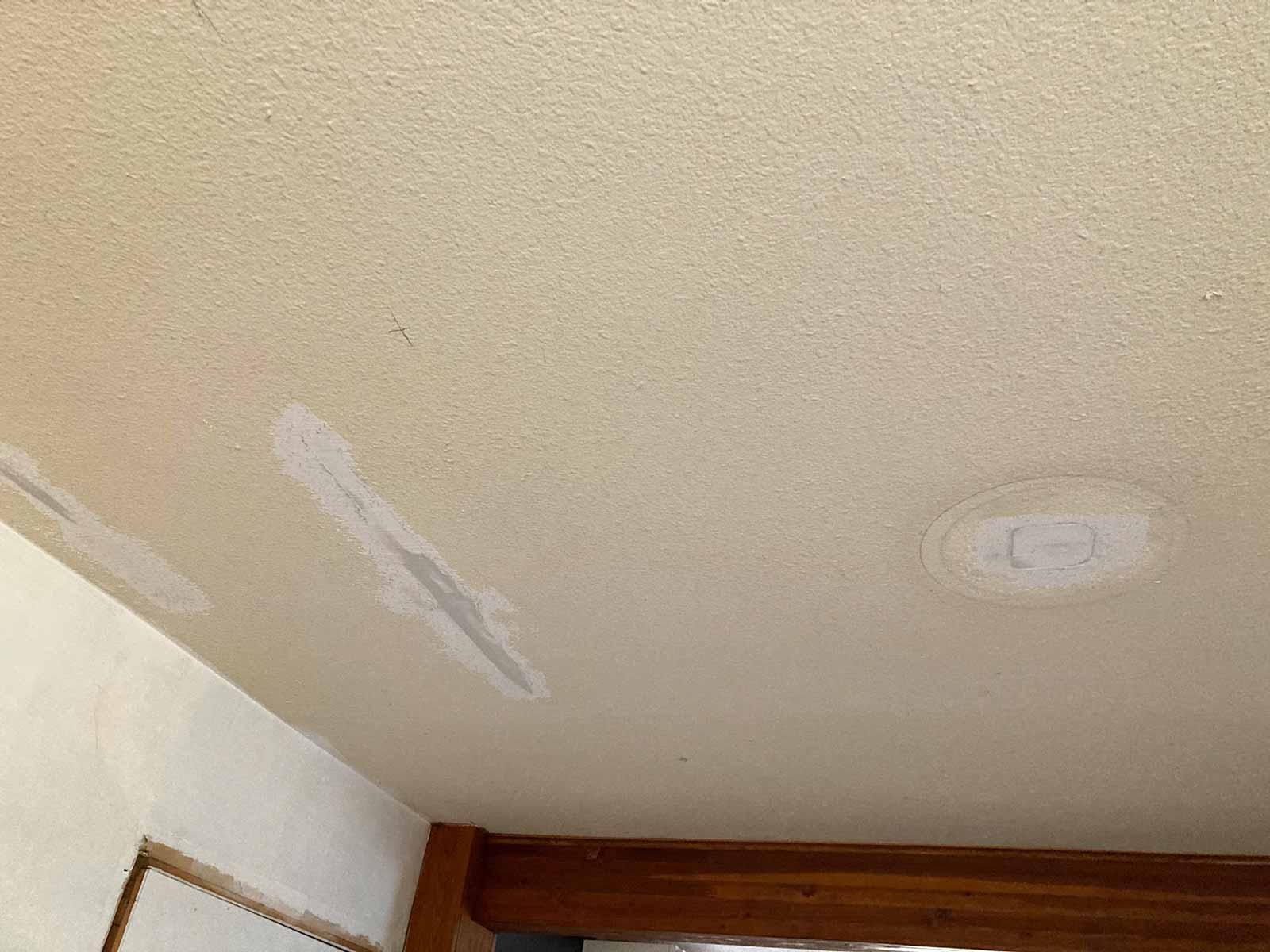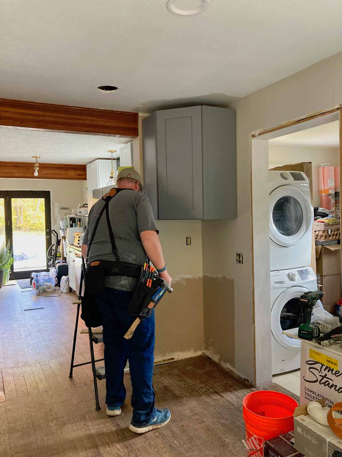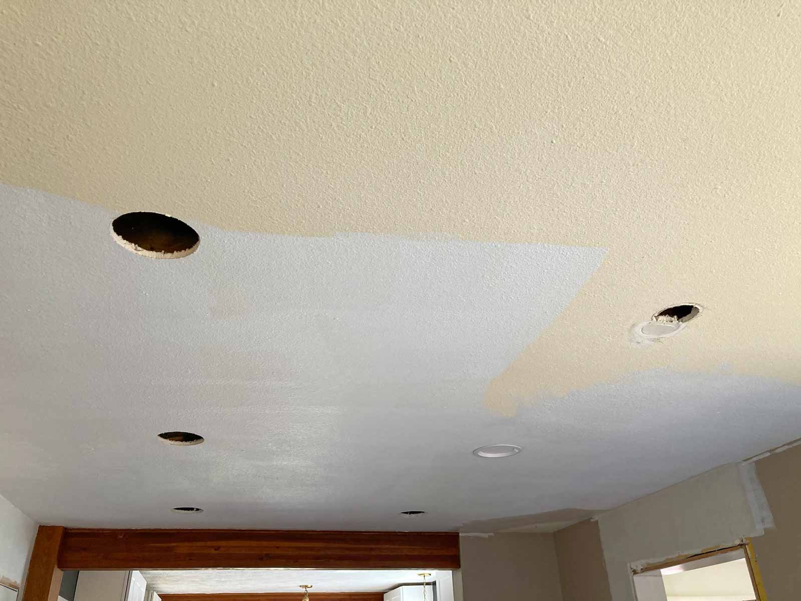 We began with repairs. The ceiling had some water damage from the upstairs bathroom. There was also a ceiling fan (on a low ceiling) that we removed so we needed to patch that hole. I removed the floating shelves and curtain rods, then spackled all holes. The only lighting in the room was from the ceiling fan that we removed. So we added recessed lighting throughout the room. We knew we needed to add some storage, so we purchased two corner cabinets to install as you enter from the mud room.