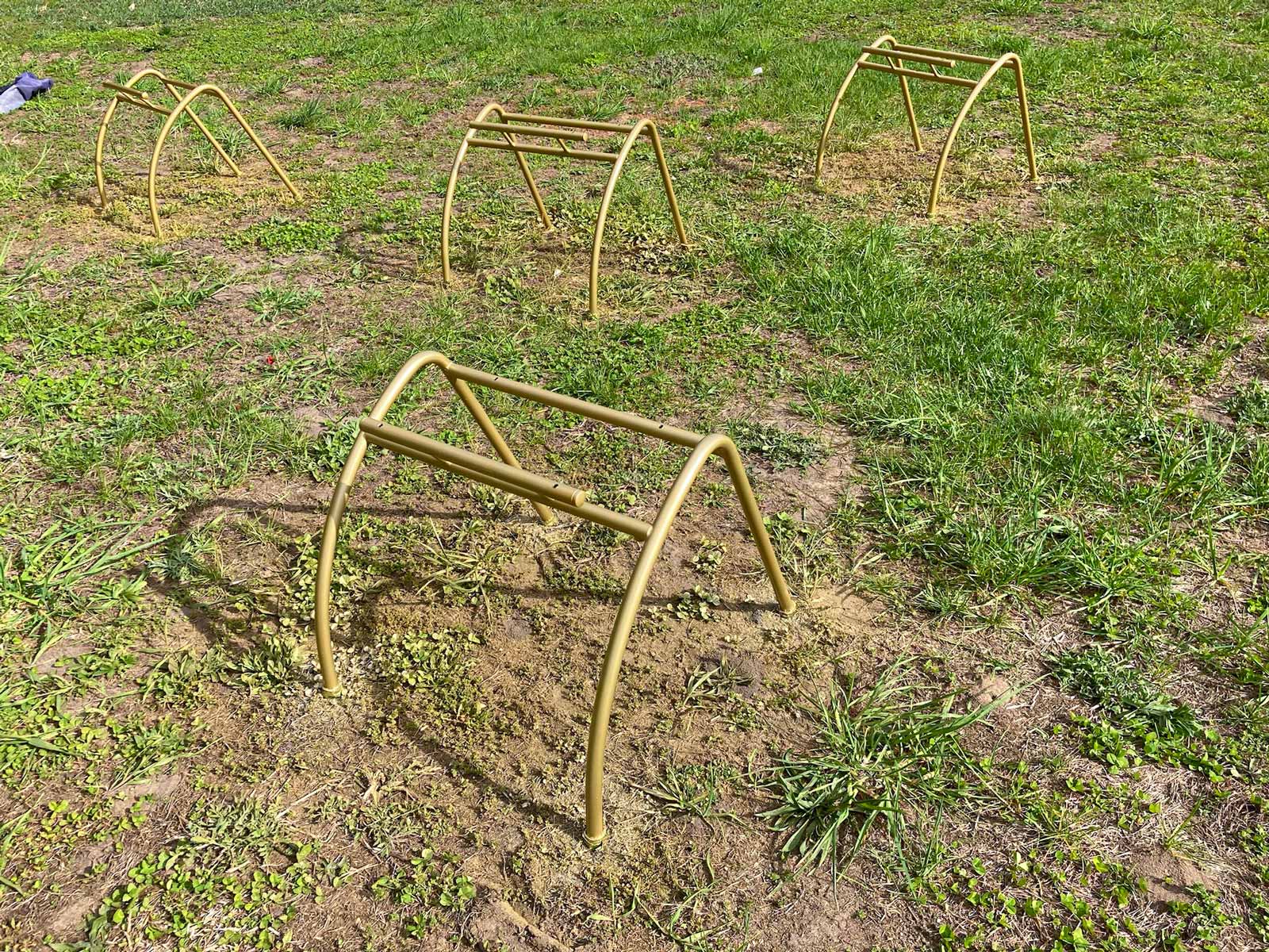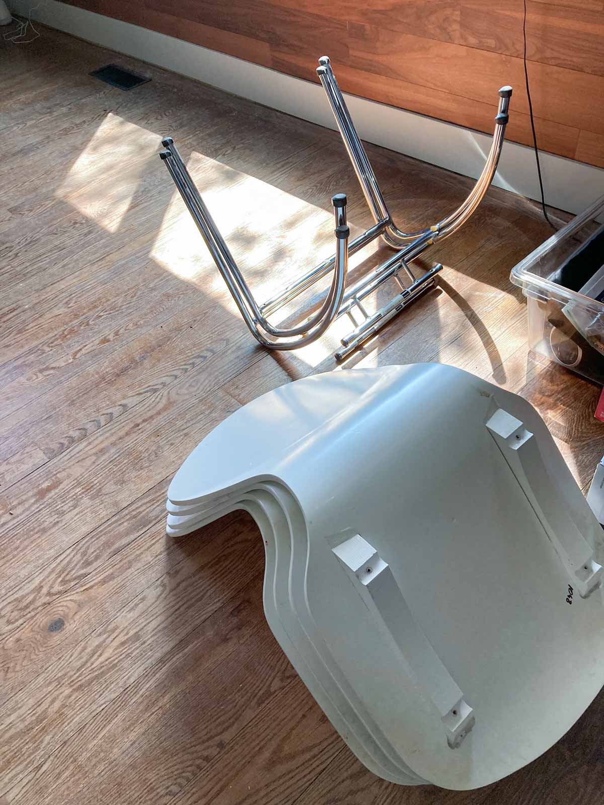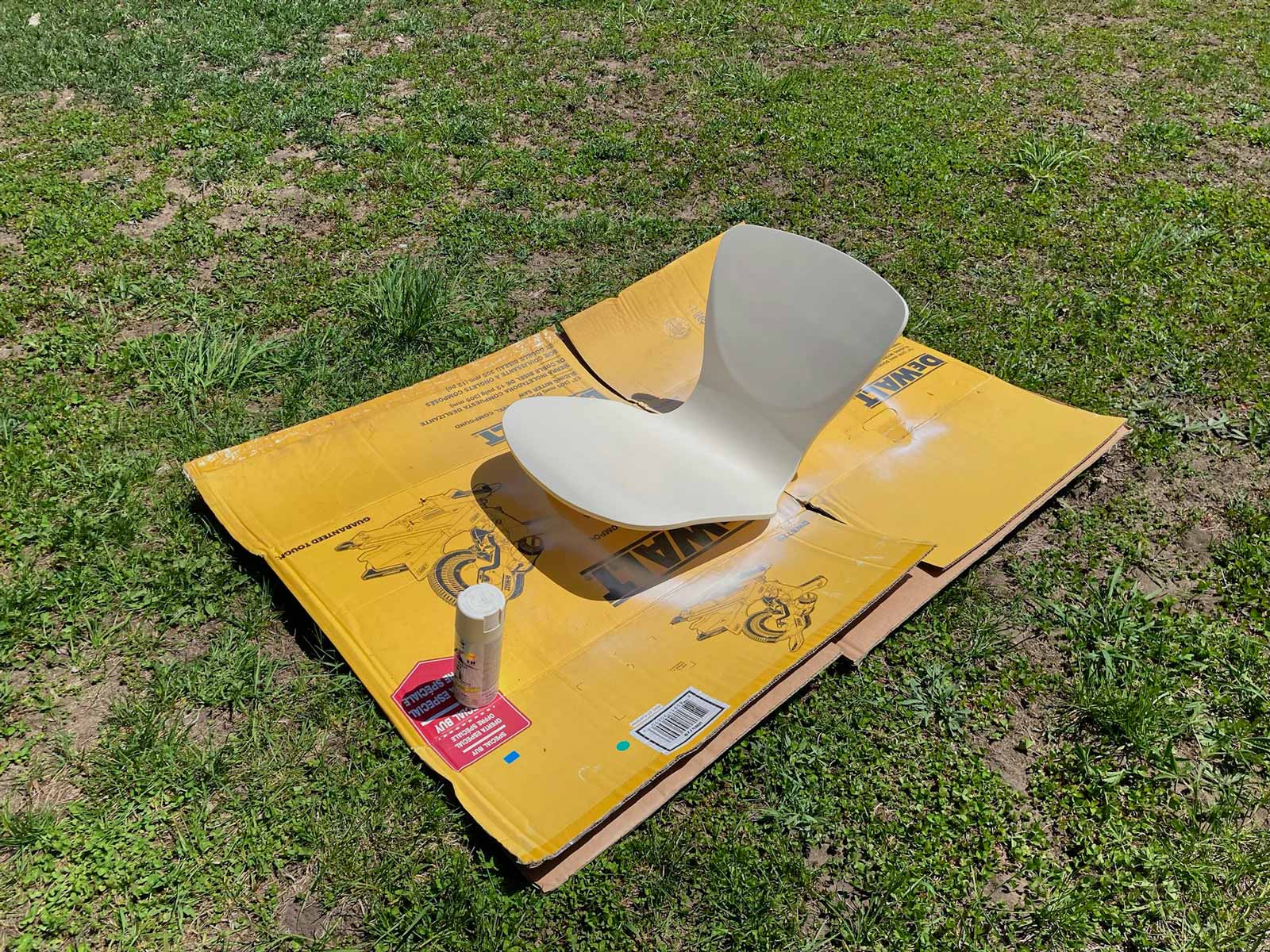 We received these four chairs for free. They are worn, but comfortable and strong. They had chrome legs and were bright white. So we decided to keep them. We painted the seats in an off-white, as well as a clear protective coat. We painted the legs gold to match the table legs.