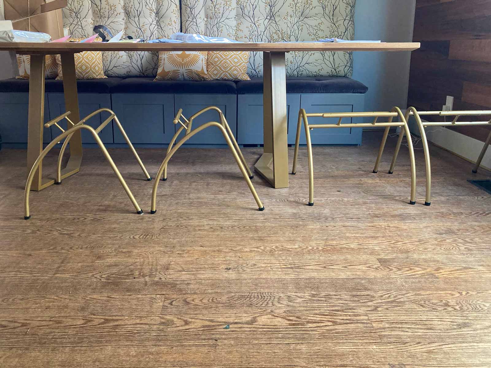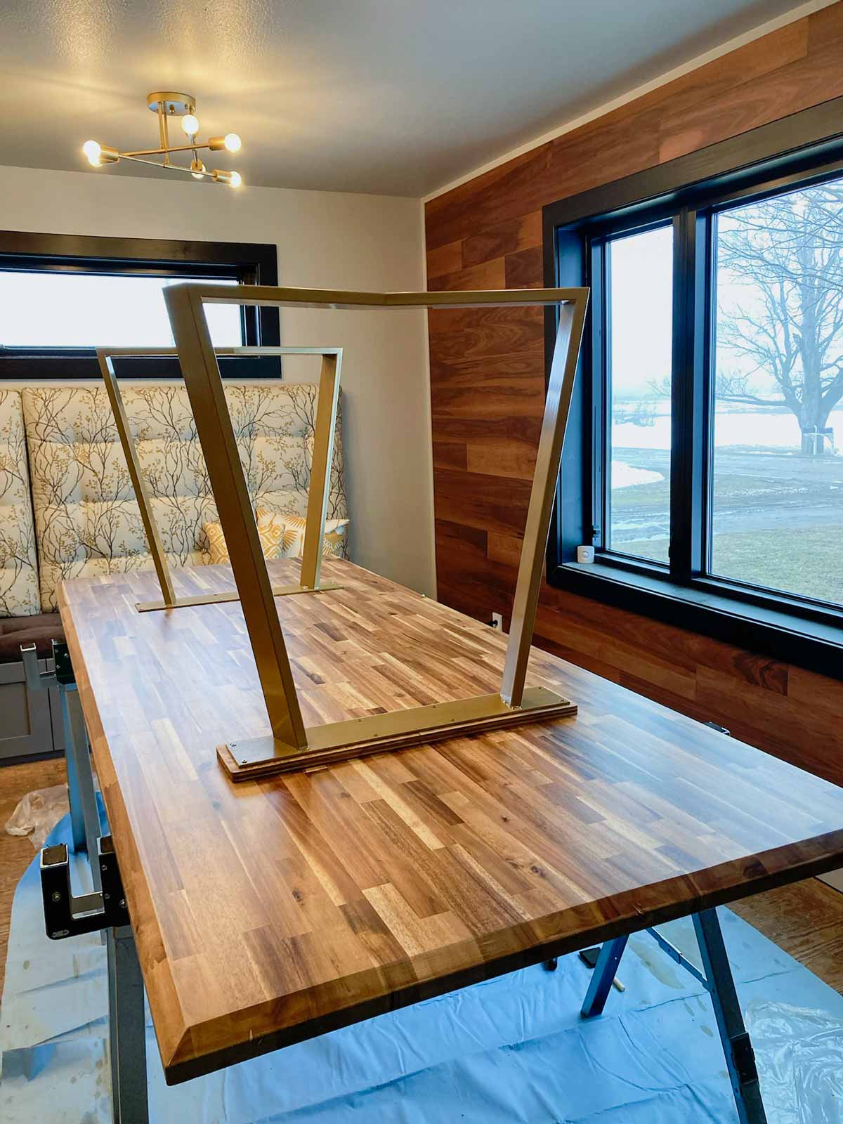 Clamps, sanding, and finishing with special walnut stain and a matte water-based polyurethane. We purchased dining table legs in gold from Etsy (Made in Poland).