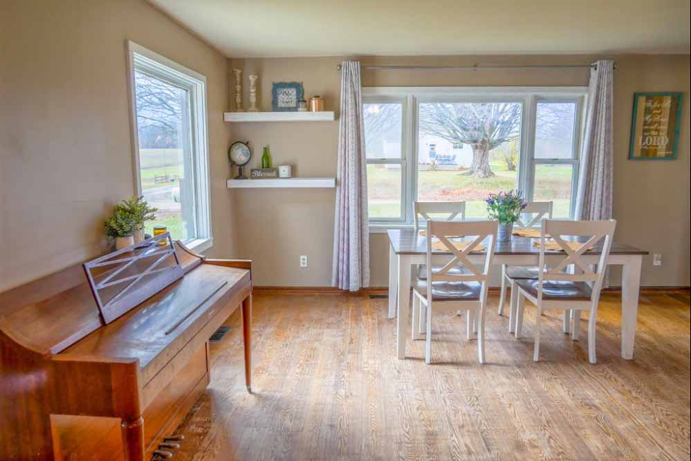 The previous owner had their dining table in front of the large window at the front of the house. They also had some floating shelves, window treatments and a spinet piano, next to the mud room entrance. When we moved in, the shelves, curtains and PIANO were still in the room. The piano was immediately moved outdoors. You'll see that later.