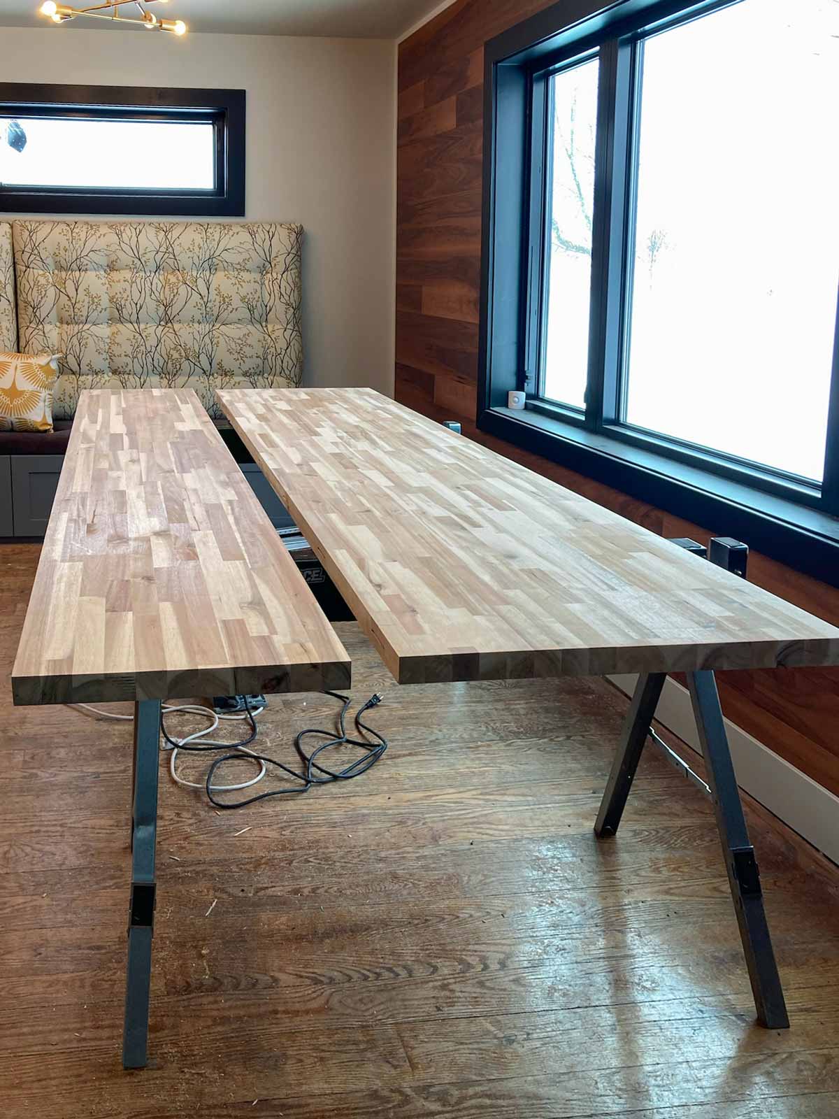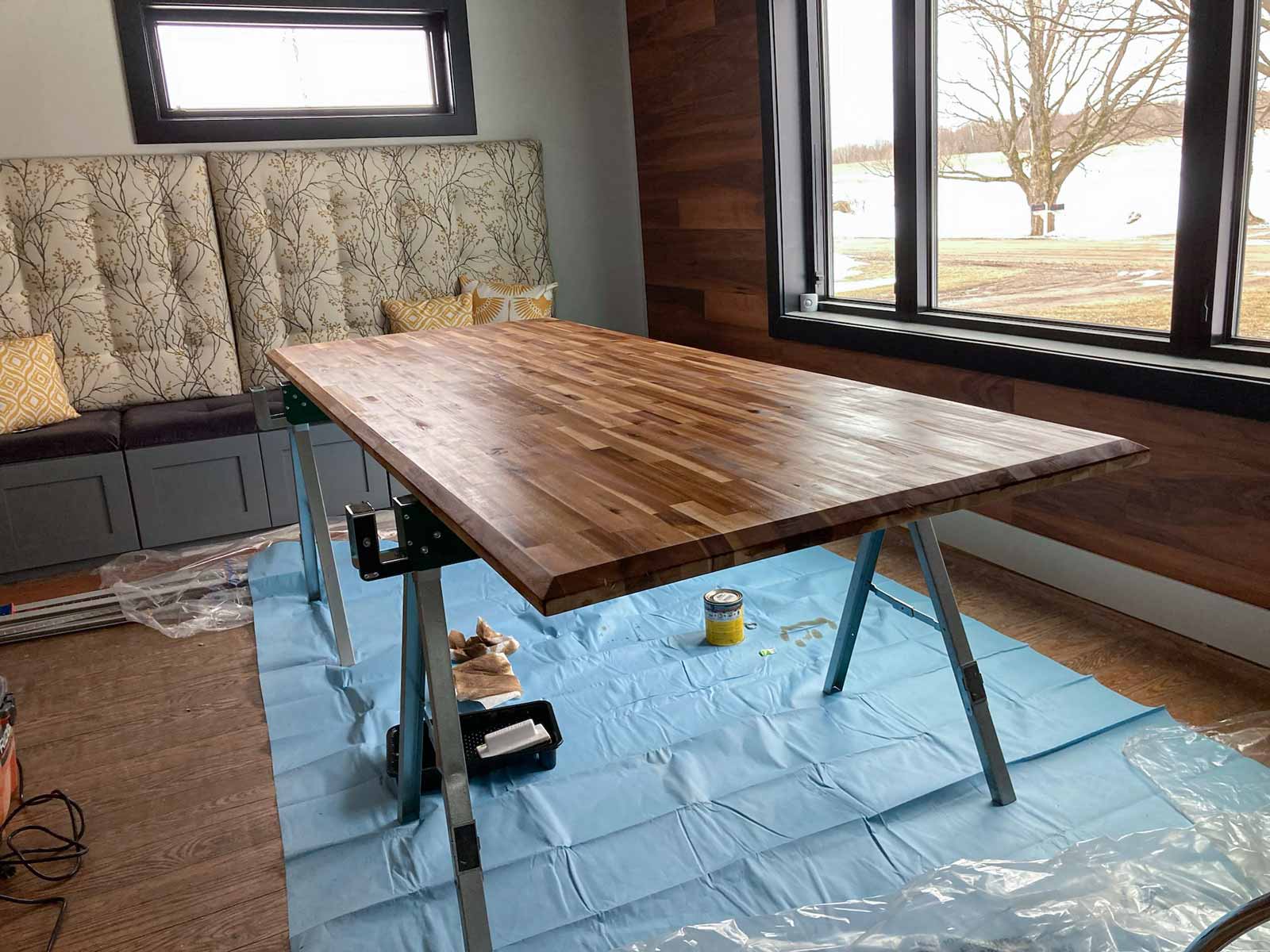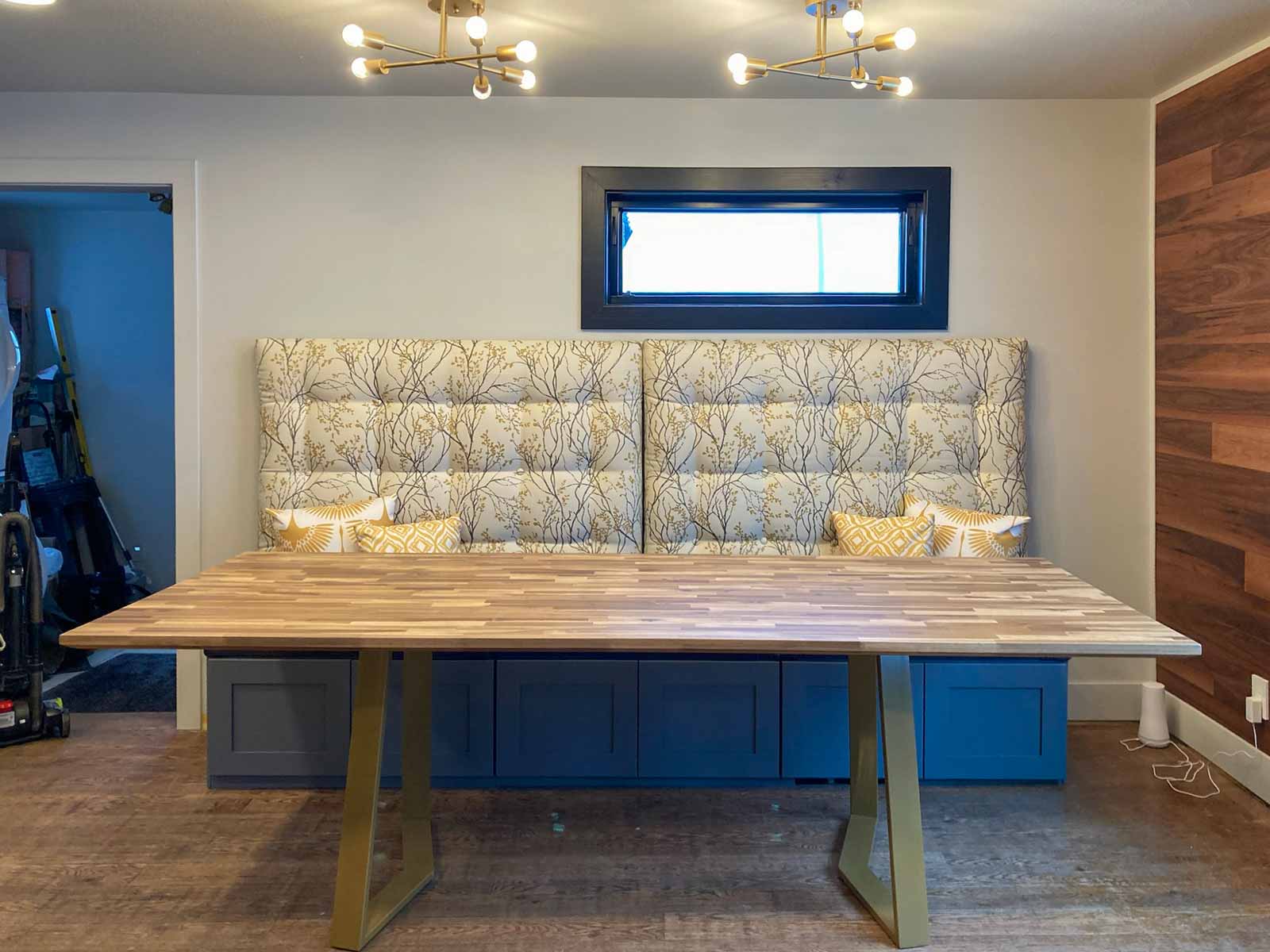 We knew we wanted to make a custom table, given the custom size of the banquette. So we purchased two butcher block countertops from Home Depot. Andy cut them to the correct width and length and joined the two pieces together.