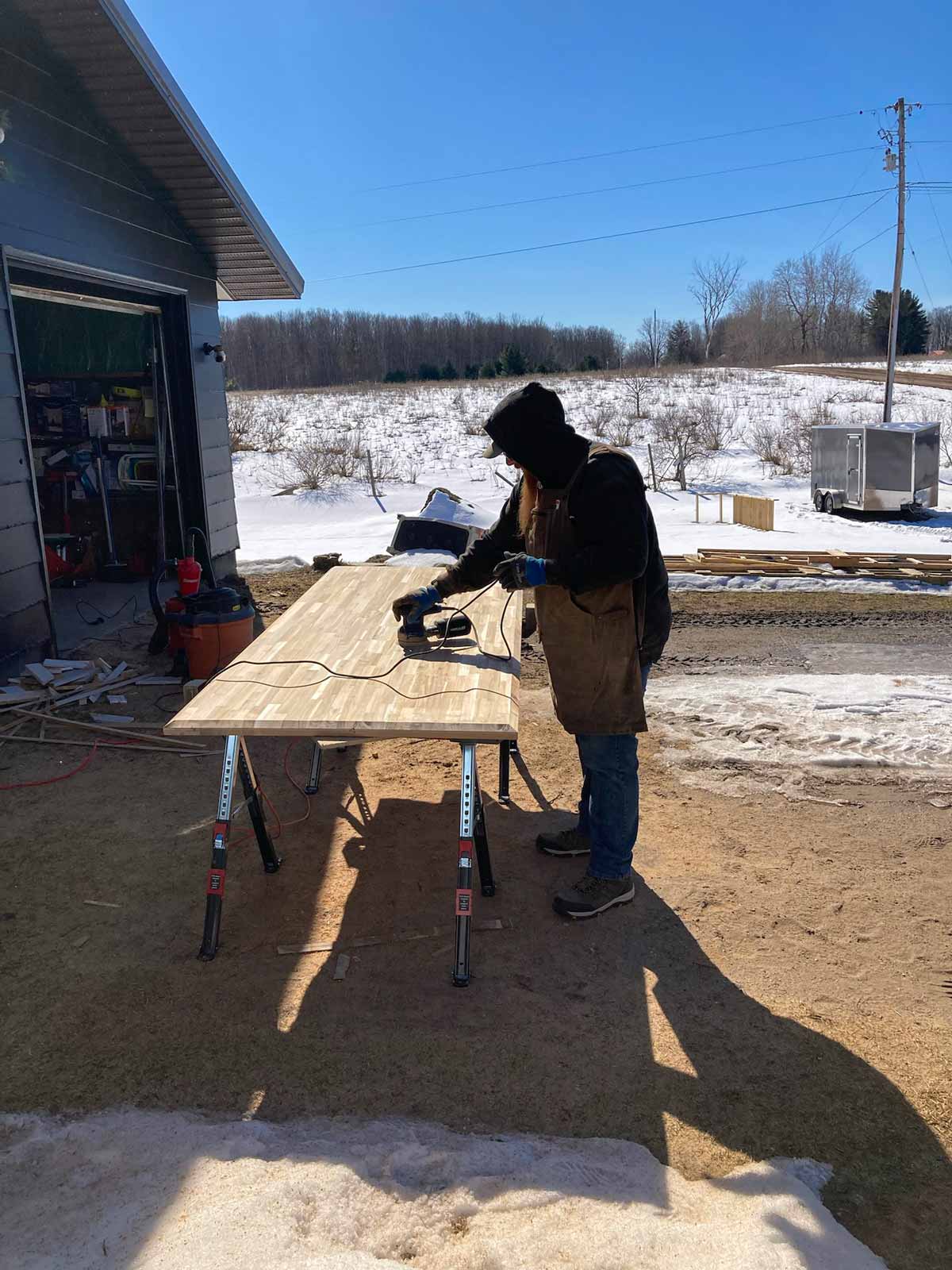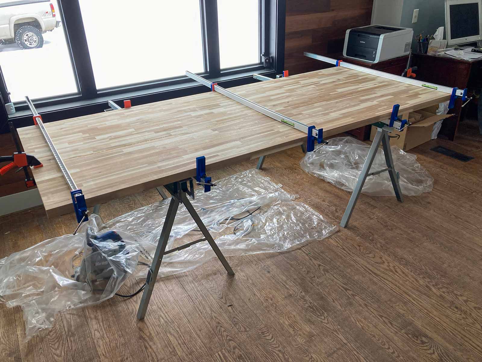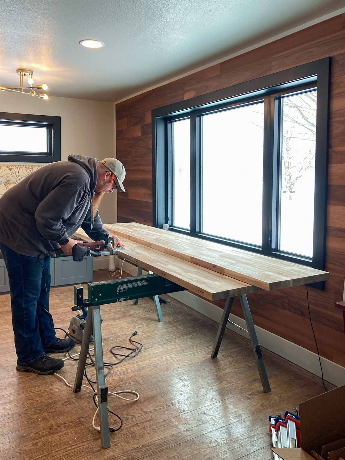 We knew we wanted to make a custom table, given the custom size of the banquette. So we purchased two butcher block countertops from Home Depot. Andy cut them to the correct width and length and joined the two pieces together.