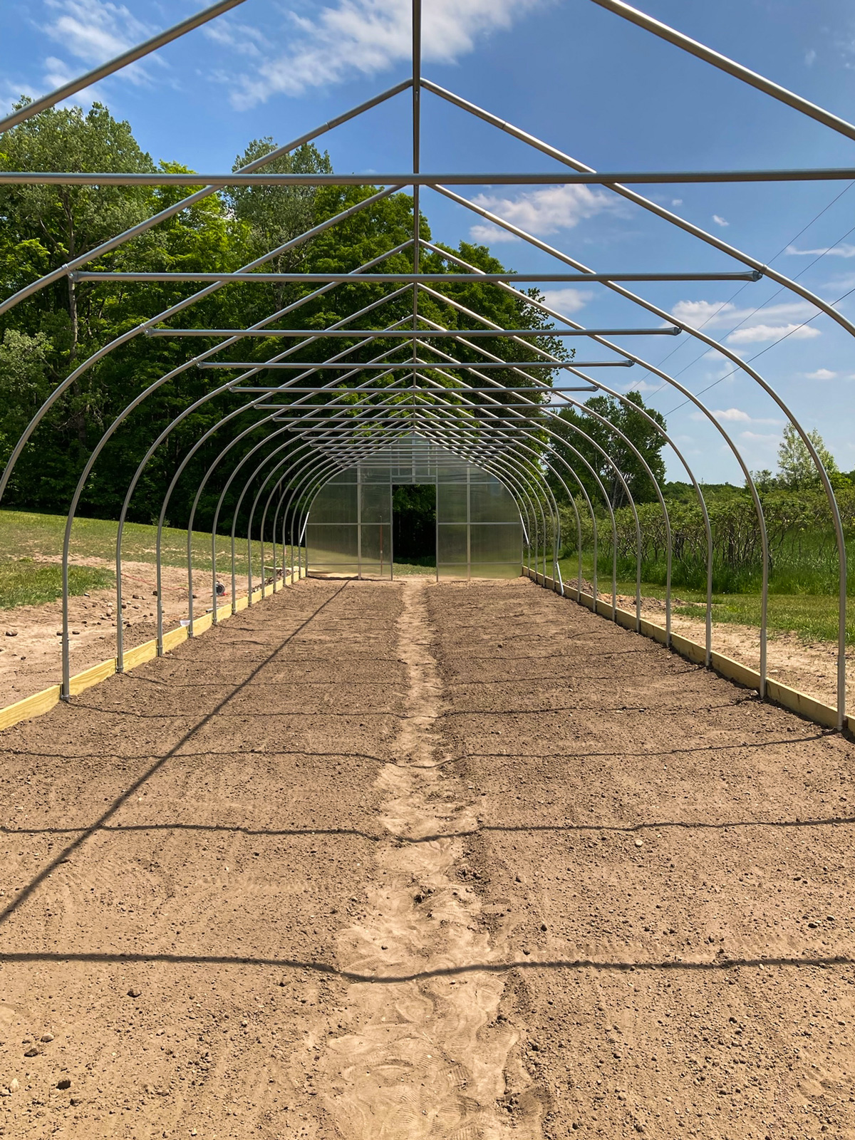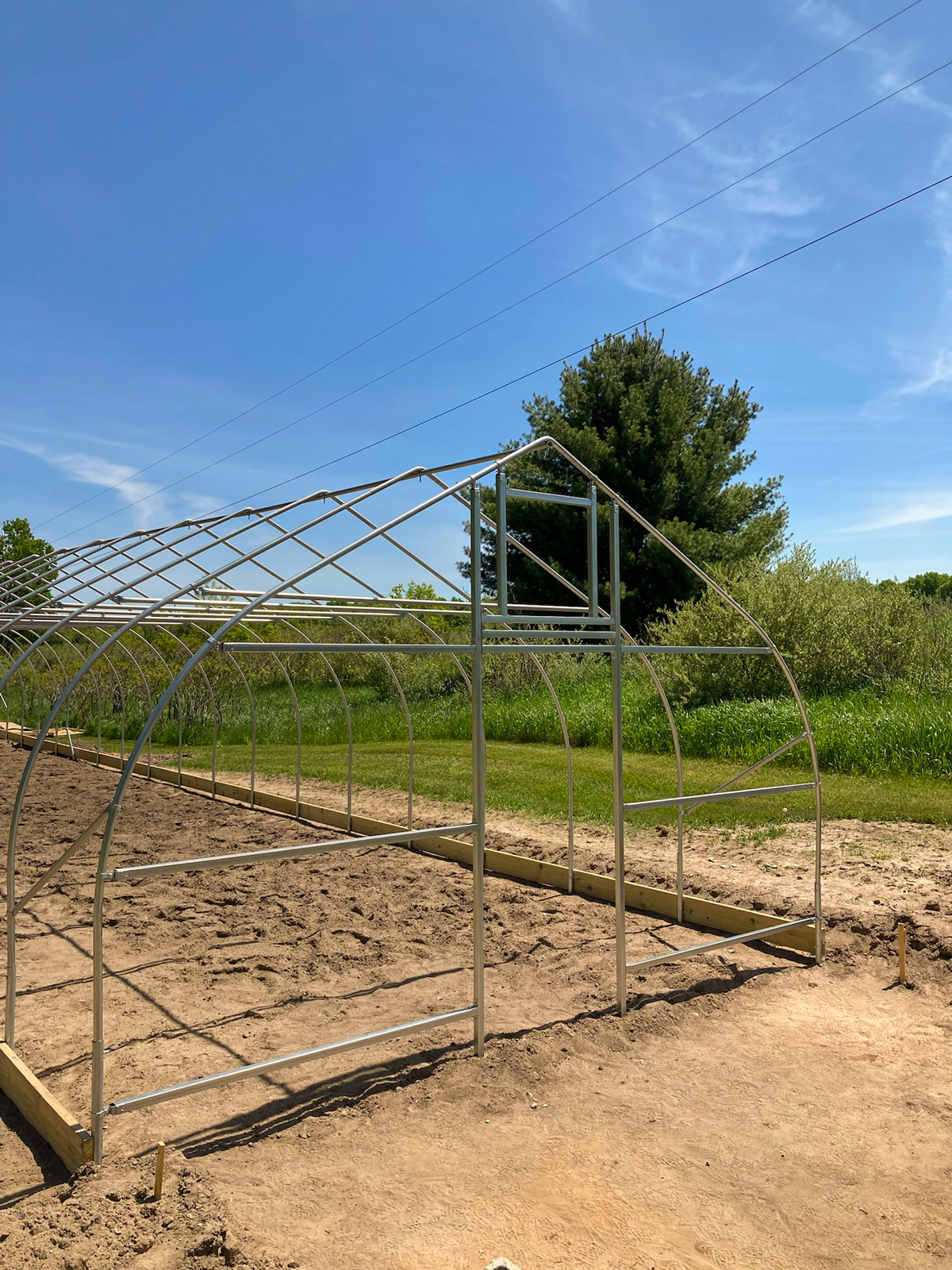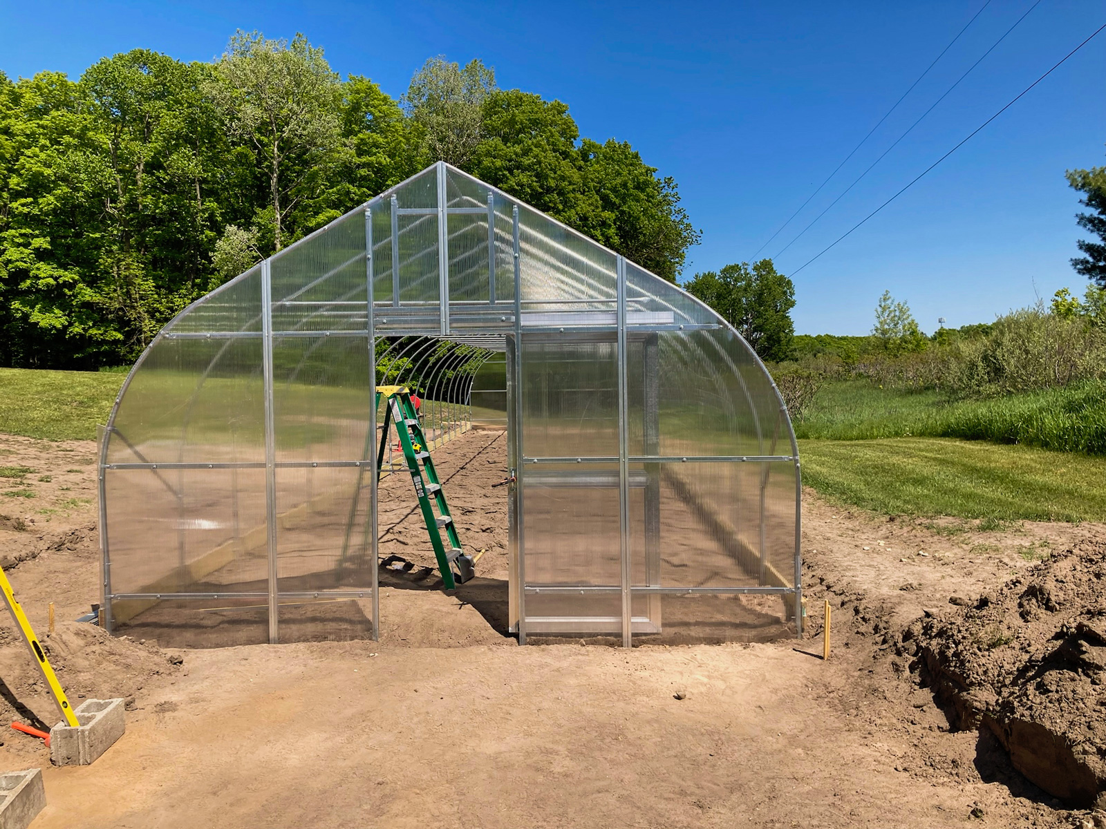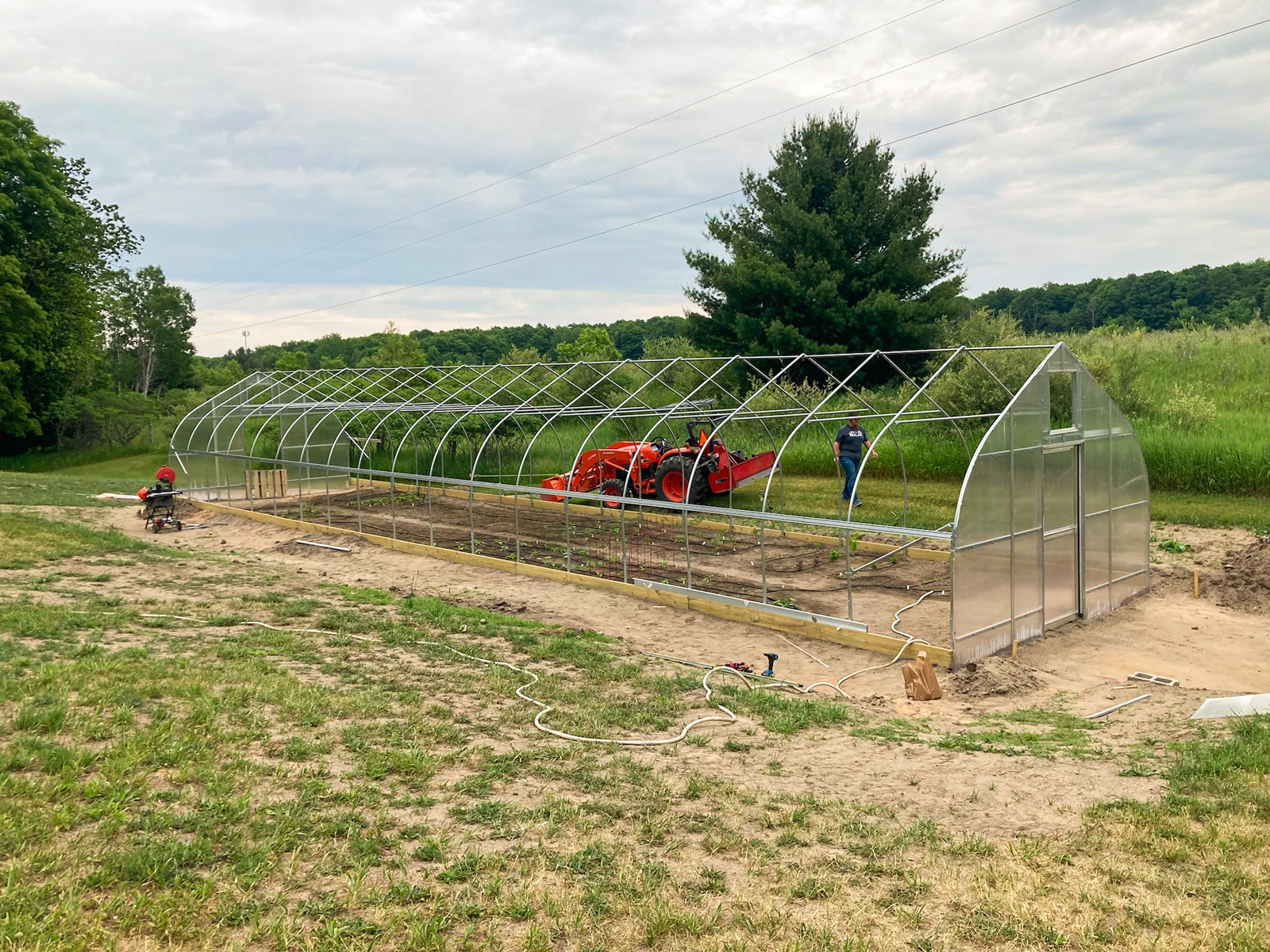 With our first spring and summer behind us, we learned that northern Michigan has a lot of unexpected frosts. So, we decided it would be beneficial to install a garden structure to extend our growing season of fruits and vegetables. We purchased a kit online from Rimol Greenhouse systems.
