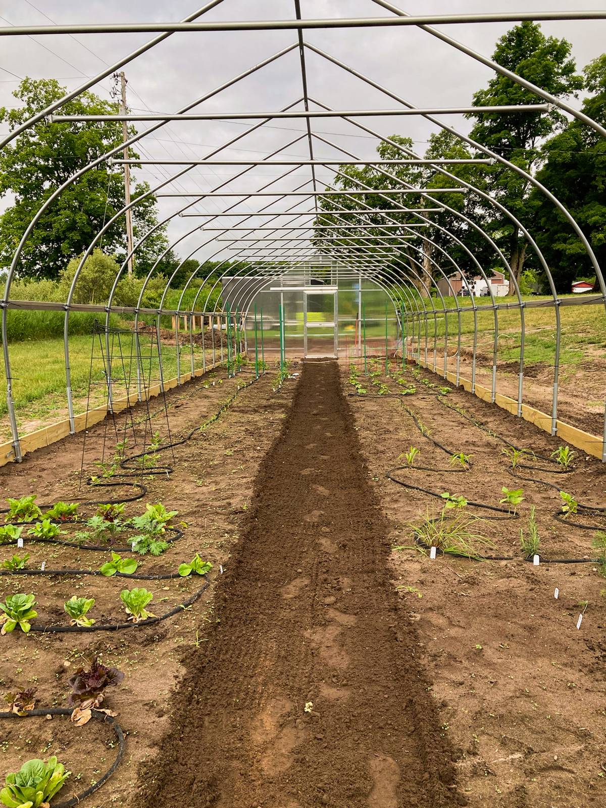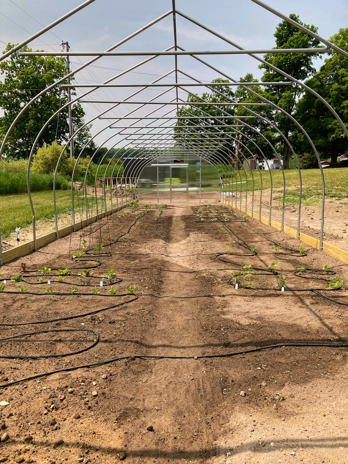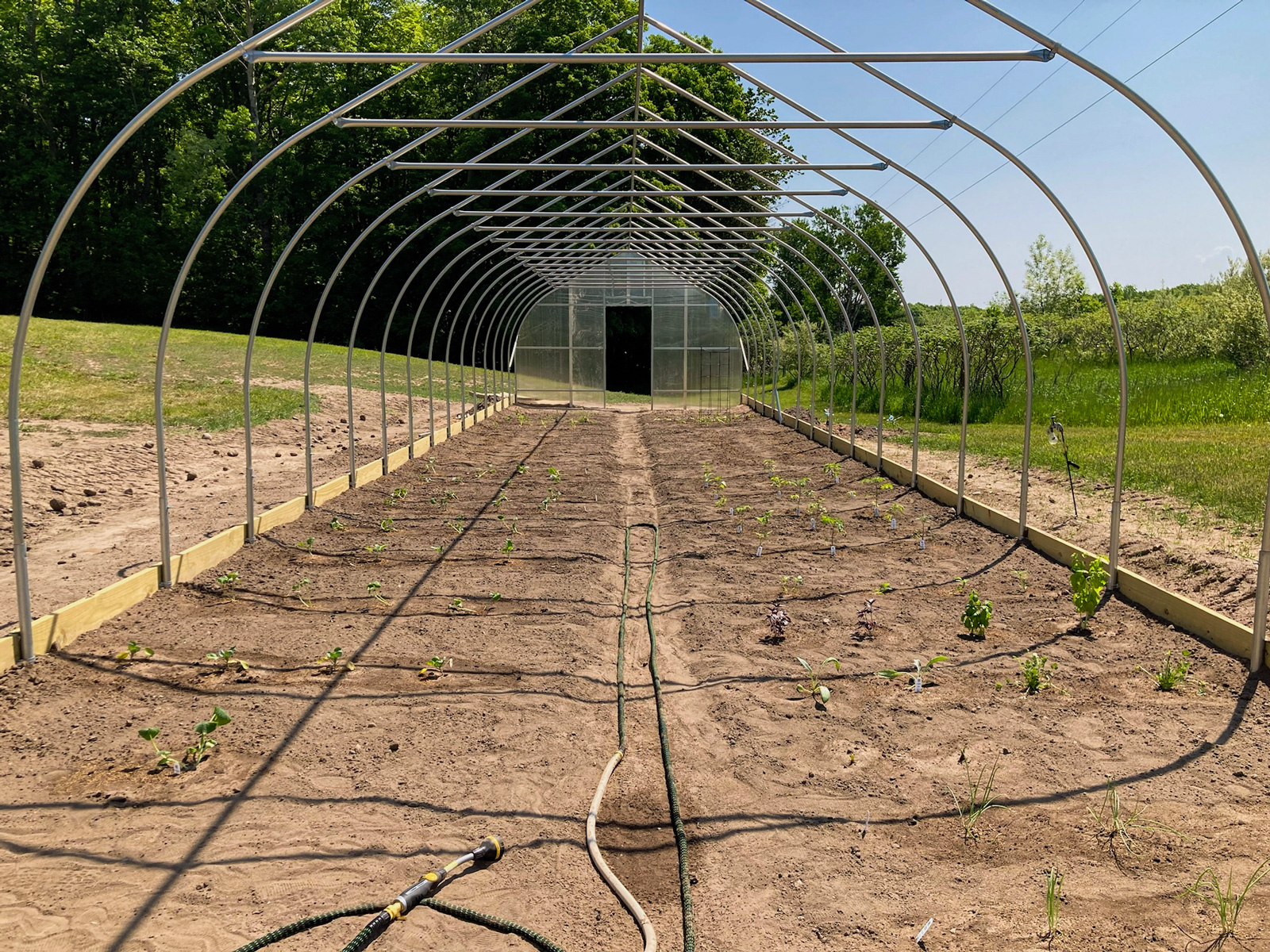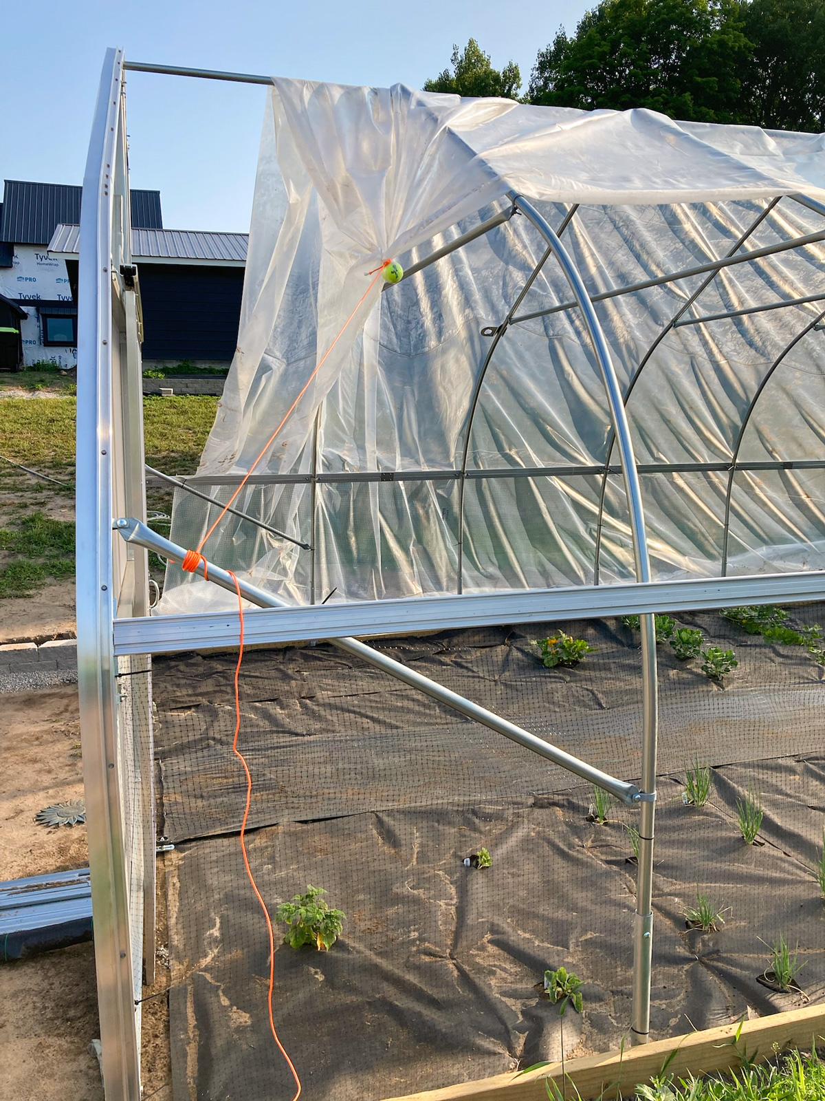 With our first spring and summer behind us, we learned that northern Michigan has a lot of unexpected frosts. So, we decided it would be beneficial to install a garden structure to extend our growing season of fruits and vegetables. We purchased a kit online from Rimol Greenhouse systems.