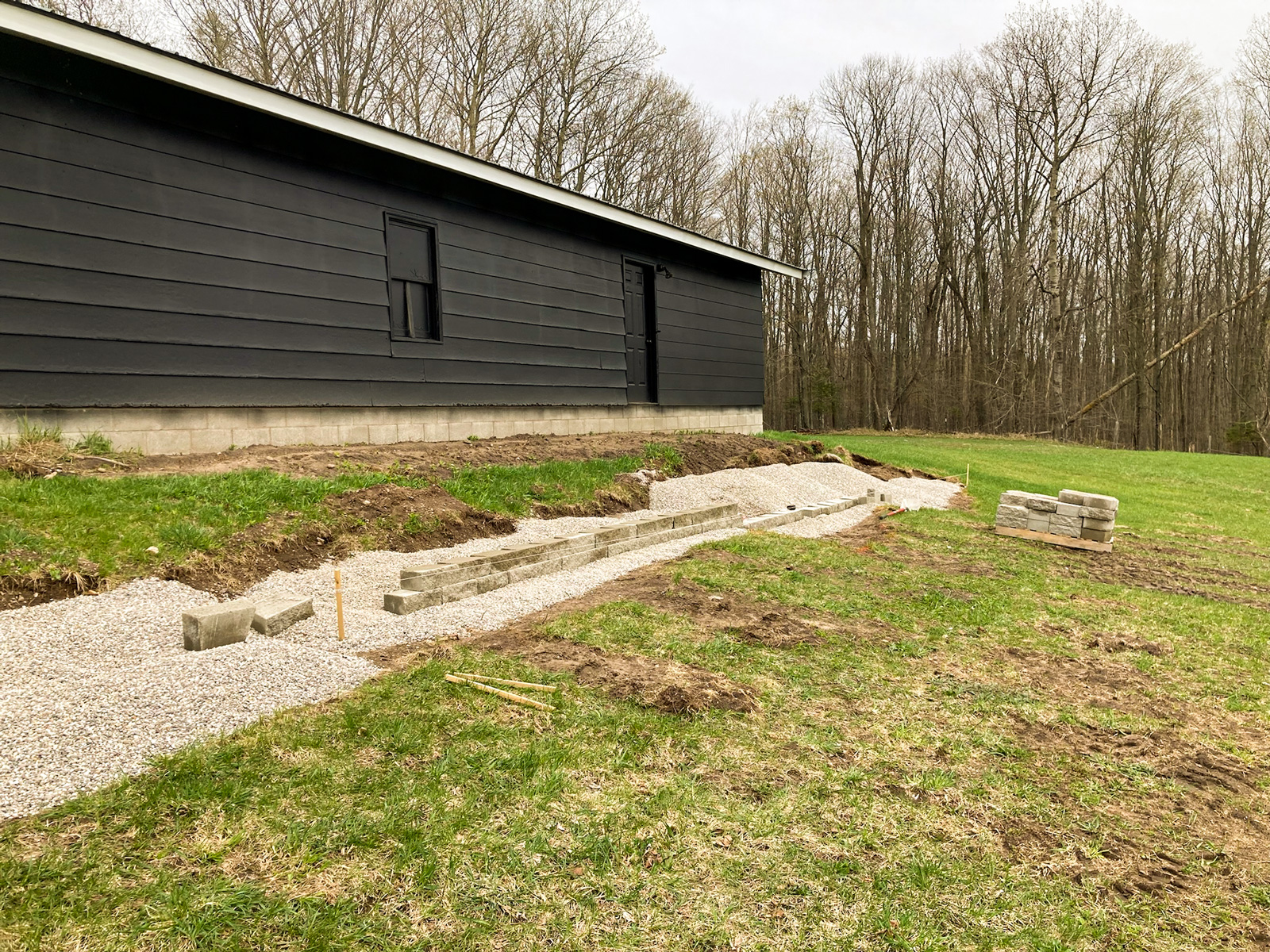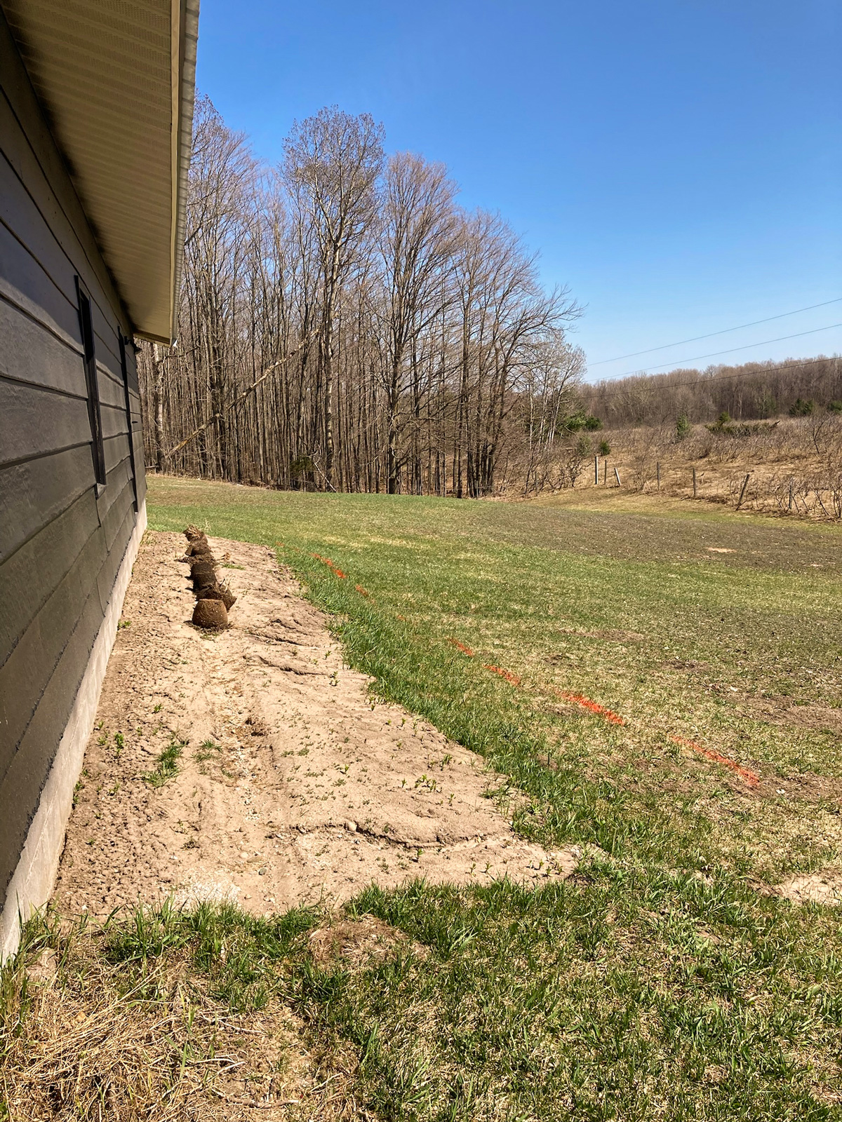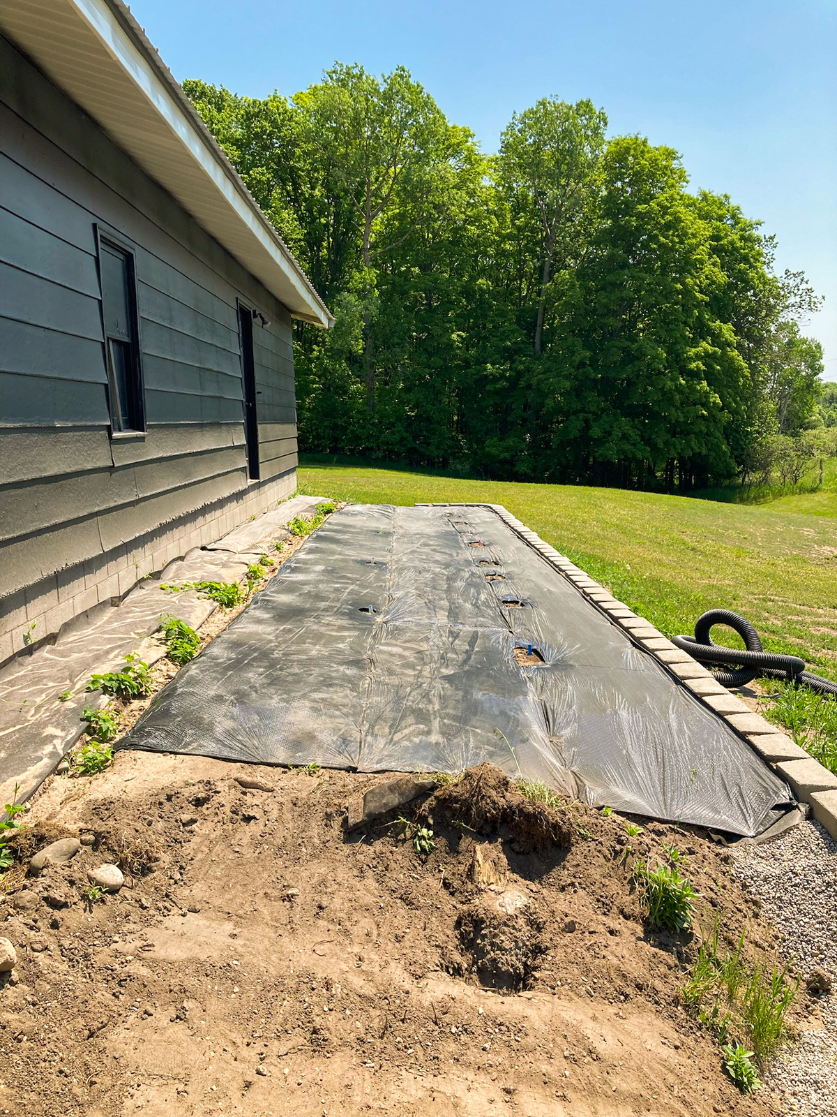 We grew hops at our house in Waterford and brought some with us to transplant. The best place to grow these is on the south side of the garage. So we decided to install a retaining wall to give us room to plant at least three rows of hops. It will take years for these to get established. We began by prepping the site.