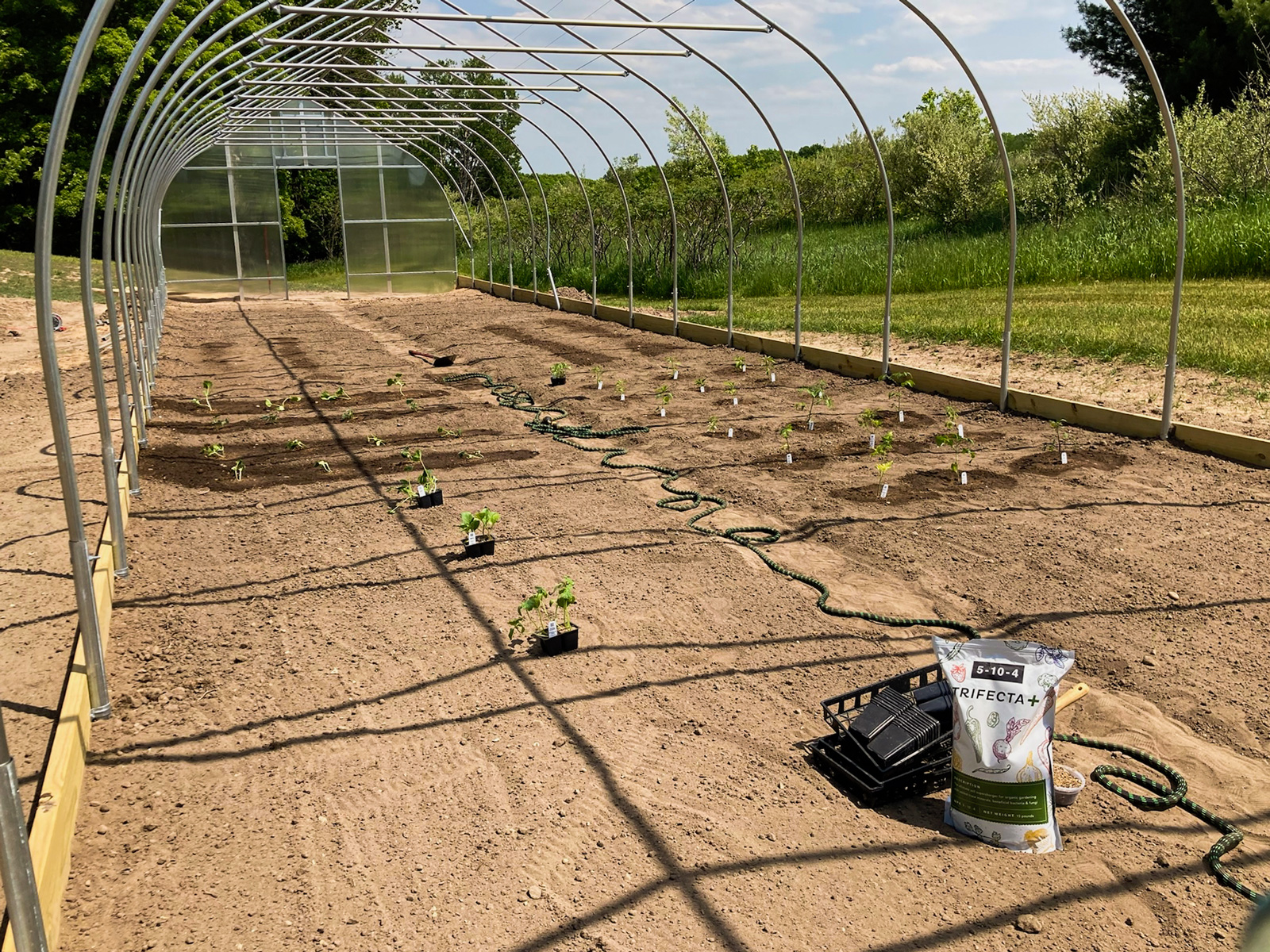 Our goal was to have the greenhouse install finished no later than Memorial Day. Memorial Day came and went and this thing was taking way too long for a ″kit″. We had purchased plants from Bear Creek Organic Farm in Petoskey and have been keeping them ready and waiting for planting, but they were starting to get too big for their containers. I planted some of them up by the house (see the July blog). I planted the rest of them a couple weeks later in the greenhouse area. Hopefully they will not get too much sun/heat with our unseasonably warm temps. And hopefully they will not get damaged when the plastic roof is eventually added overhead.