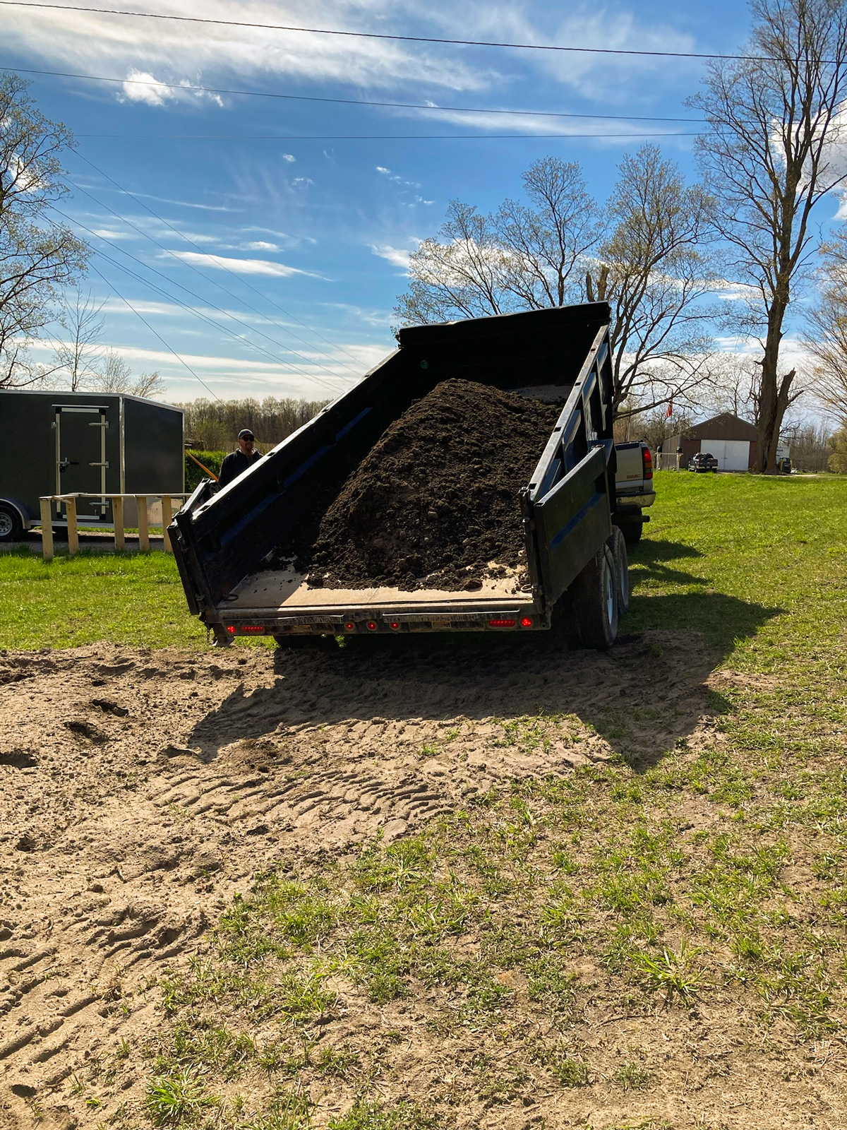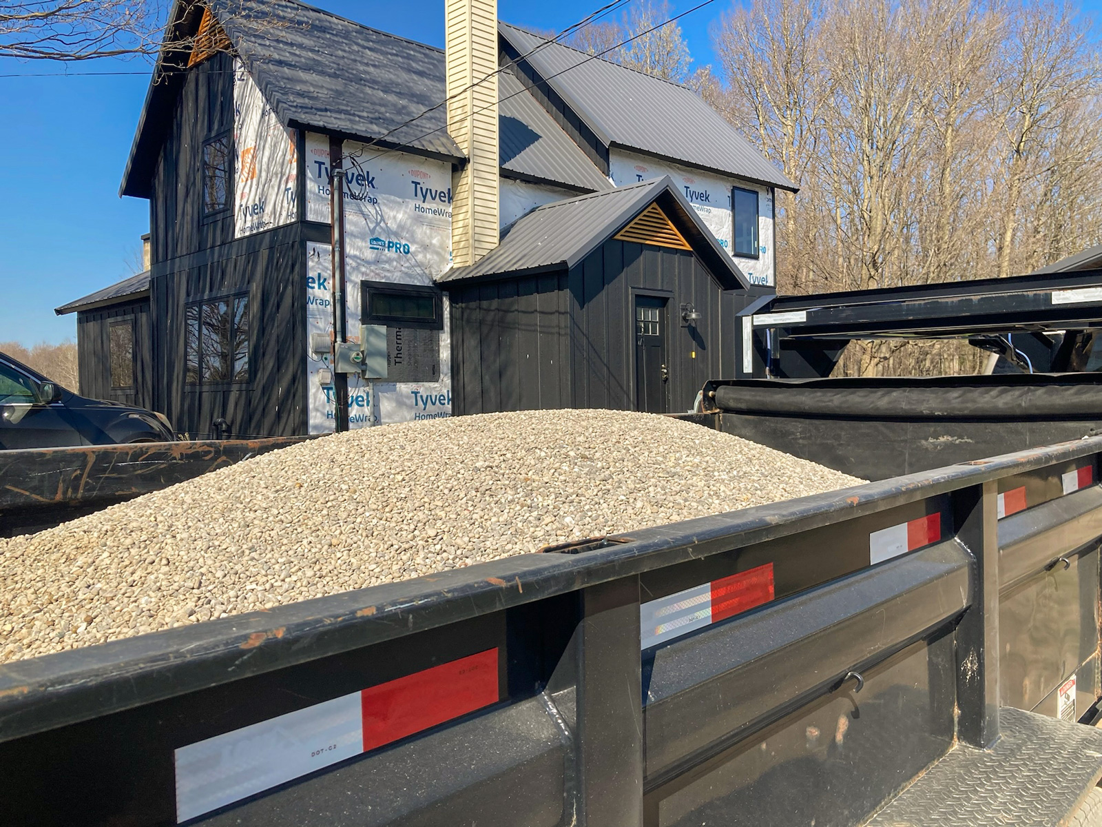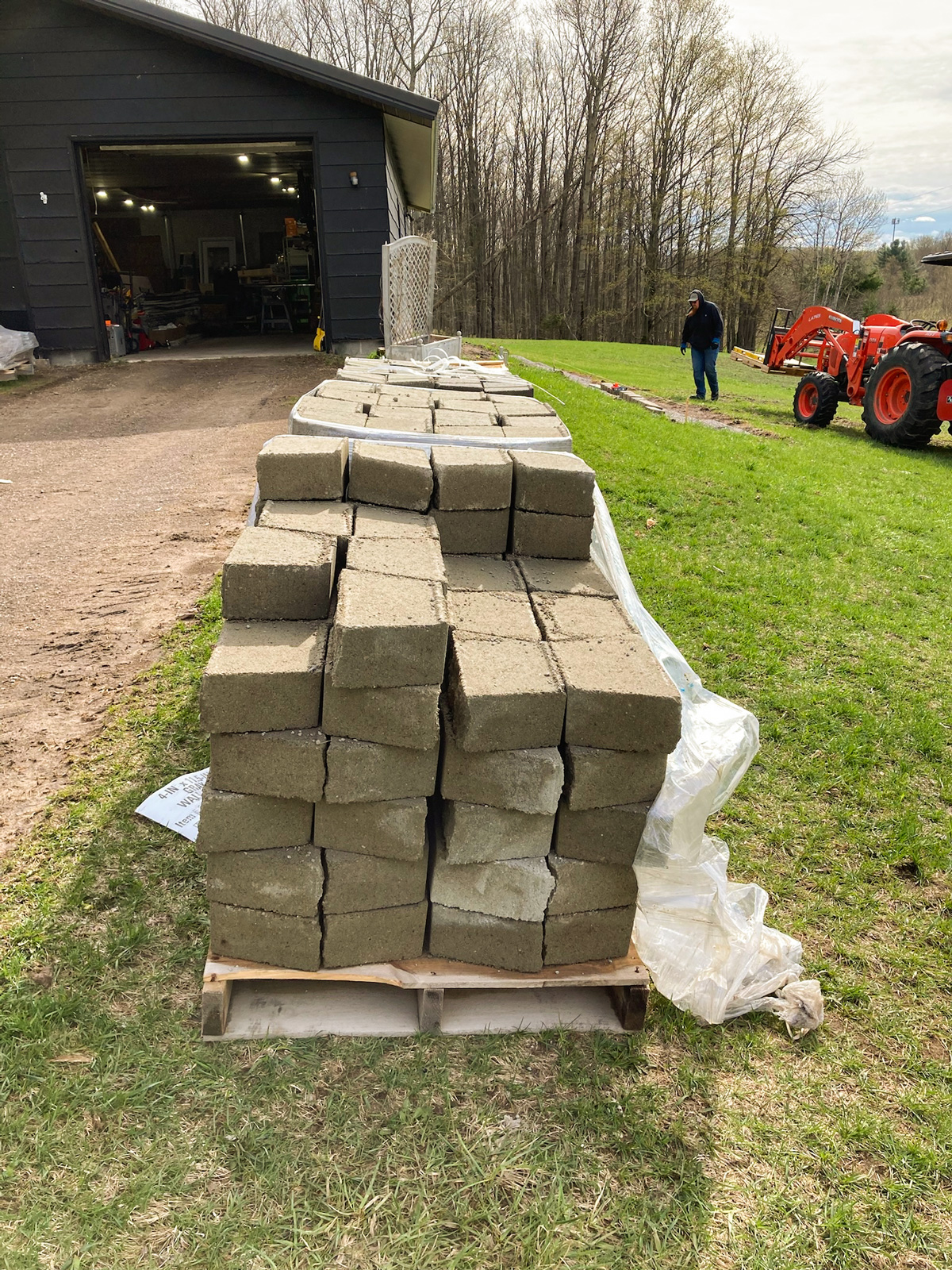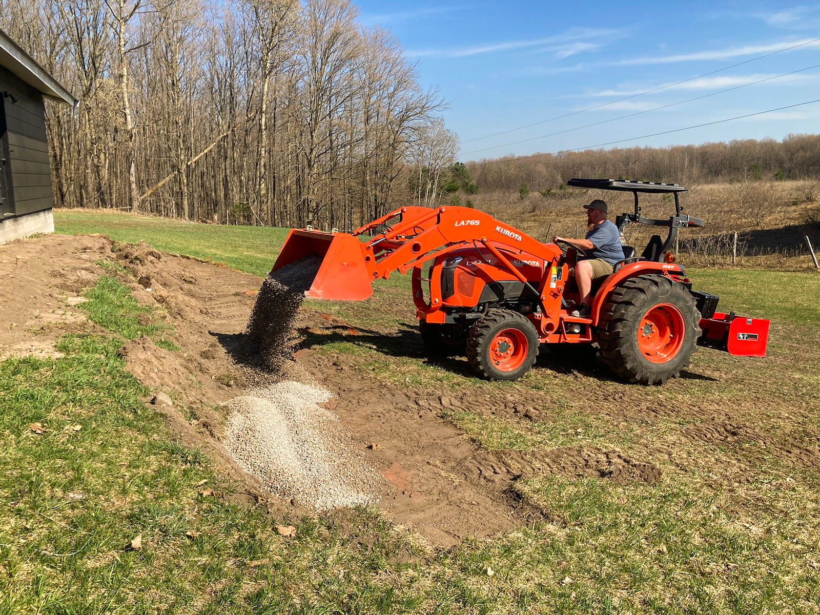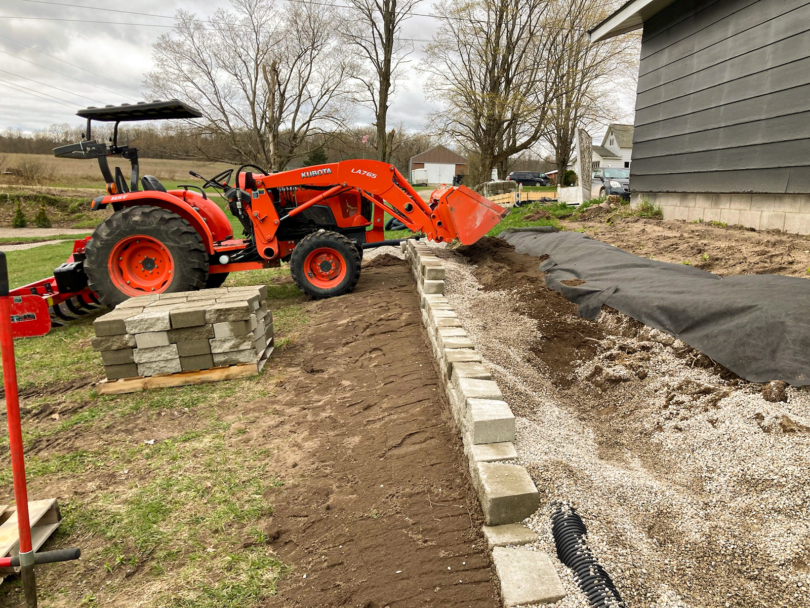 We picked up a load of pea gravel for the base of the retaining blocks and for drainage. Andy worked on prepping the site with his tractor. We had the retaining blocks delivered from Lowe's.