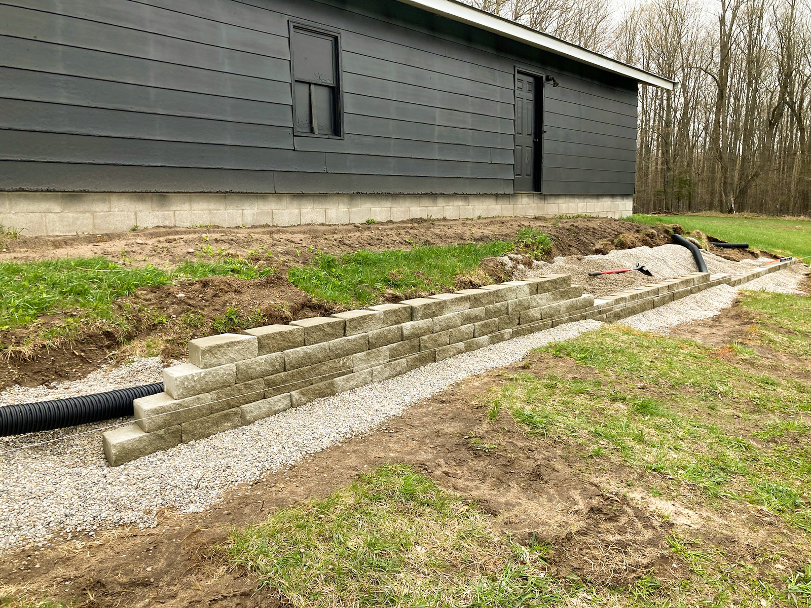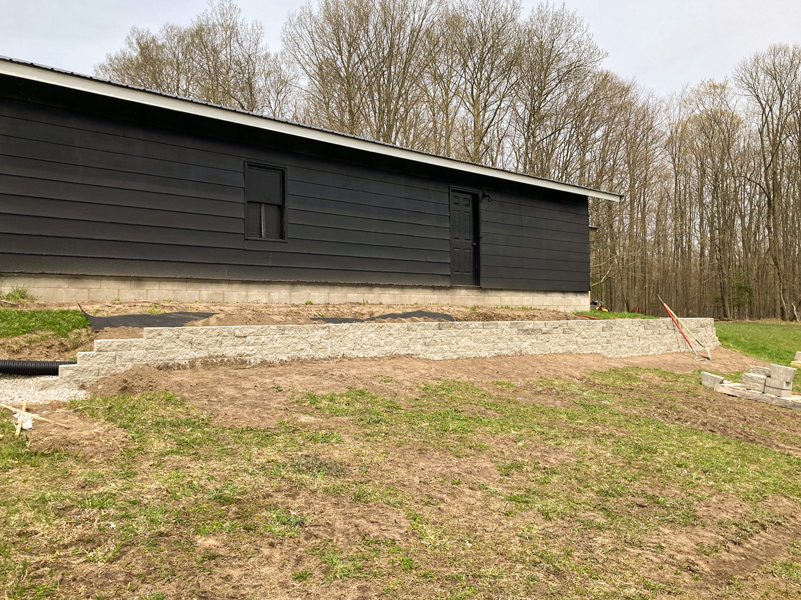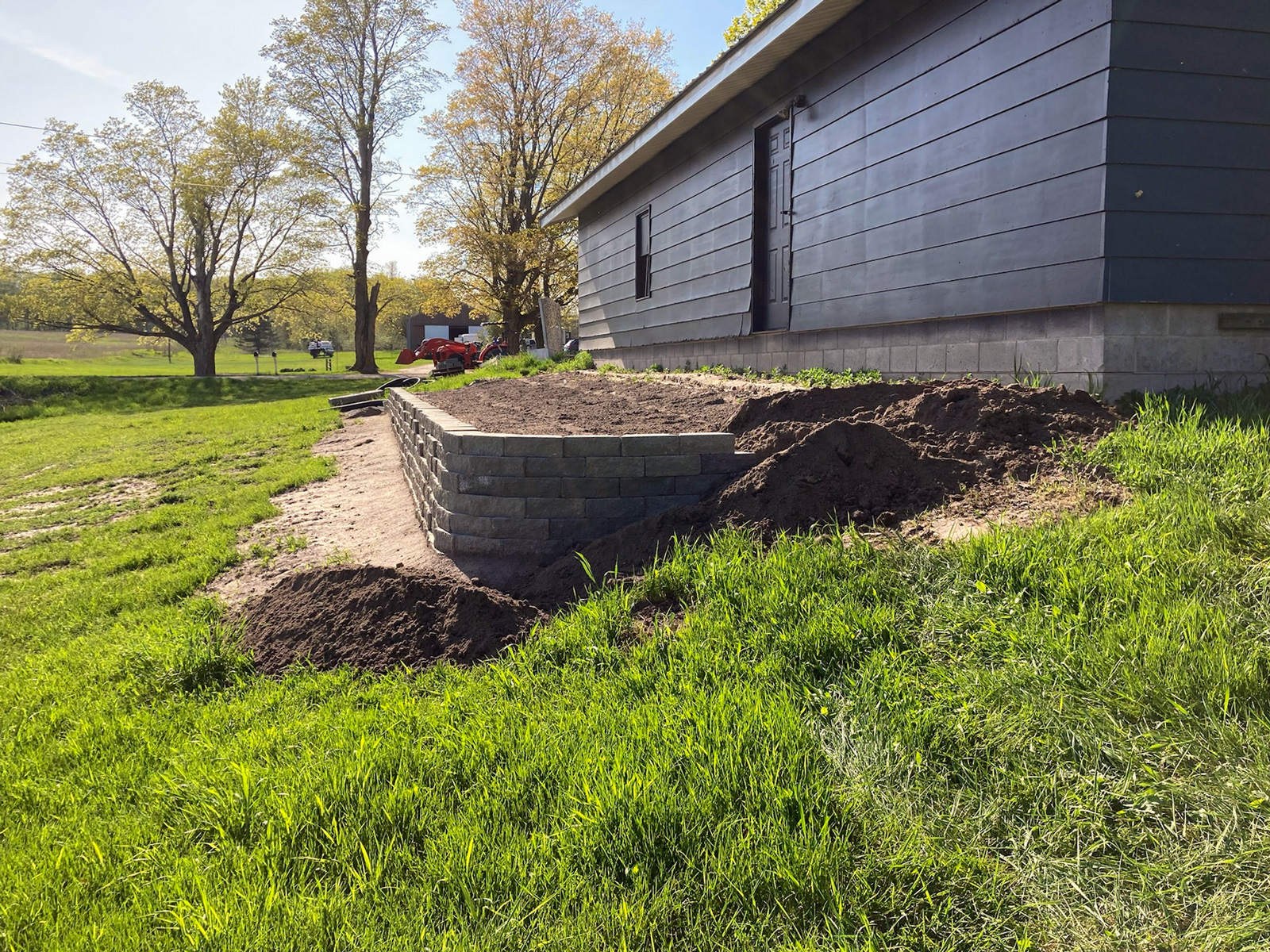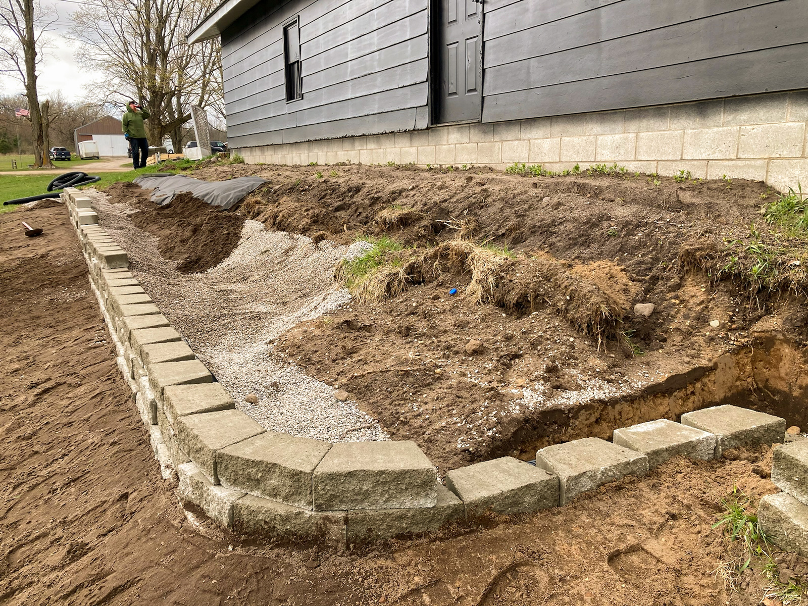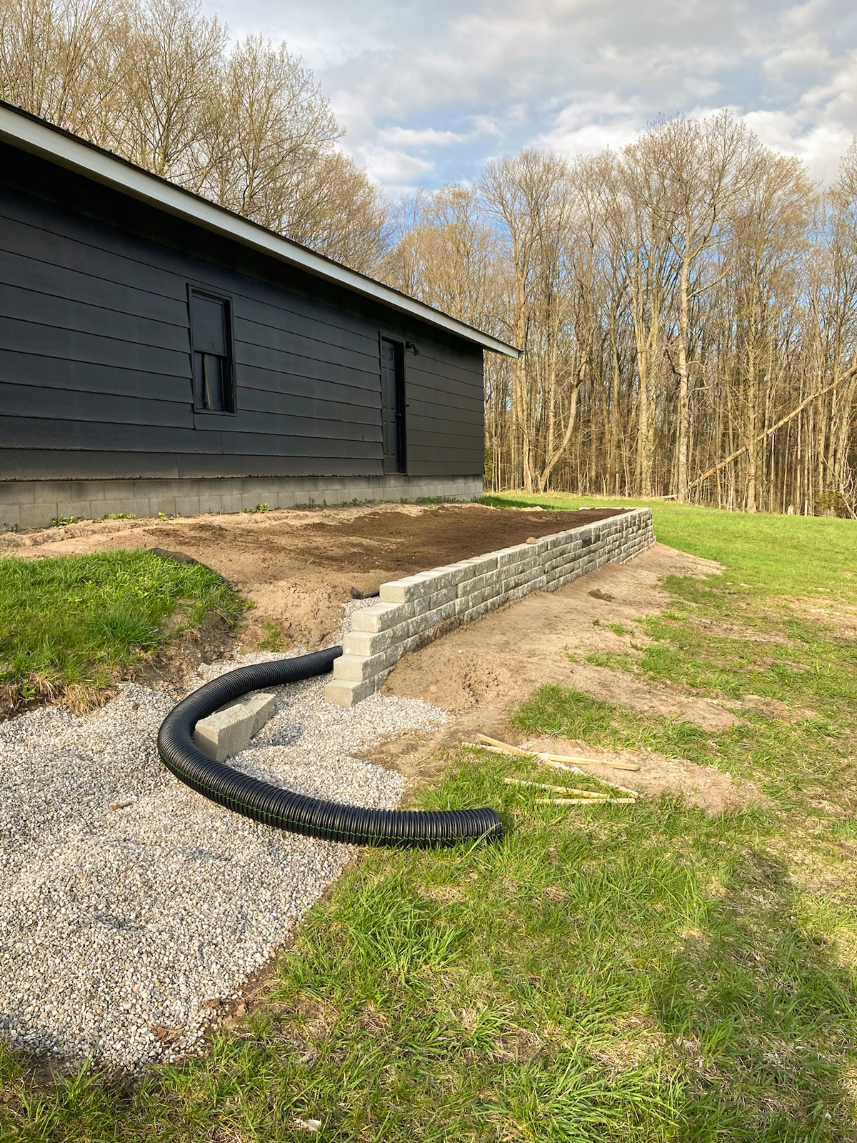 Andy worked on the first layer of blocks, leveling each. I added the next layers and back-filled with pea gravel and drain tile.