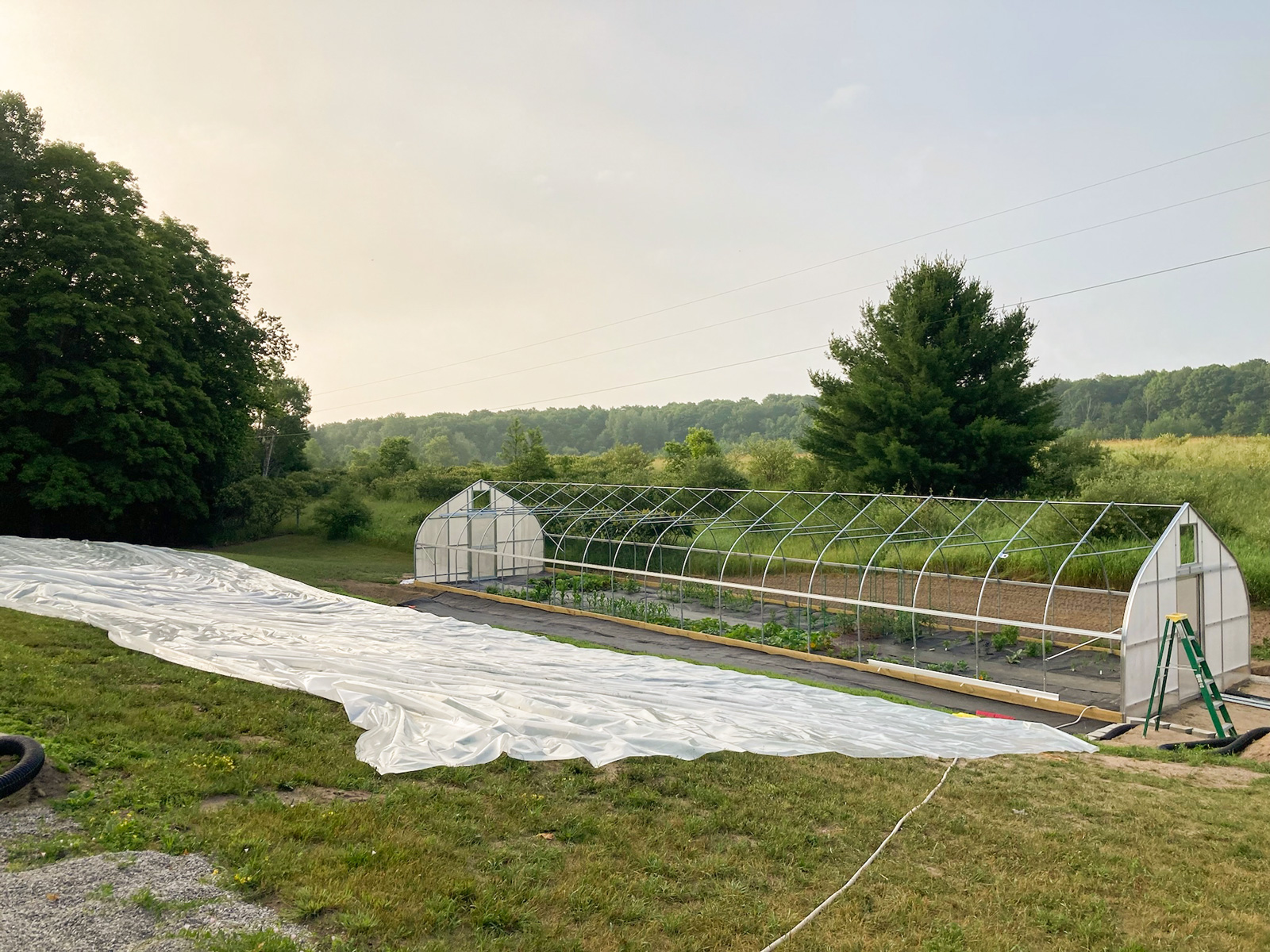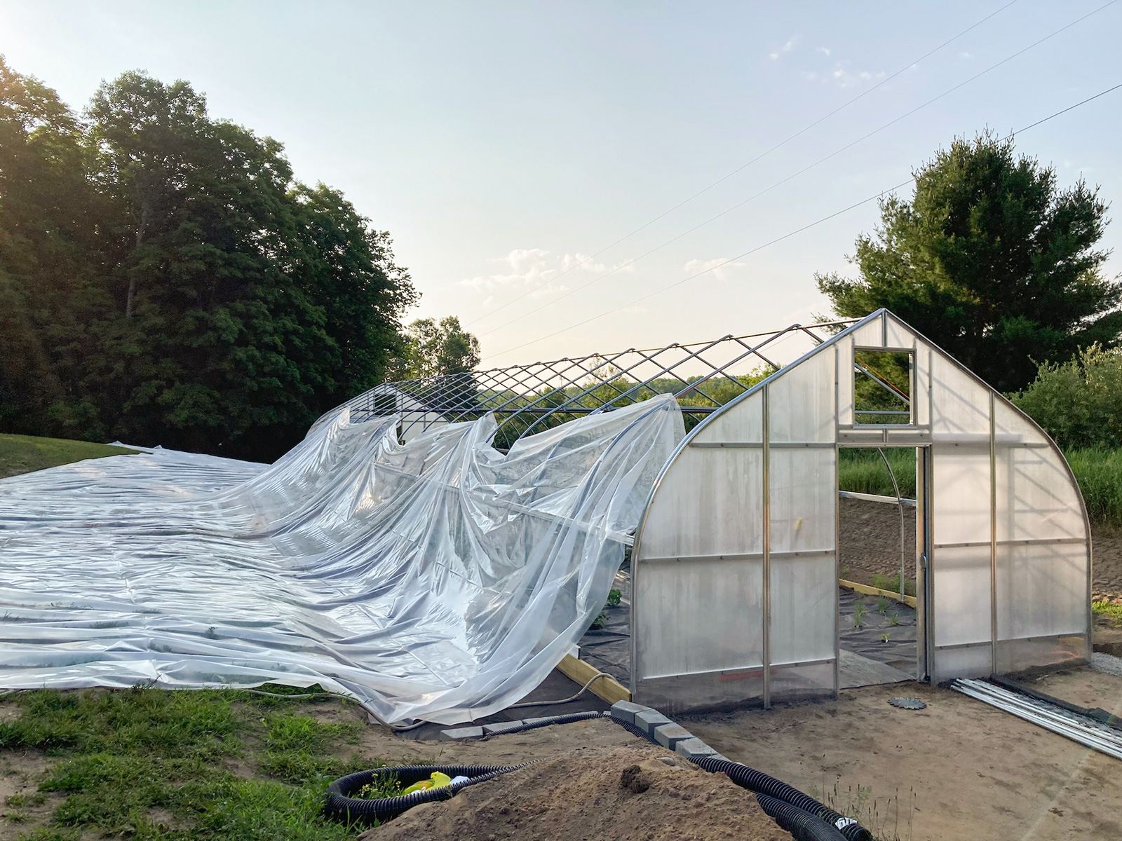 Unfortunately, we had a couple of tears in the second layer. But, at least it's up! We will wait to put on the roll up sides, fans, and blower. We will need to run electrical down the hill from the garage. Hopefully we will get to that in early fall.