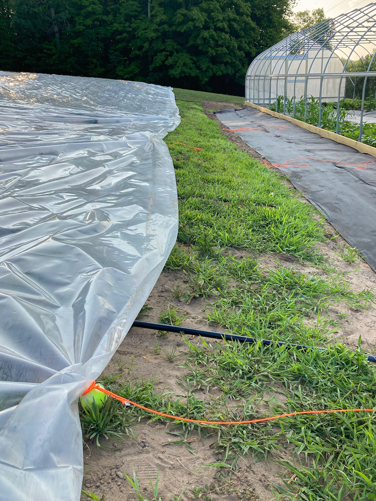 It was the day before Independence Day and we finally had a day without wind to put the roof on the greenhouse. Again, this was not an easy task with the kit. It came as one long piece of plastic that is to be used for two layers of roofing and two roll up sides. To get it over the framing, you tie tennis balls to the plastic and pull it over to the other side with string (para-cord).