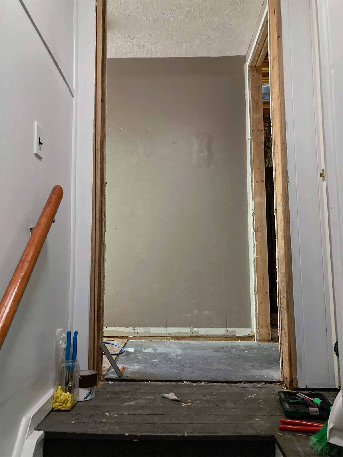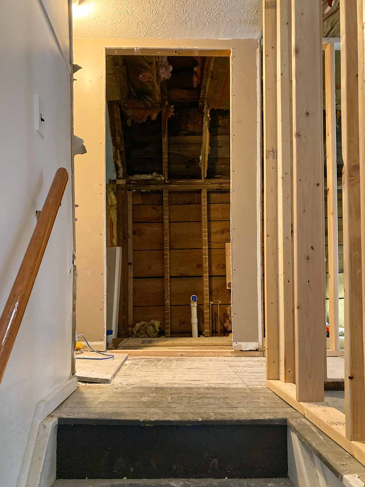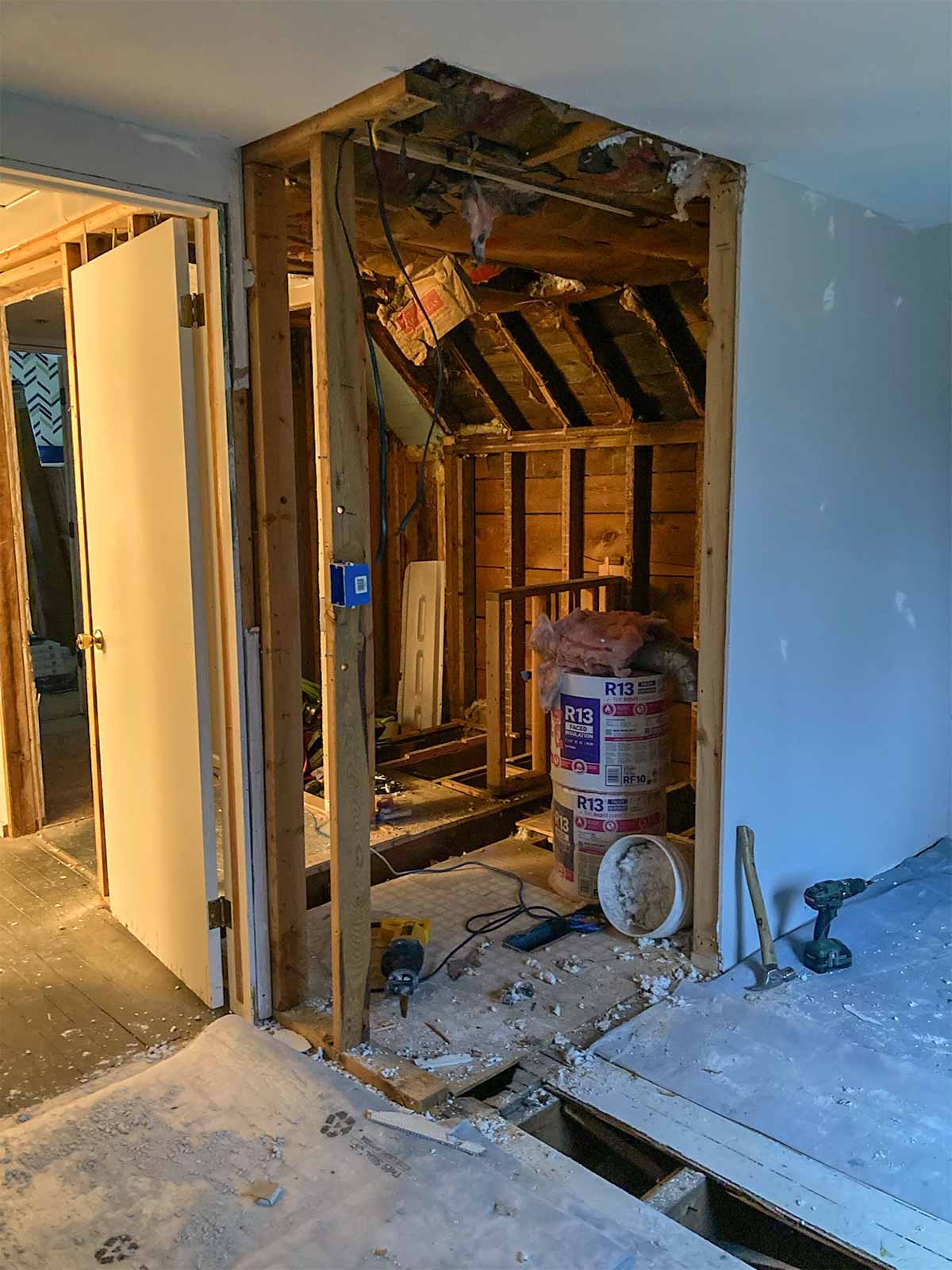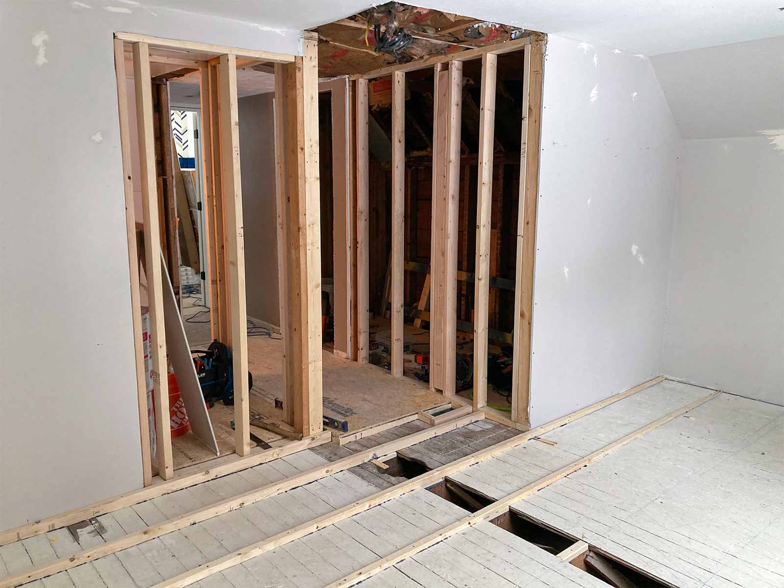 New bathroom entrance is cut open and framing begins.