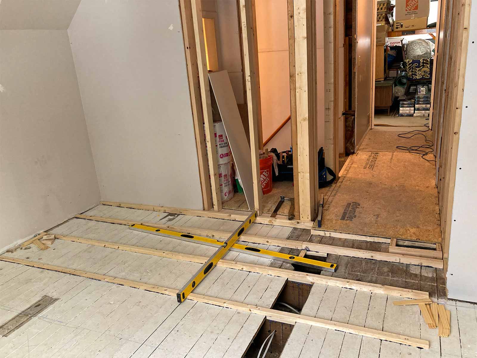 Since the floor in the guest room was already very much out of level (it made me sea sick), we decided it was best to match the floor height of the new construction and completely level the entire second floor, beginning at the ramp.
