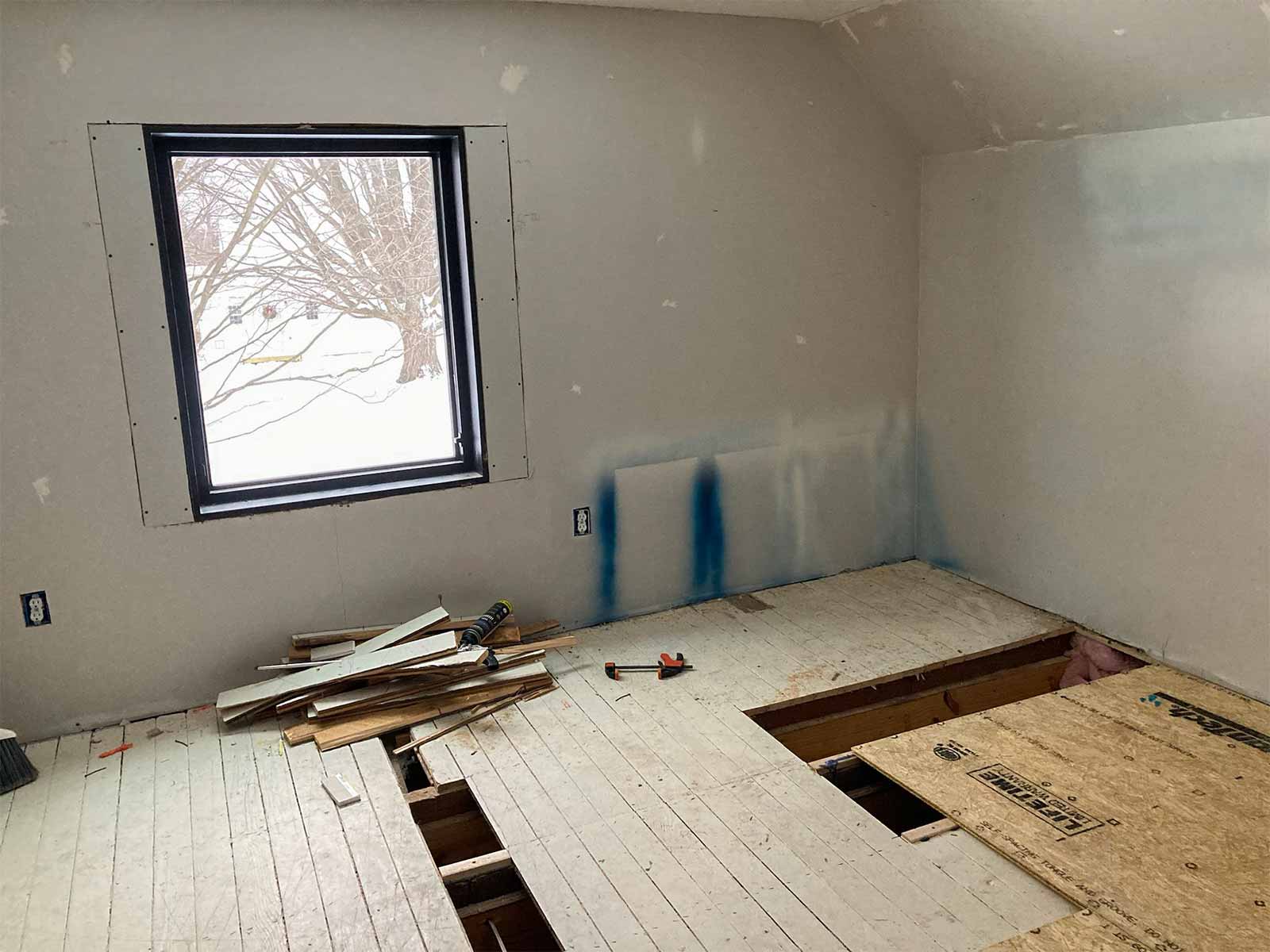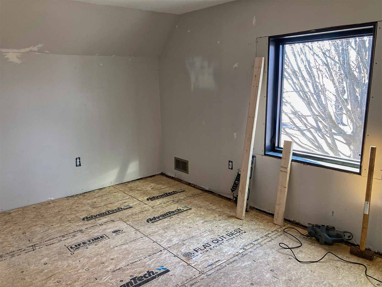 The guest bedroom floor turned out to be so bad that it will still end up being higher than the hallway floor, just to get it level. We will have to work some magic with a transition strip when we install the flooring.
