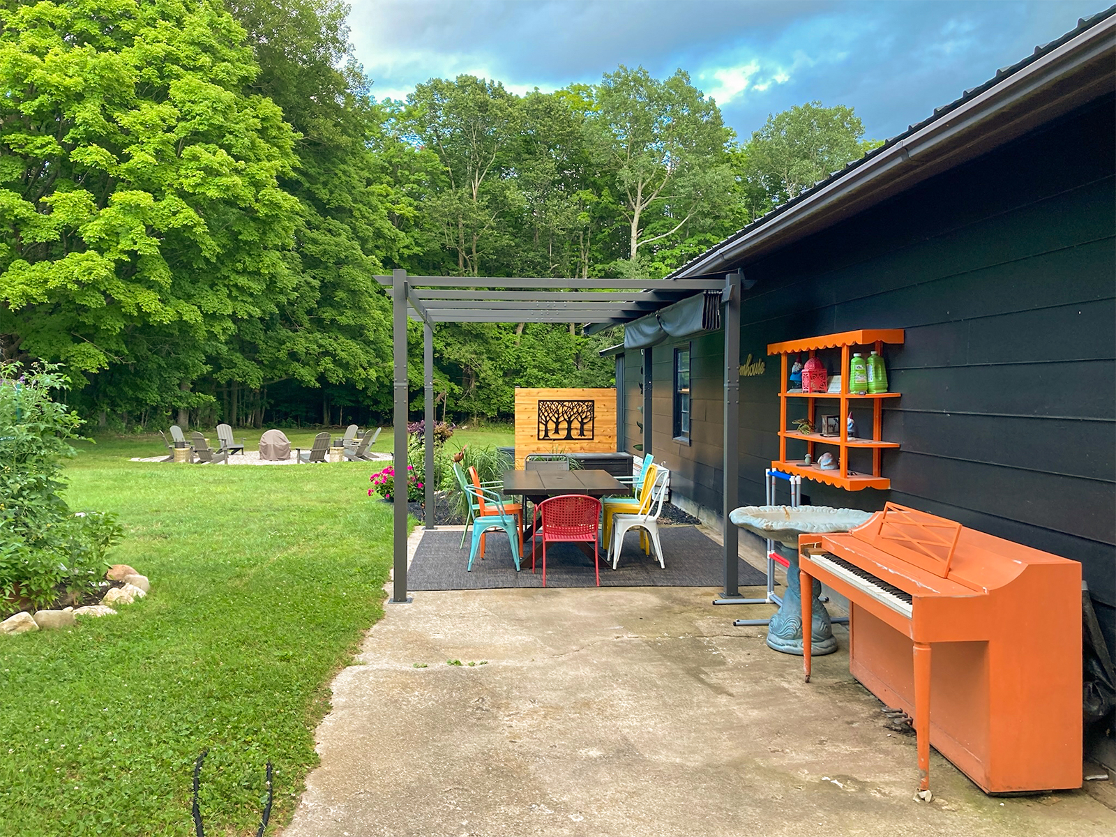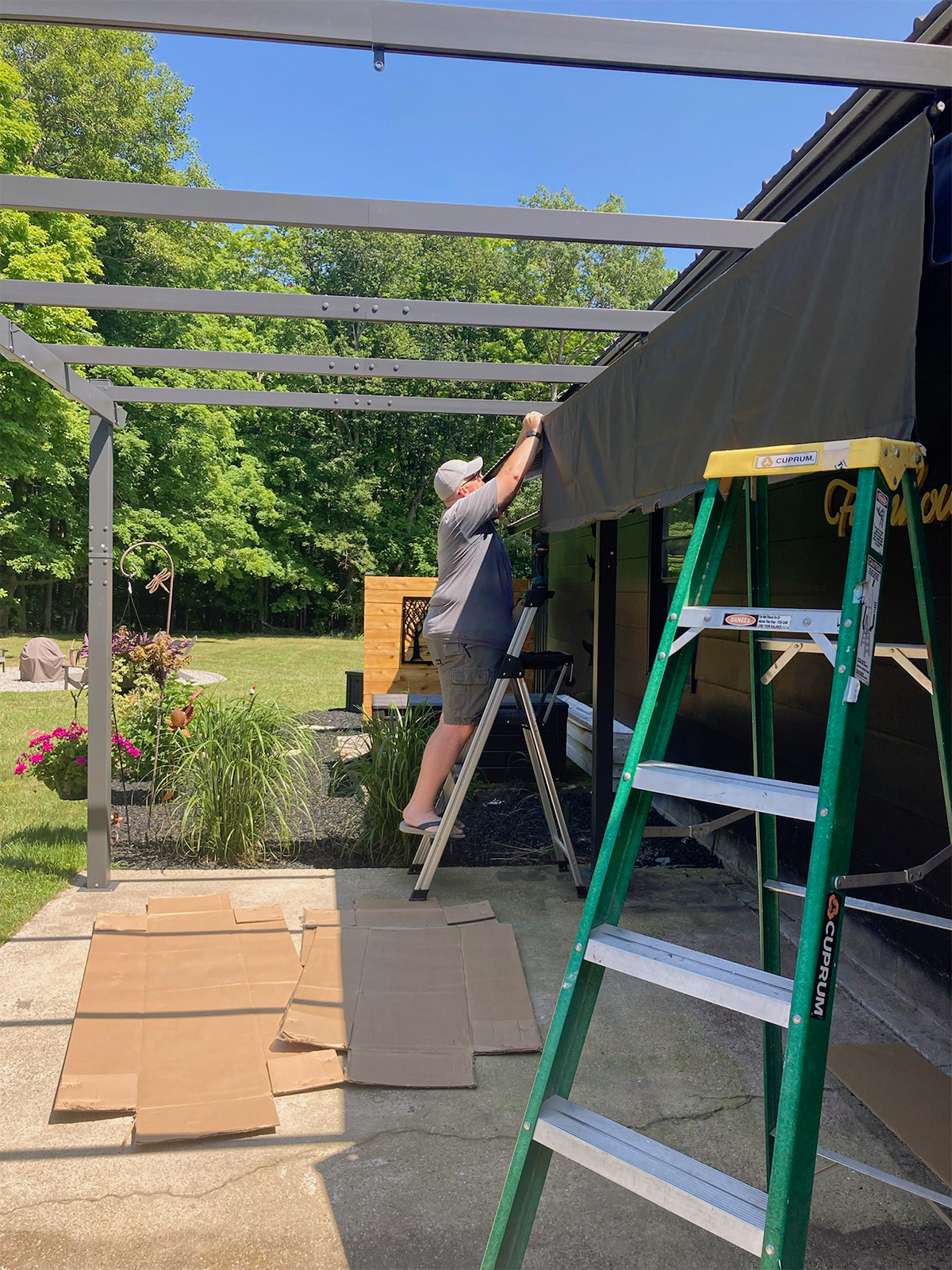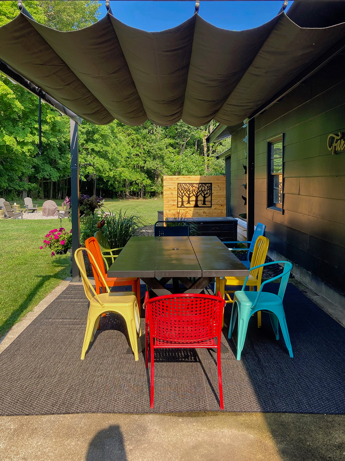 We purchased a pergola from Wayfair, and repainted the table and chairs for a usable outdoor dining space sheltered from the sun.