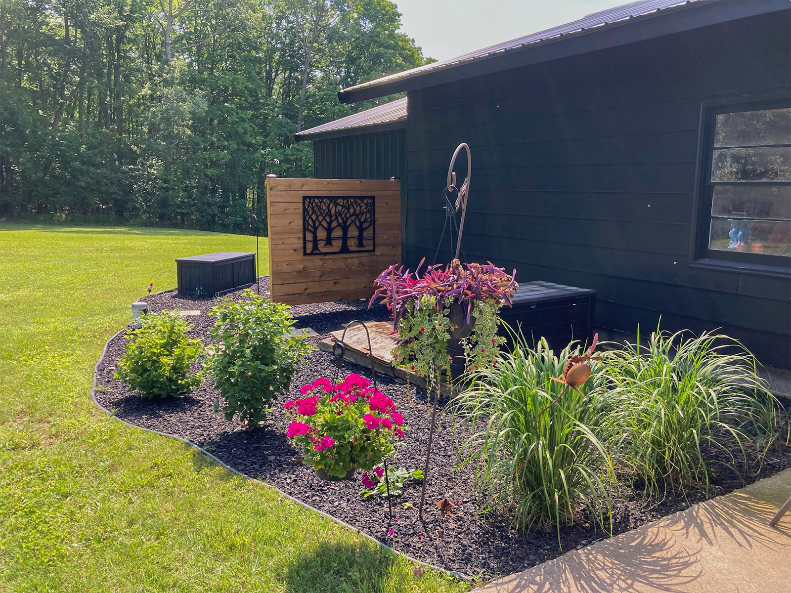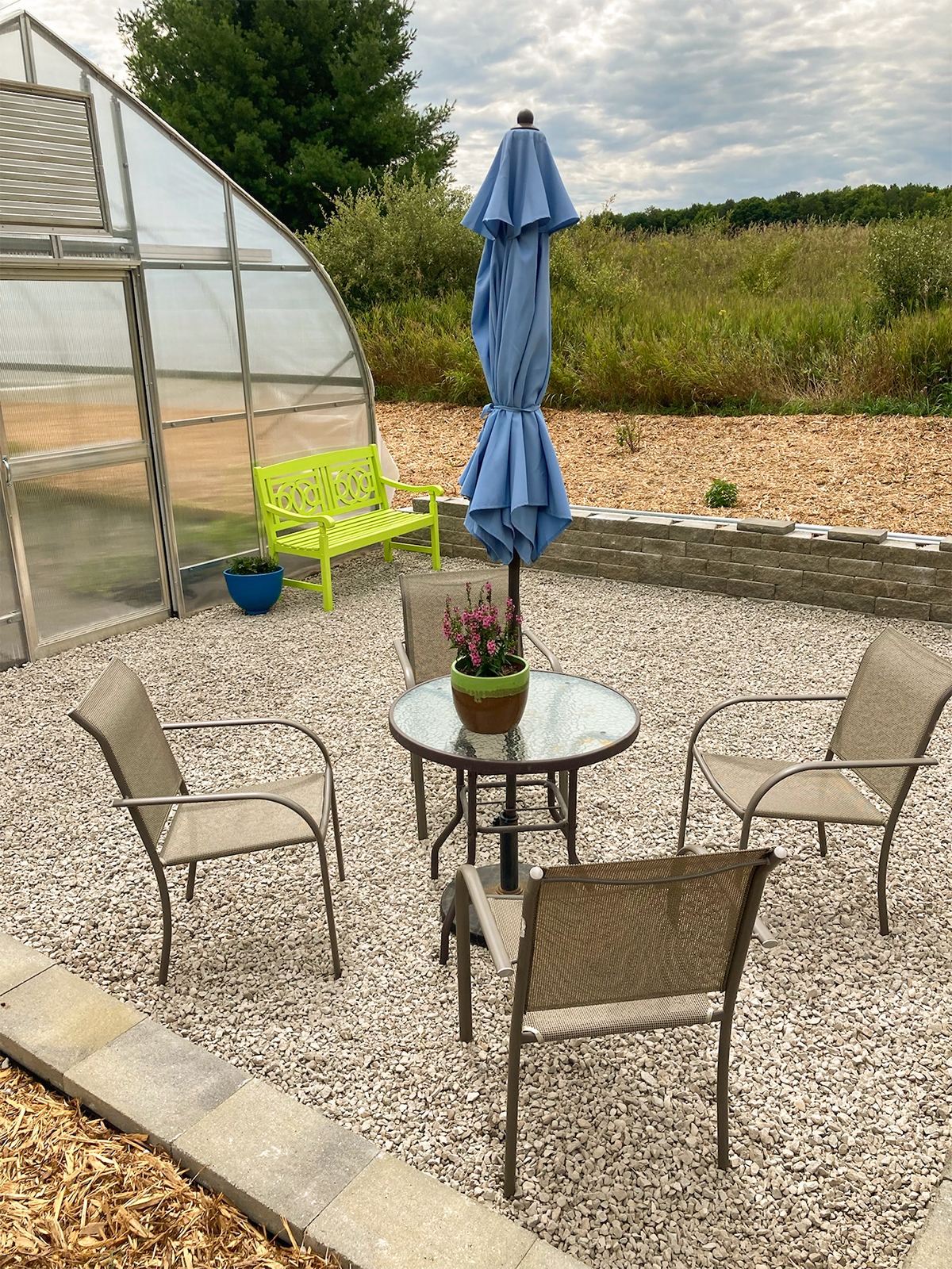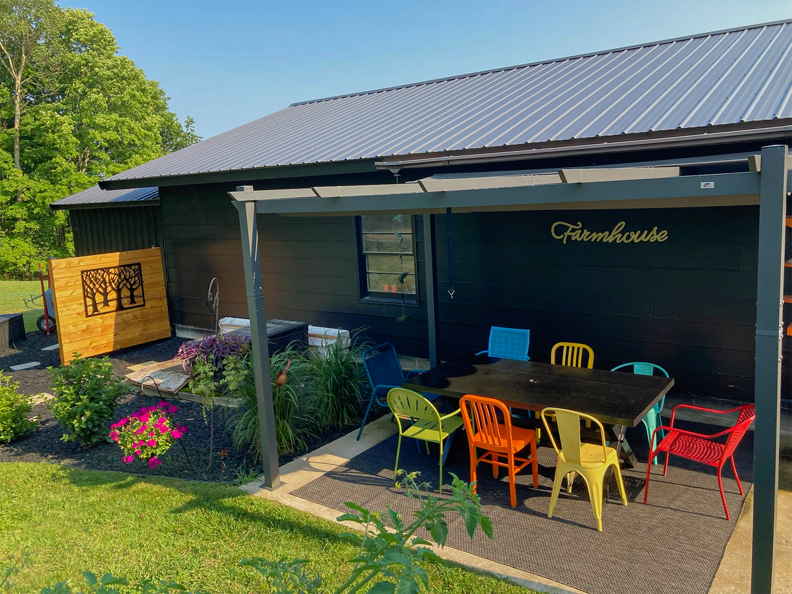 We purchased a pergola from Wayfair, and repainted the table and chairs for a usable outdoor dining space sheltered from the sun.