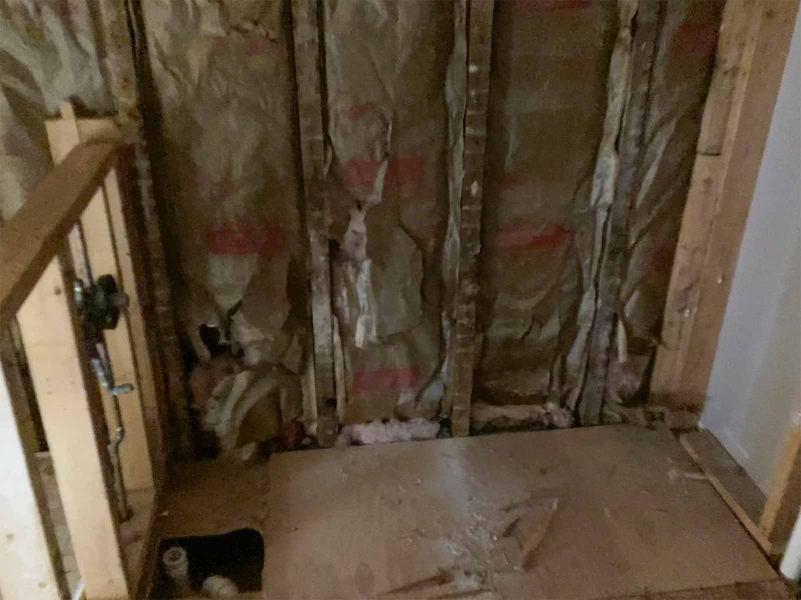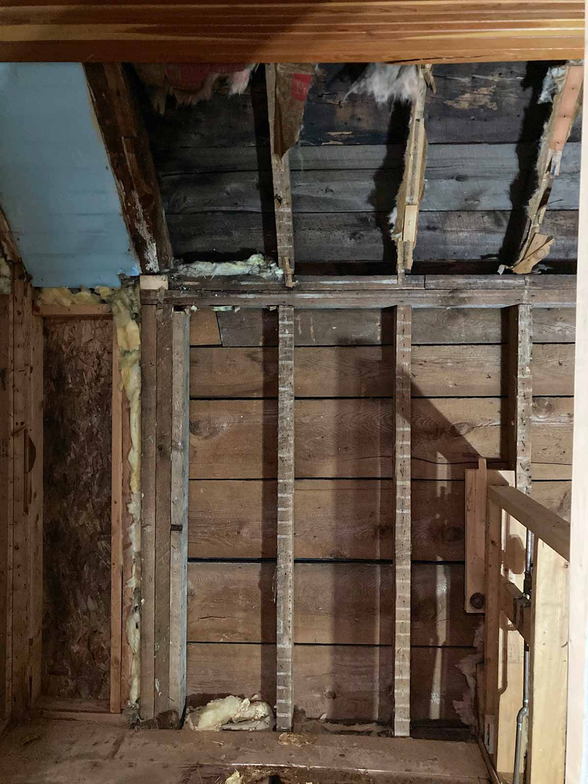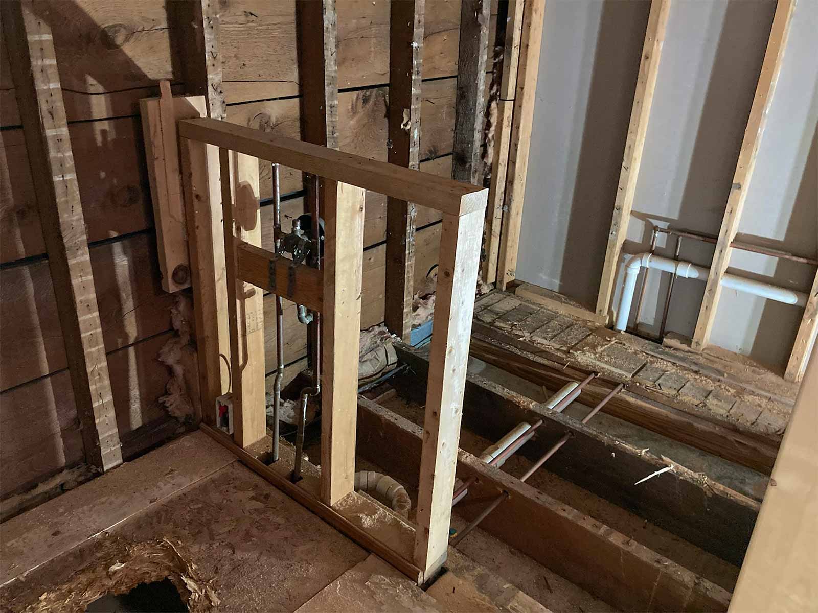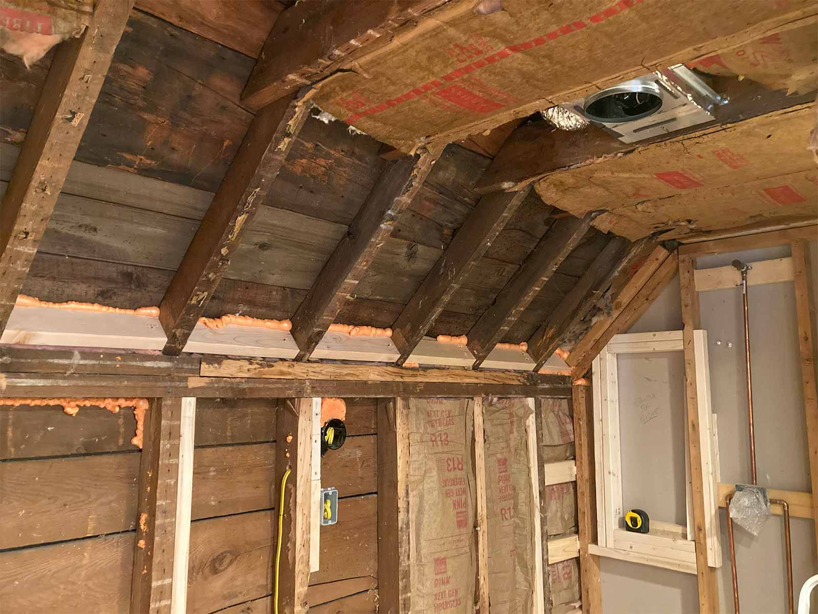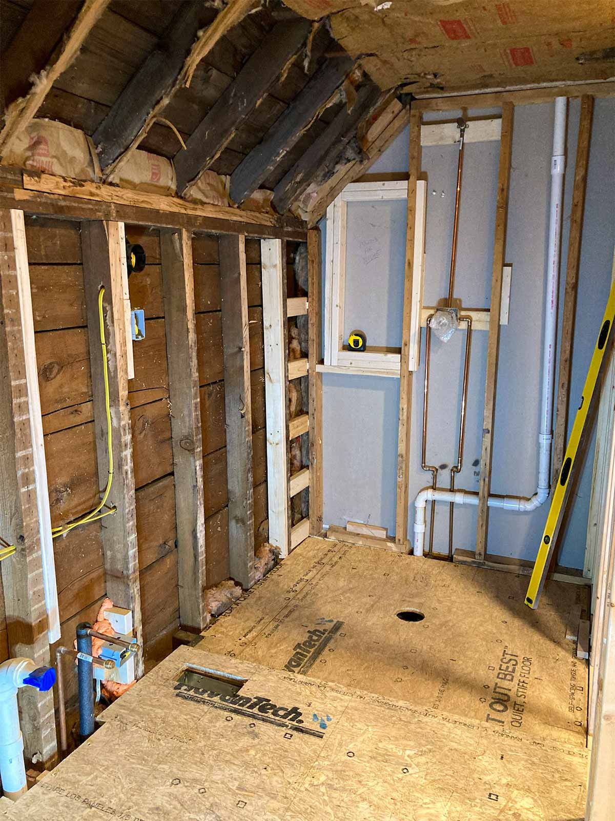 We began by getting rid of the old sink and tub, and all the wood tongue and groove. Last, was the removal of the toilet. We had fun throwing the materials out the bedroom window. We also removed all the old insulation (mostly water damaged).