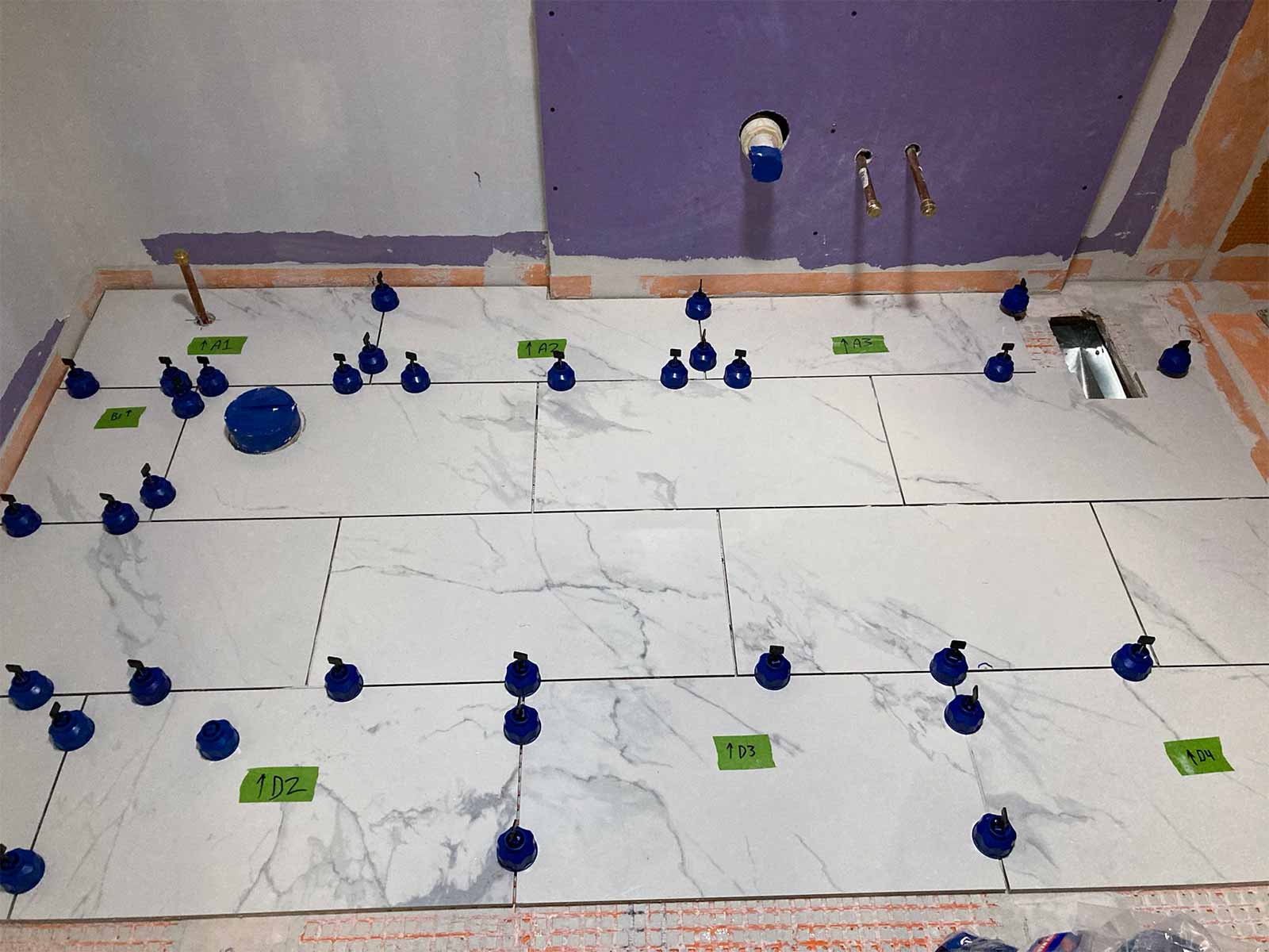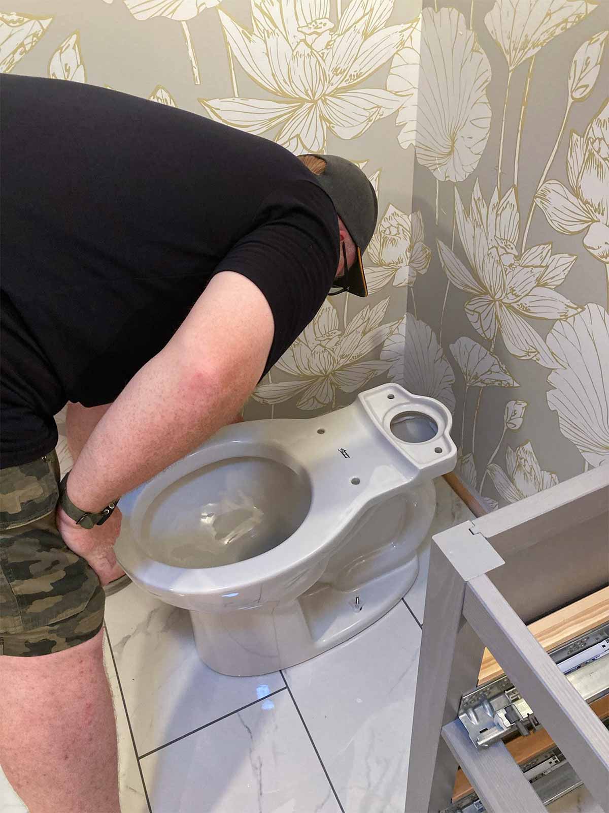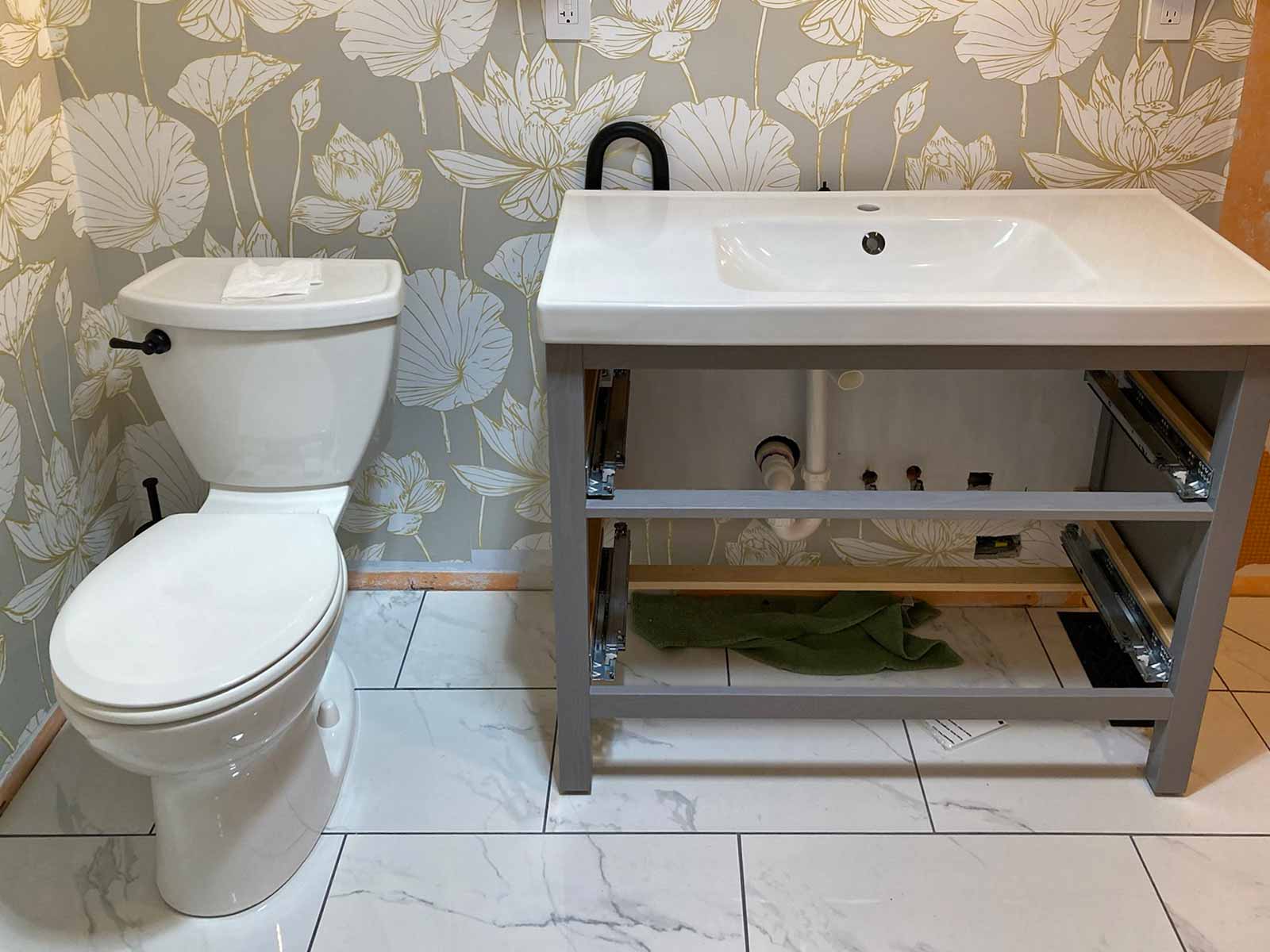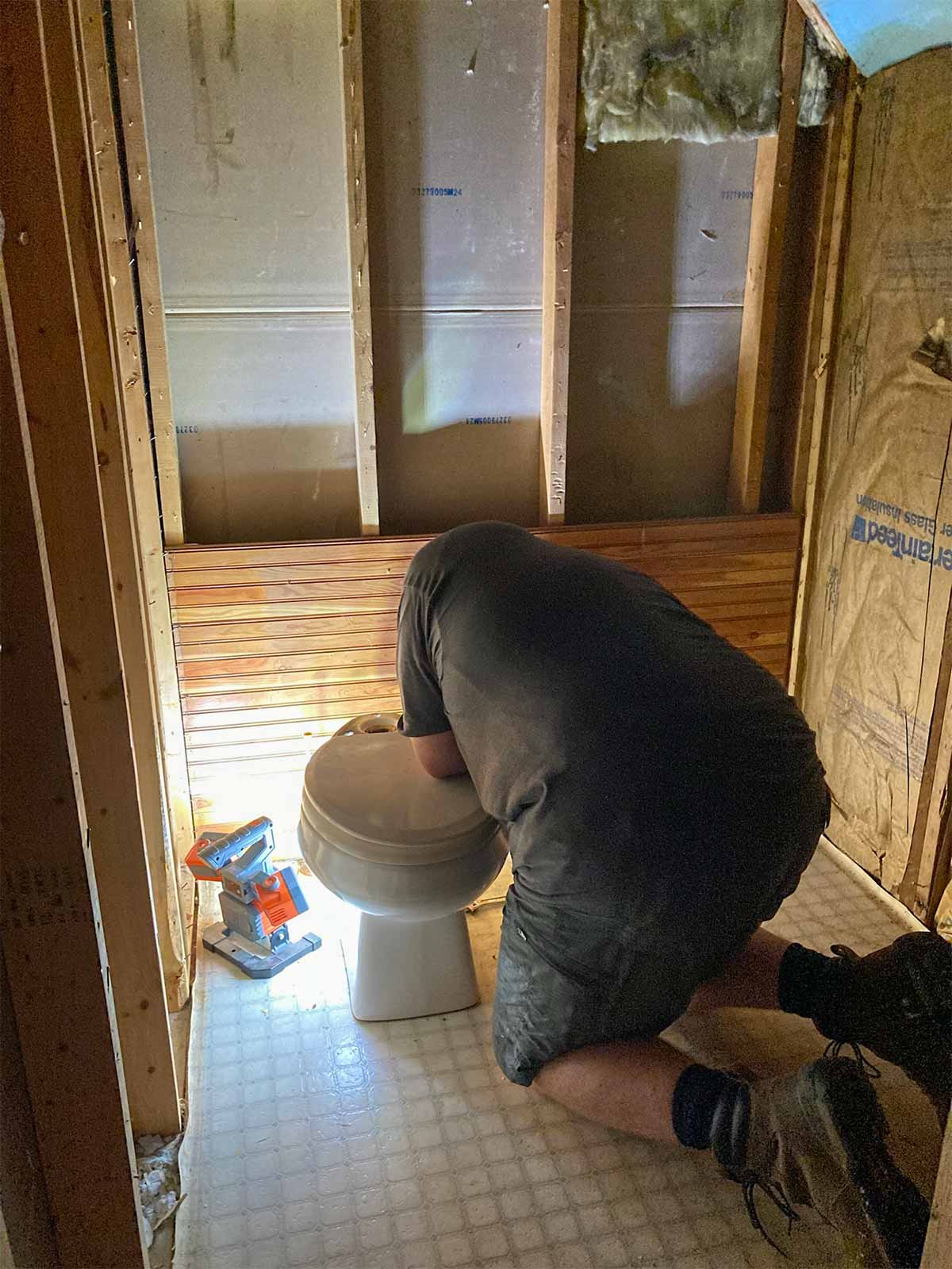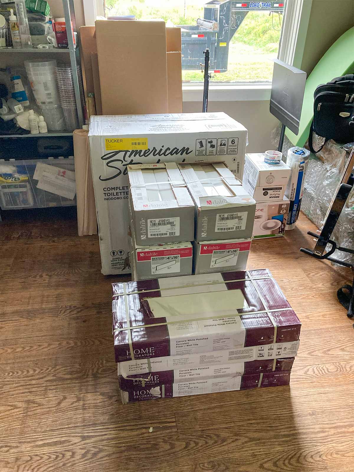 We placed an order with The Home Depot for tile, toilet, exhaust fan, and Schluter system products for tiling/waterproofing. We called a plumber to have the pipes relocated.