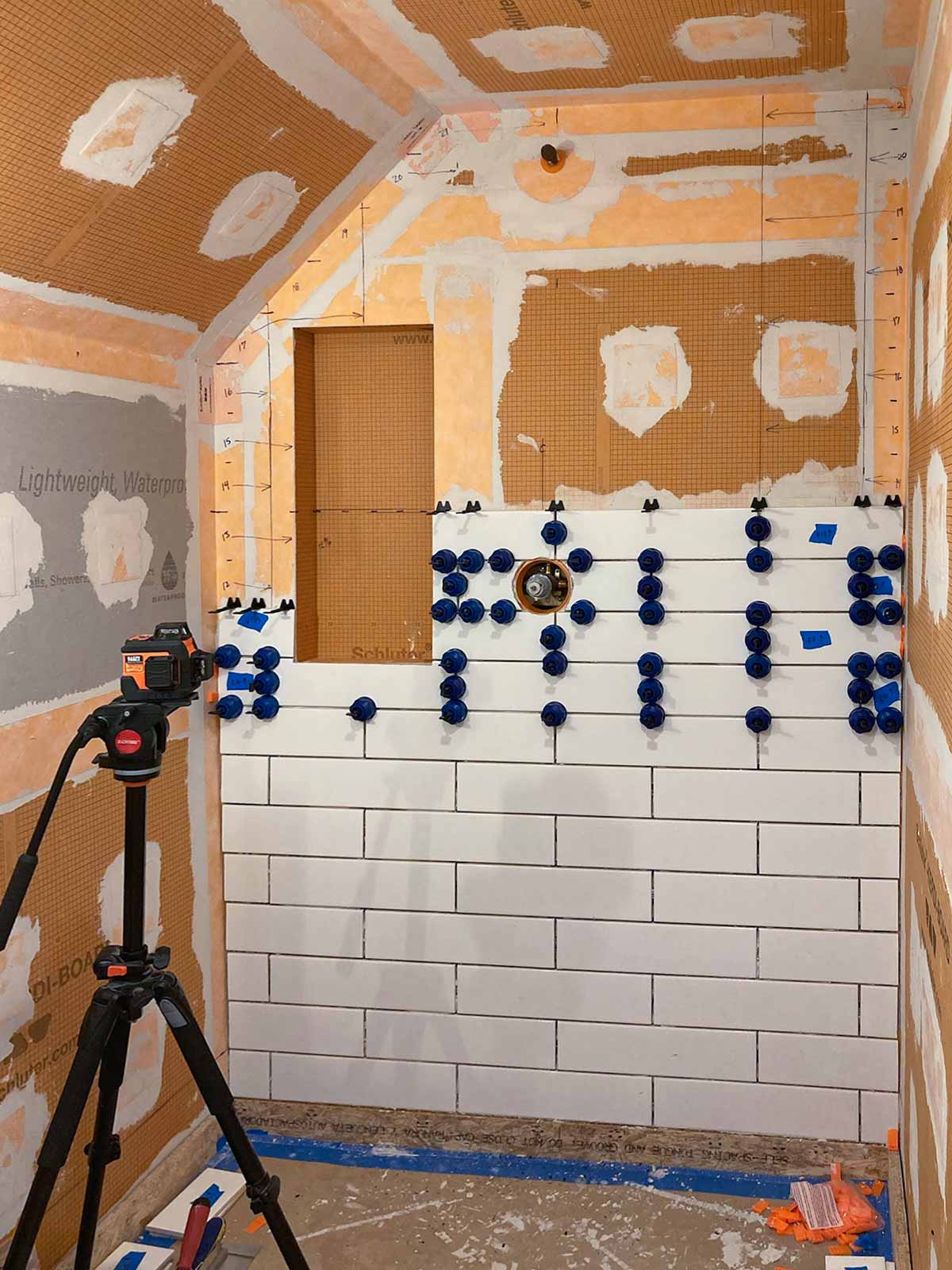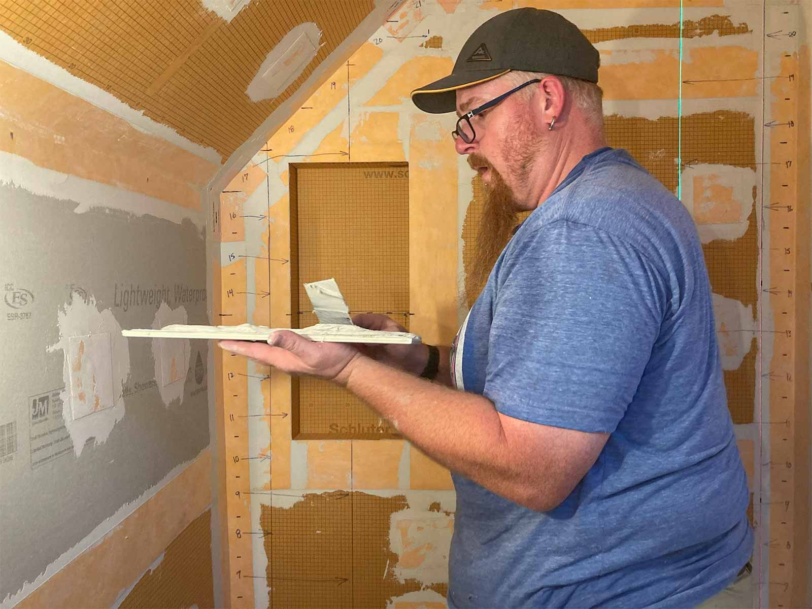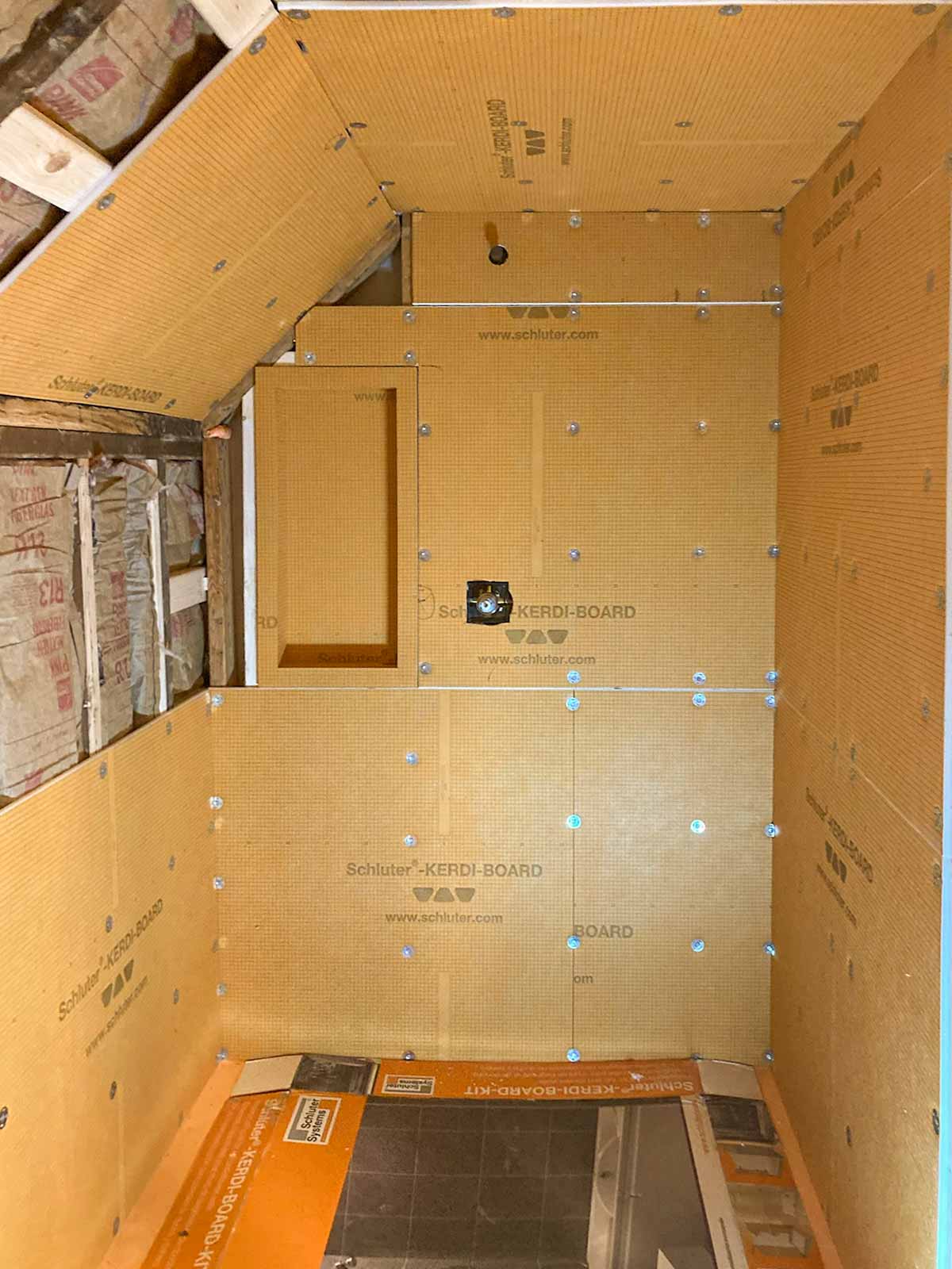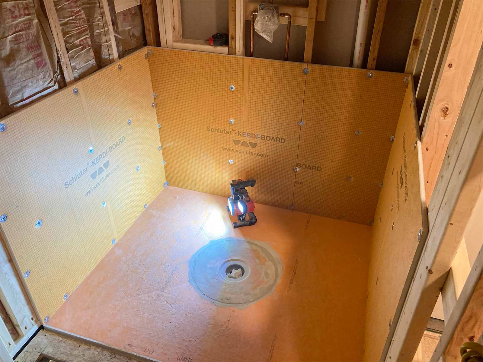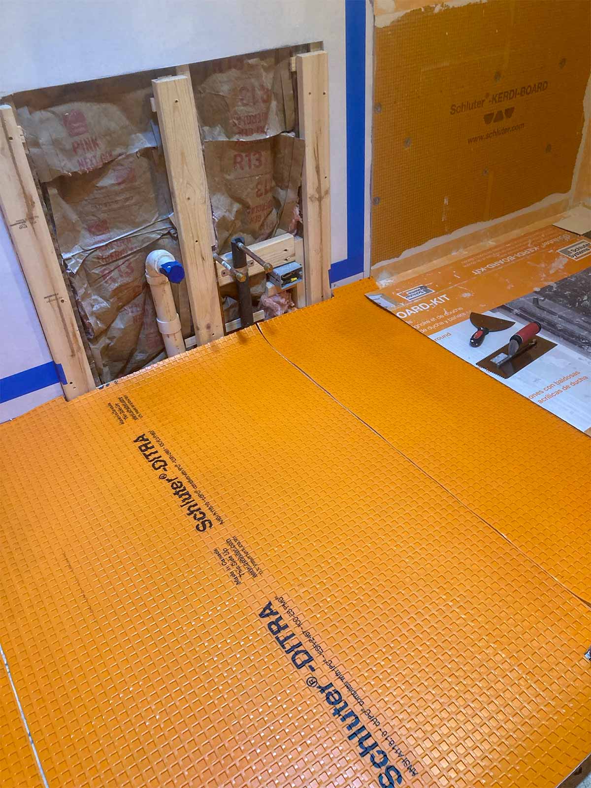 Anyone who has installed a new bathroom in the past two decades or so probably has used the Schluter waterproofing products. This was our first experience, but we've seen it done on YouTube many times. Thanks to David Blumke at MI North Flooring in Alanson for filling in the gaps in the materials we had previously purchased.