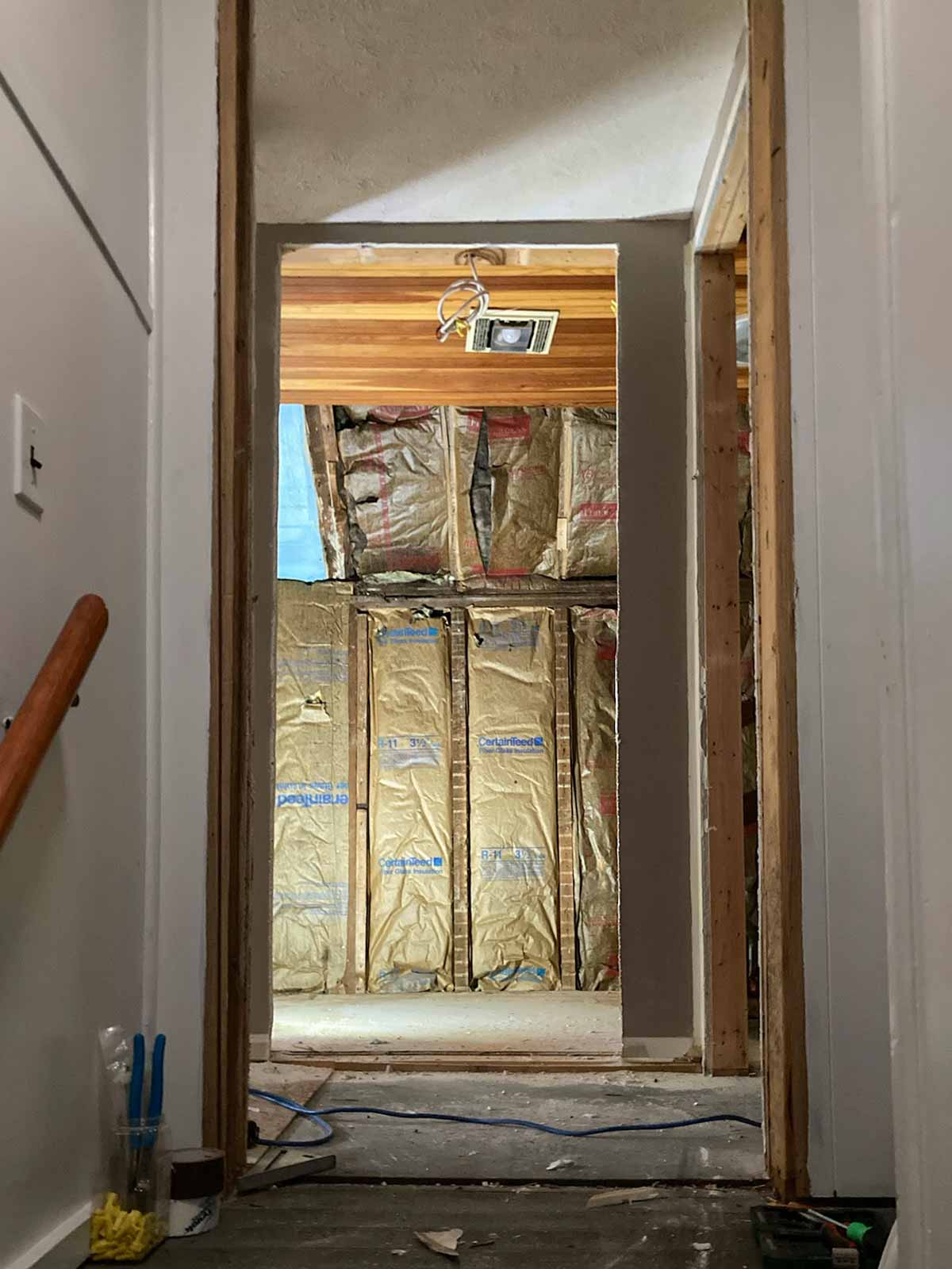 As we saw in the February 2024 blog (#10 Upstairs Begins), we added an entrance into the guest bedroom where the sink used to be located. We added a wall to make the bathroom space a rectangle, instead of an L-shape, and changed the entrance into the bathroom, to be in line with the top of the stairs. The shower will be roughly where the tub was located. The vanity will be where the half wall was, against the exterior wall. The toilet will be moved against the exterior wall, next to the new vanity.