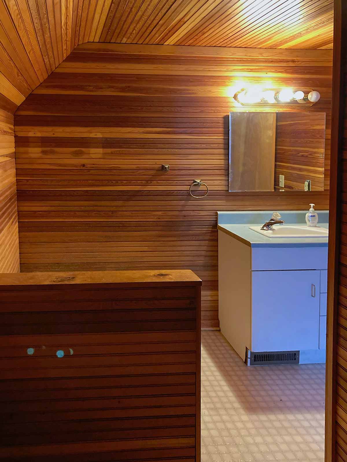 Yuck. That was the word to describe the bathroom. The layout was awful, a complete waste of space. The toilet was back in an area all by itself. Wood walls. A little sink. A tub without a shower. A complete gut job.