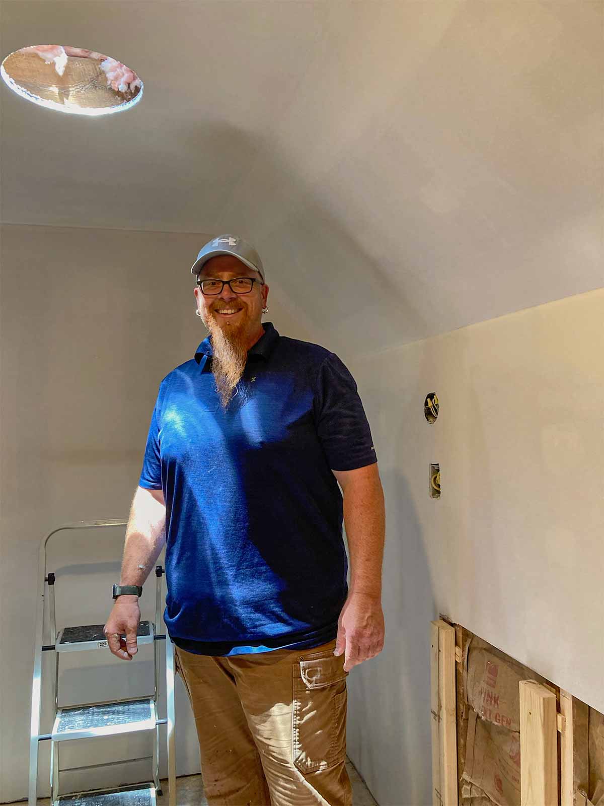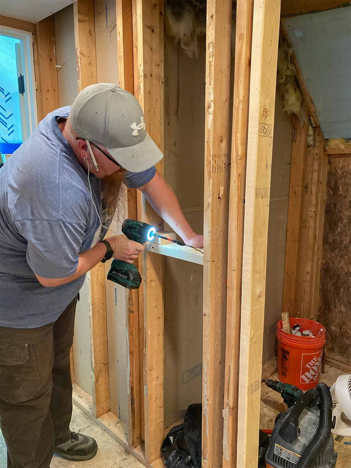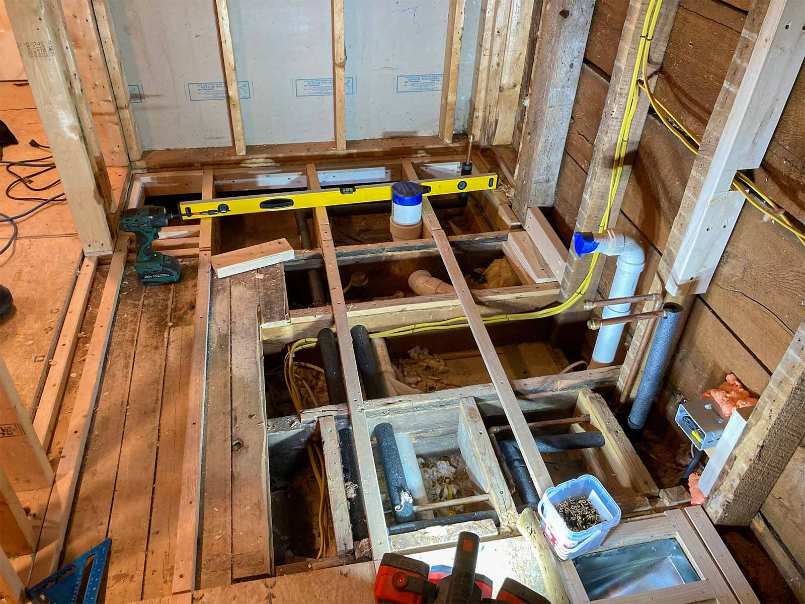 The floor leveling in the bathroom was not part of the February 2024 blog. That would be the first step in the bathroom. By having to raise the floor in the bathroom, this allowed us to be able to drop the shower pan in at the old floor height (roughly) so we would not need a curb into the shower area, creating one seamless tile floor into the shower. We were hoping to get away with just having a glass panel and no door into the shower, but because of where we had to have the shower head installed, that wouldn't work. Andy also added framing for the shower niche and blocking, where needed, and installed the bathroom fan/light.